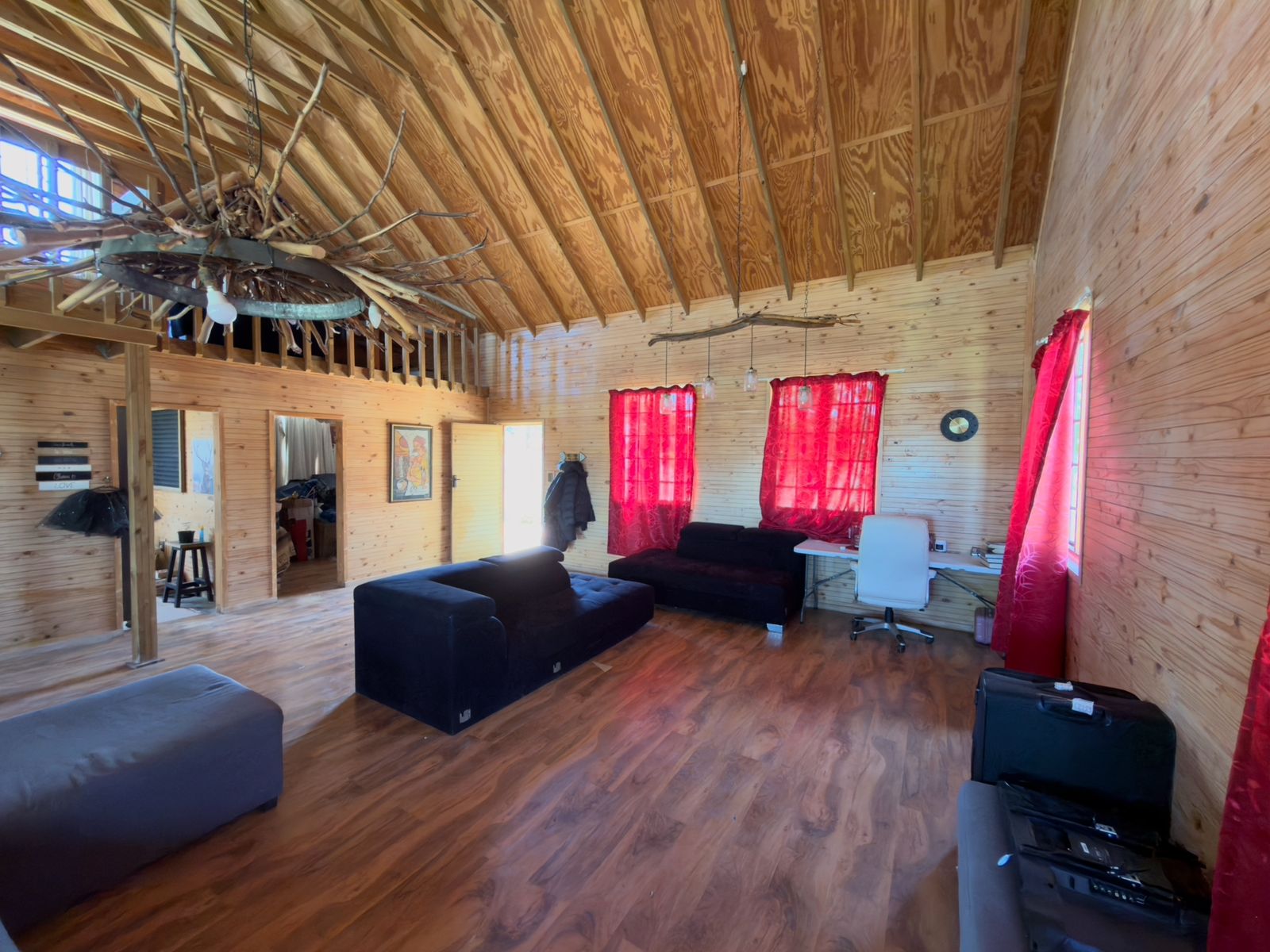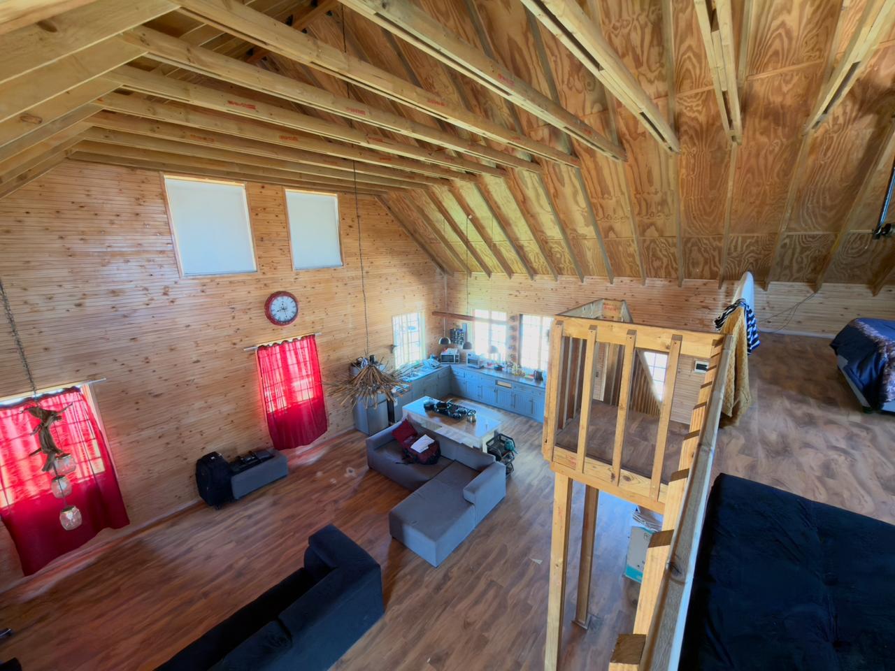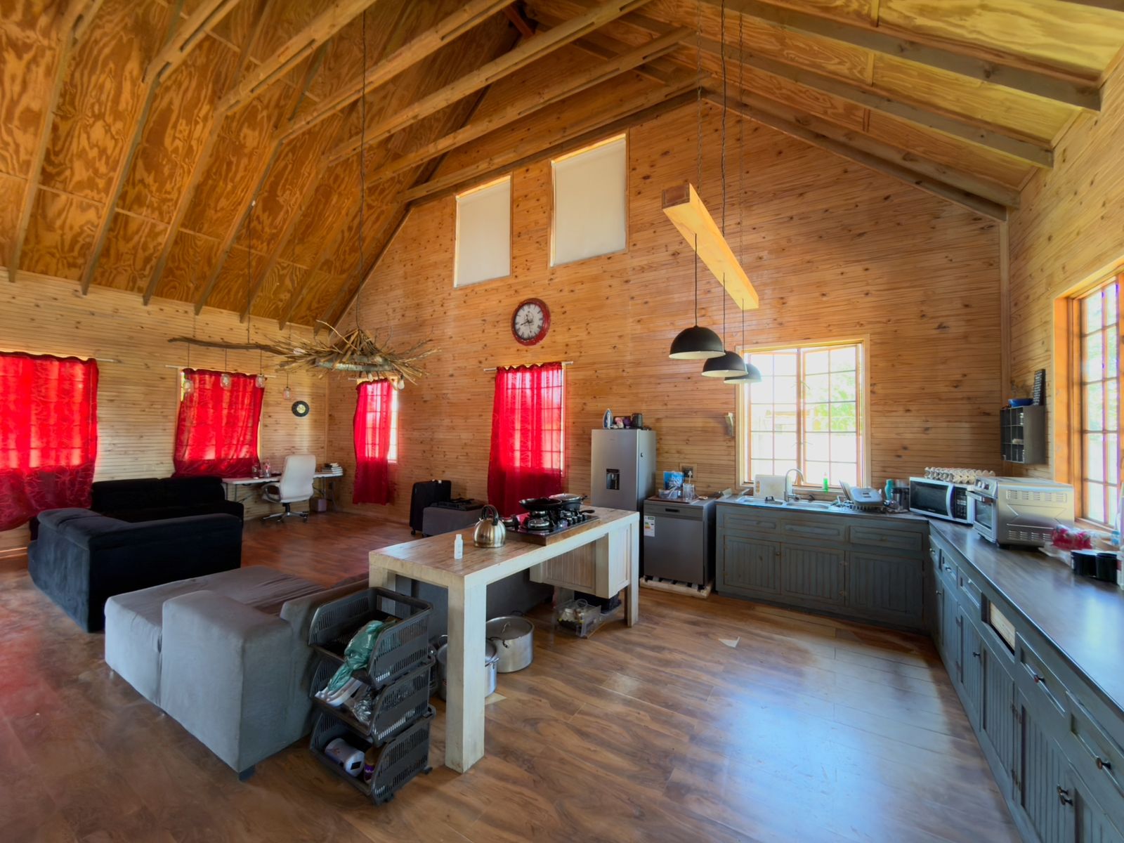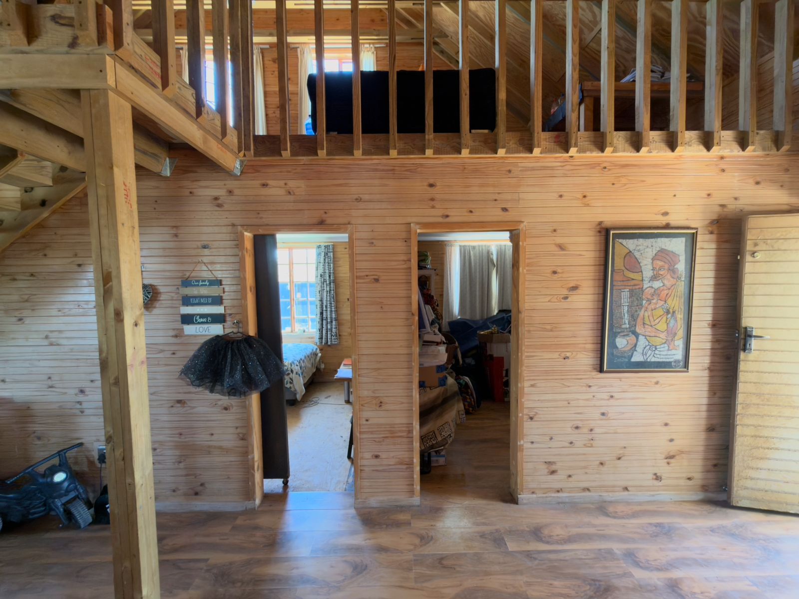 Step inside to be wowed by an 8m double-volume, exposed-beam, mezzanine-style living space. The open-plan Family Room, Dining Room, and Kitchen create a grand American-style barn vibe, perfect for entertaining. The ground floor features two cozy bedrooms and a well-appointed bathroom. Ascend the stairs to find a spacious Main Bedroom on the left and a versatile Office Space on the right.