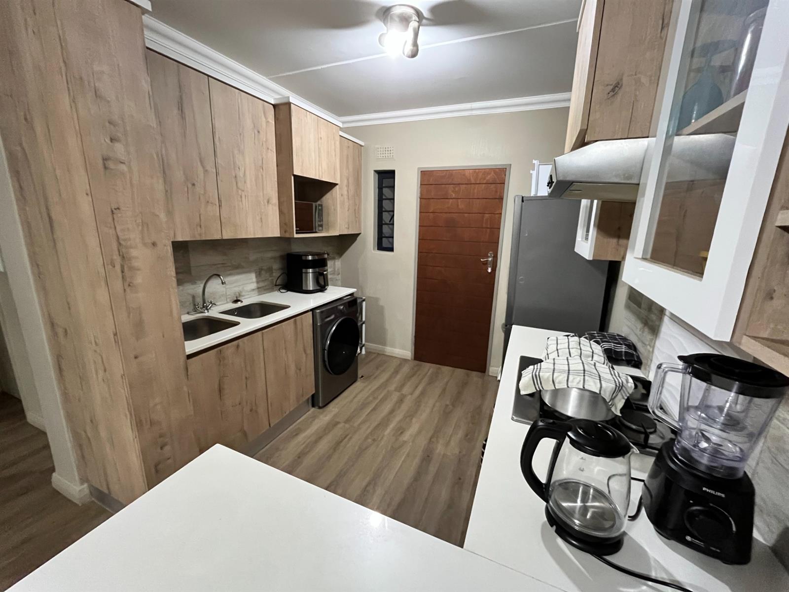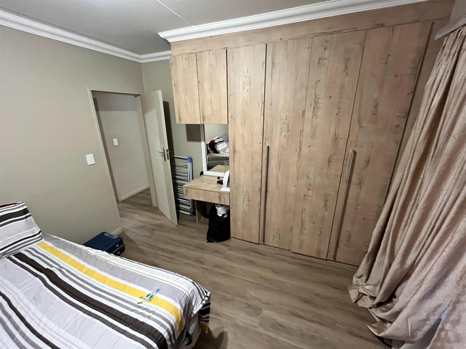 Step into a bright open-plan living area with vinyl flooring and large aluminium windows that invite natural light. The stylish kitchen features ample built-in cupboards, seamlessly flowing into the lounge.