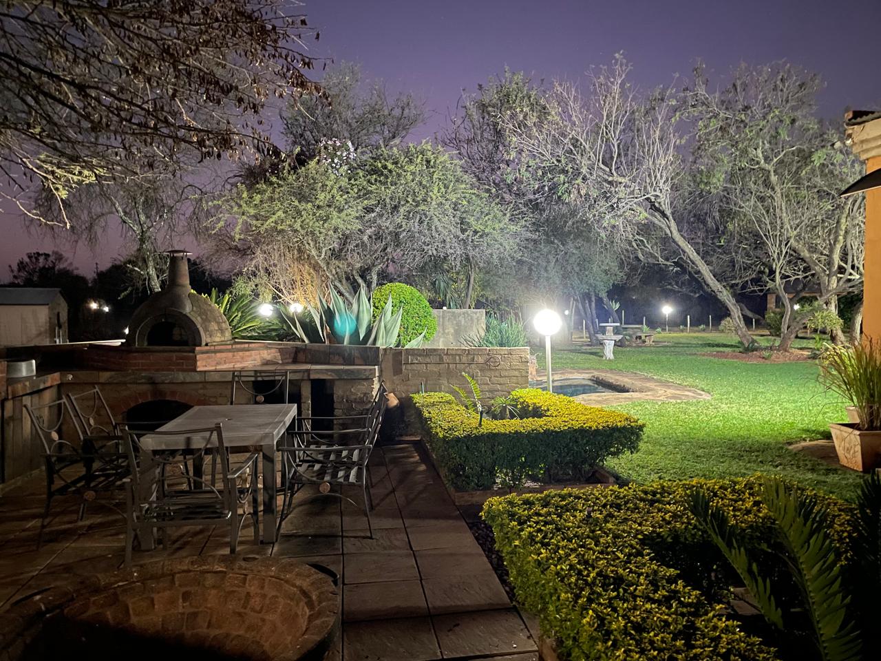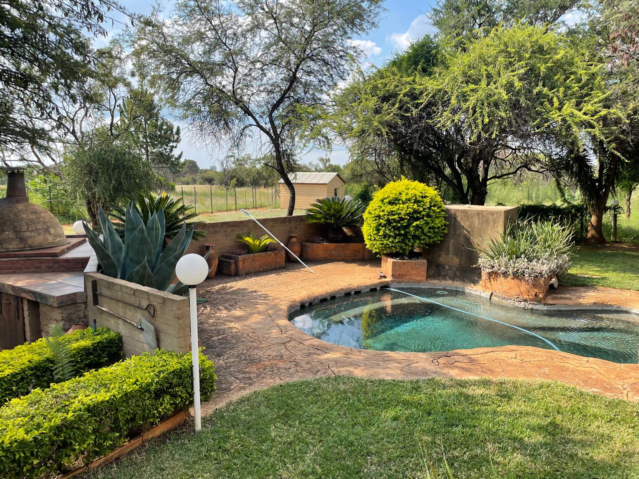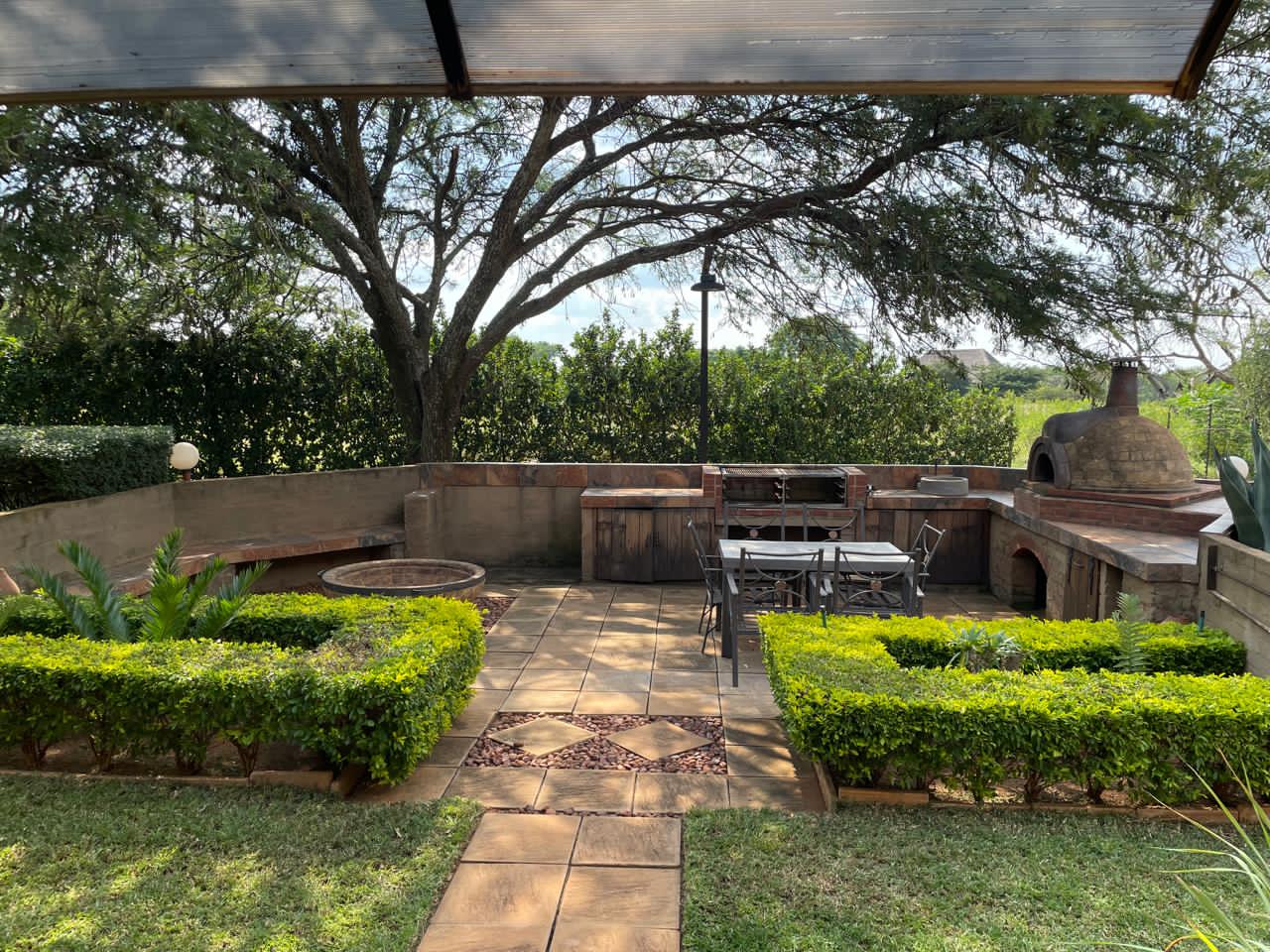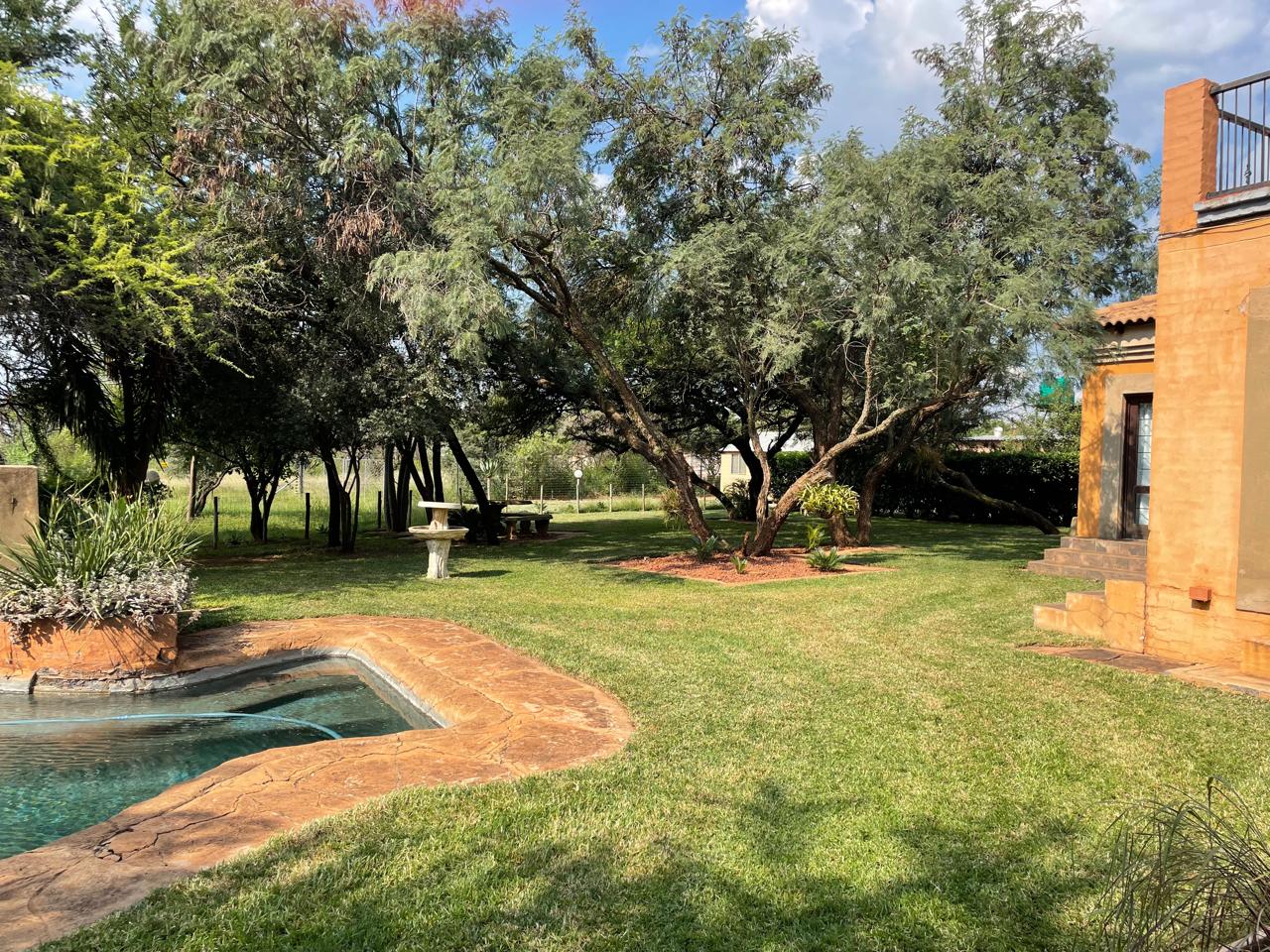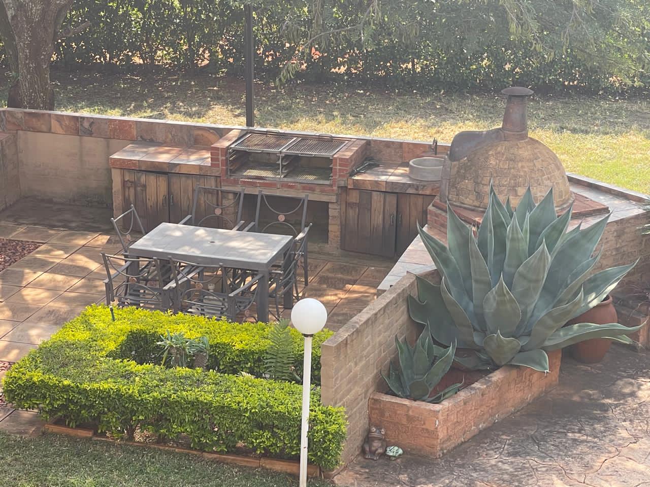 Outside, the property showcases a beautifully maintained garden, two double carports, a braai area with a pizza oven, a sparkling pool, a storeroom, and separate staff quarters with private bathroom.