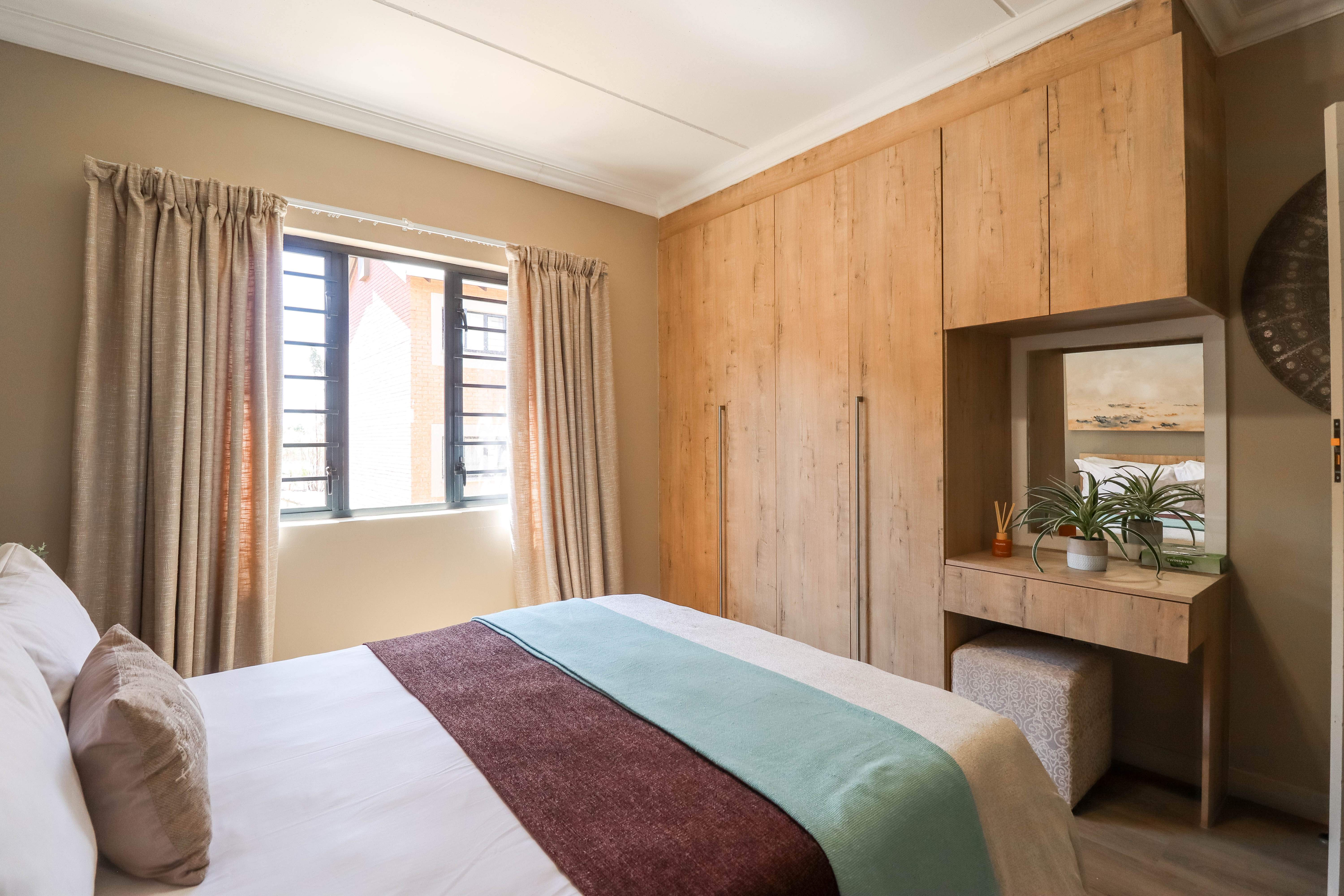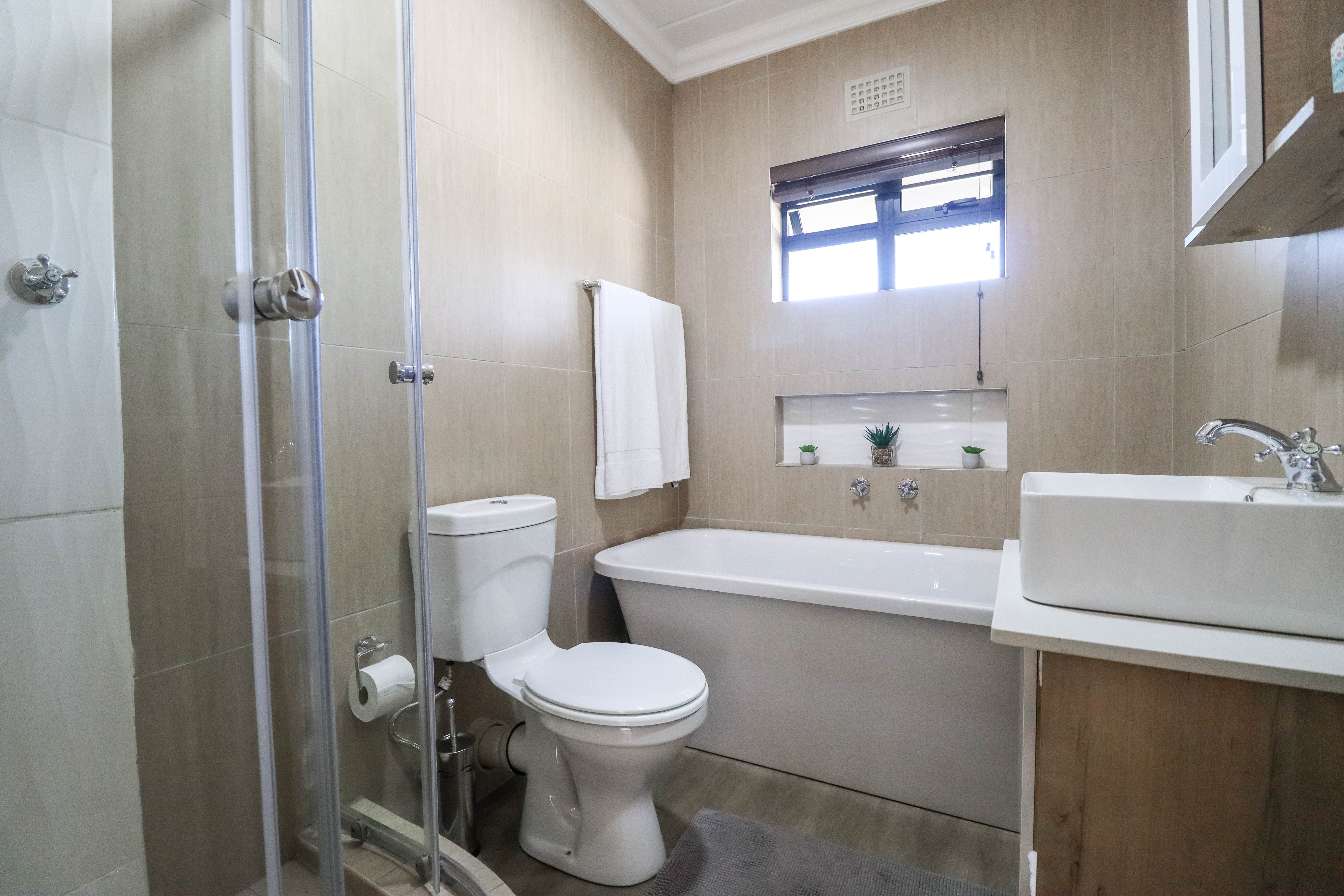 One full bathroom with bath tub, shower, basin and toilet and one en-suite bathroom with shower, basin and toilet. Two bedrooms are fitted with built in cupboards and the master bedroom also has a dressing table fitted.