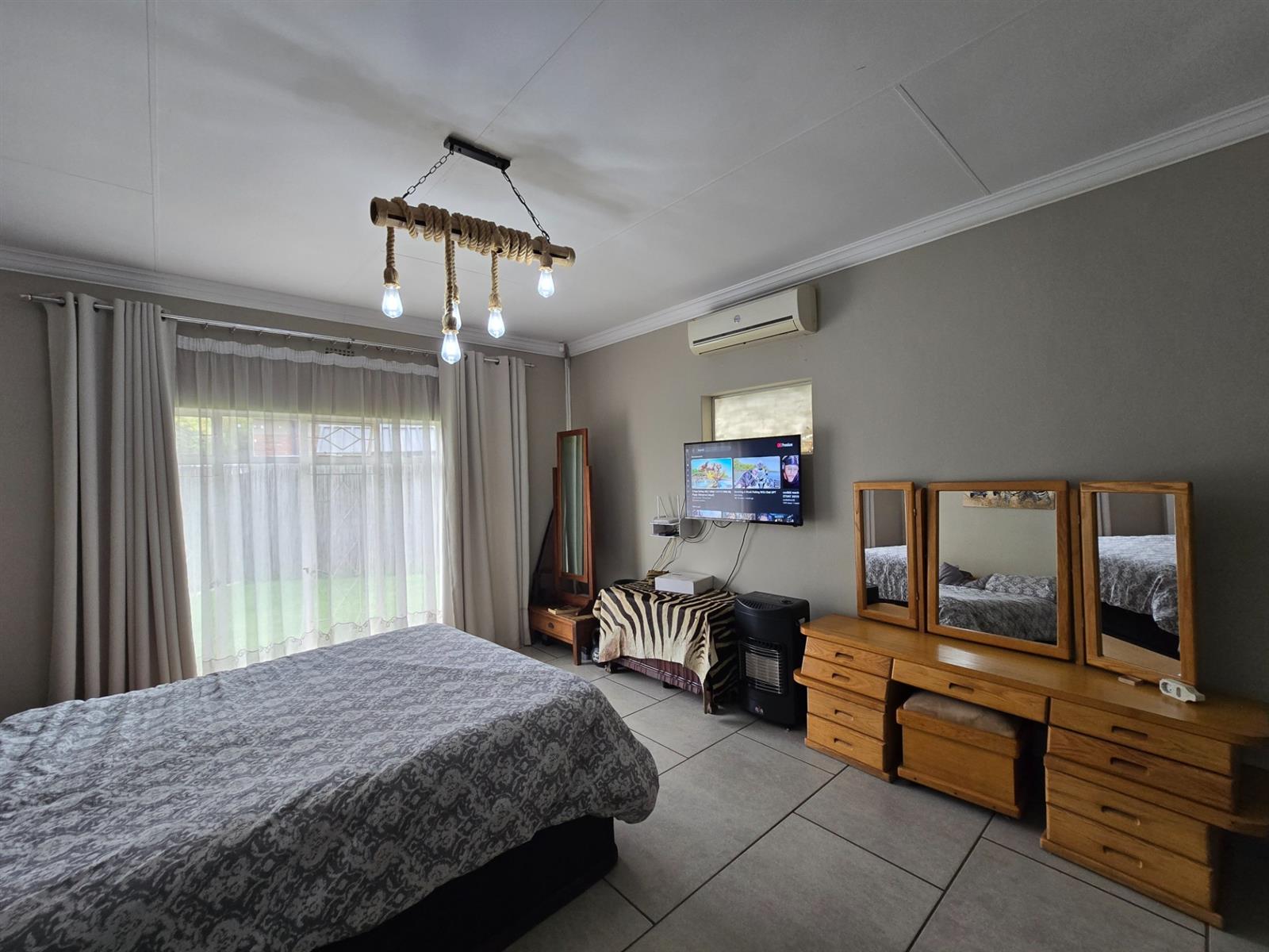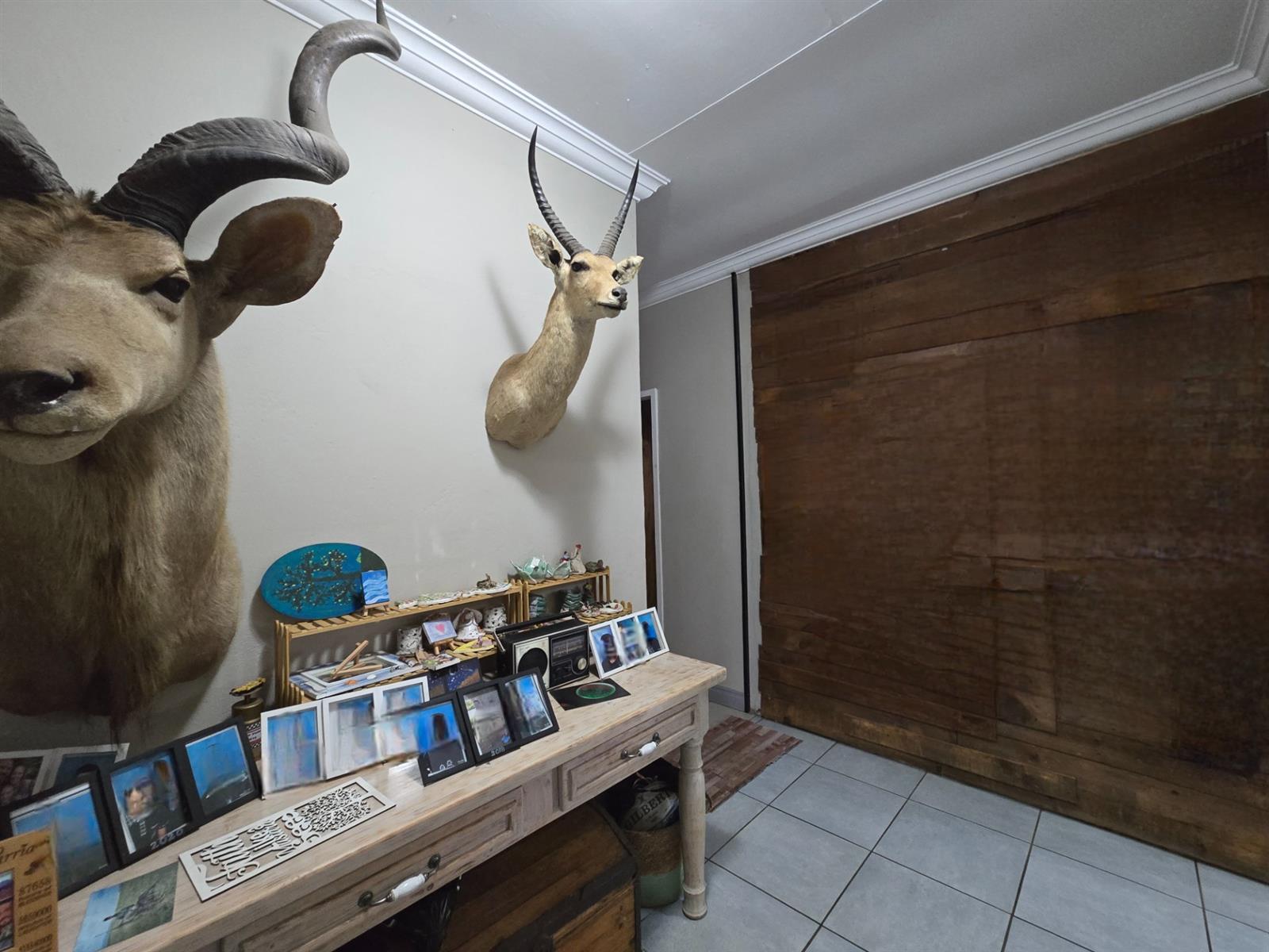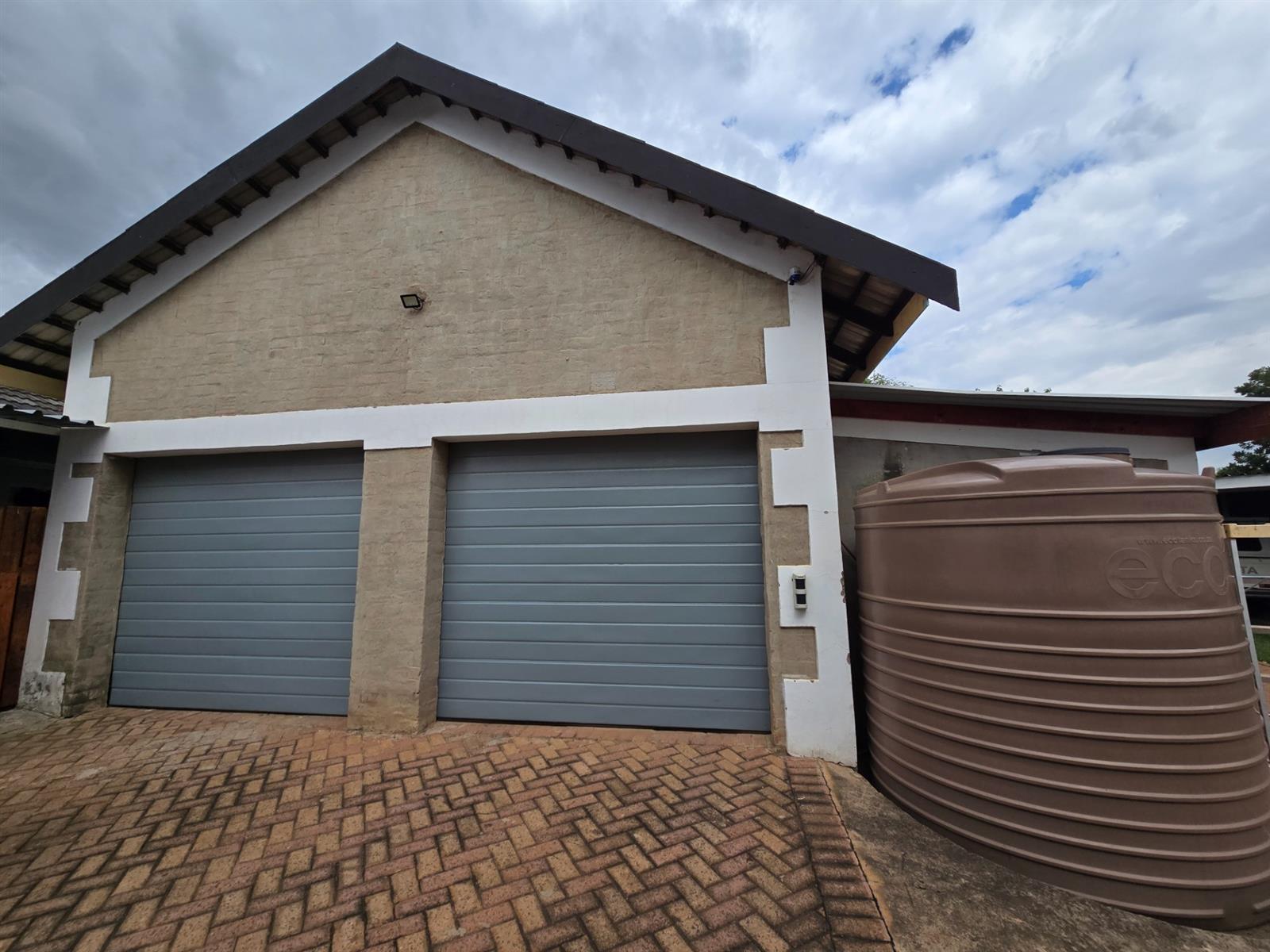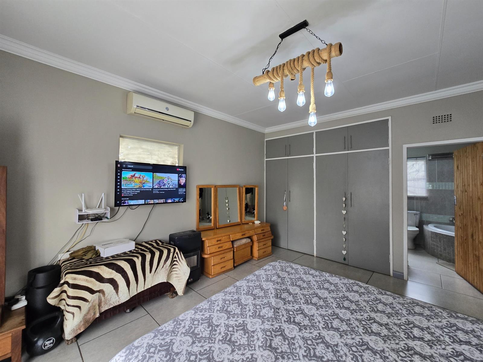 Security and sustainability are standout features, including beams, an alarm system, and cameras. The home is powered by an advanced solar setup with 14 x 550W panels, 8 lithium batteries (5760Wh each), and an 8KVA inverter, supported by a borehole with pressure pump and a 5,050L water tank, as well as gas geysers.
