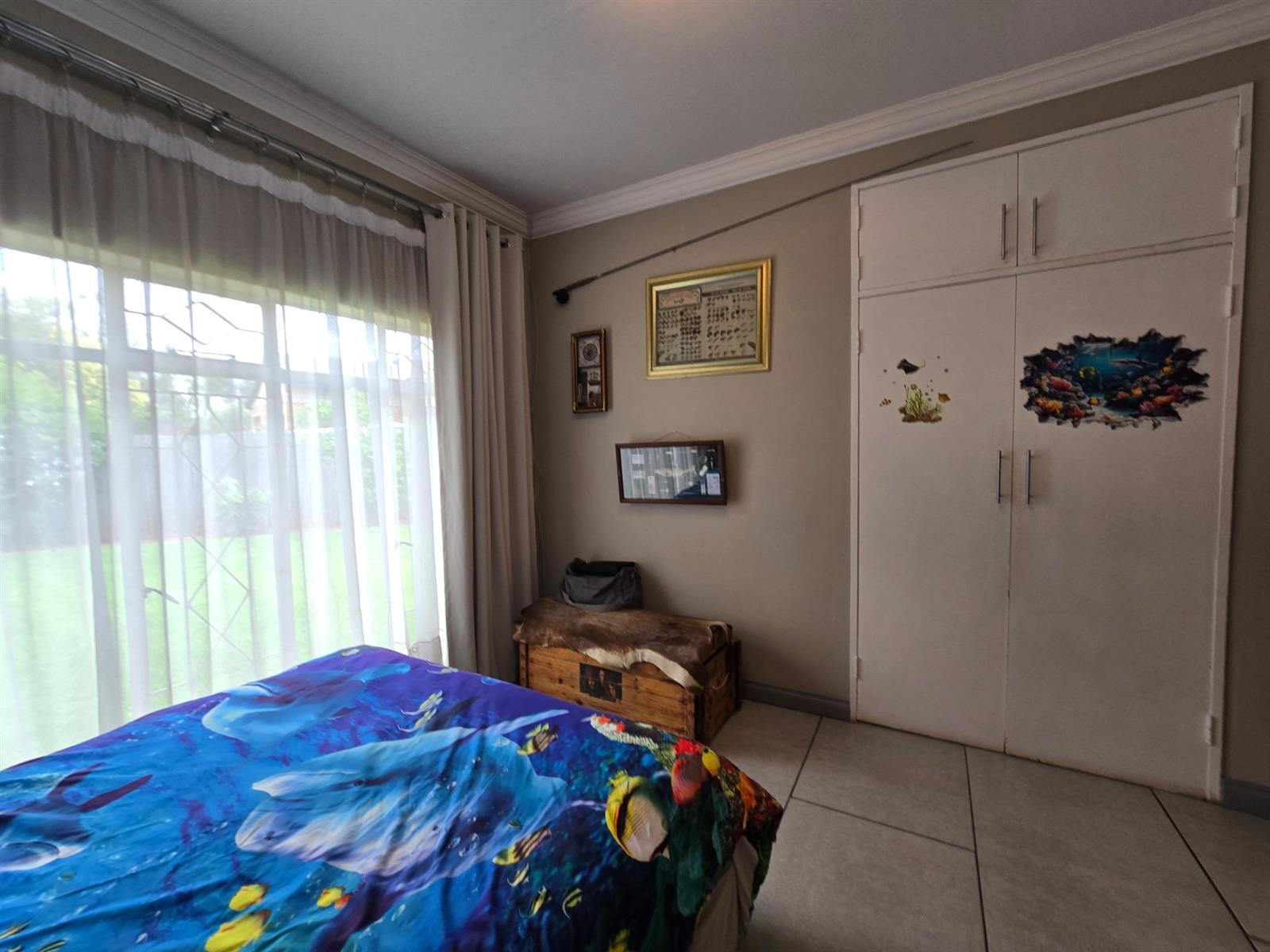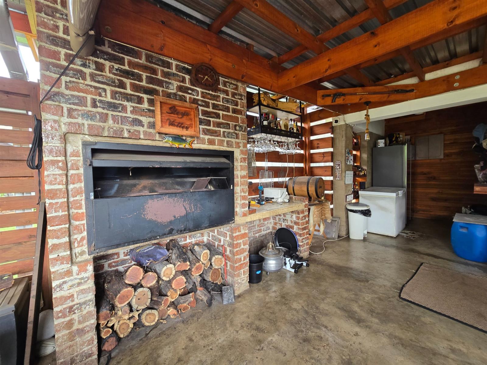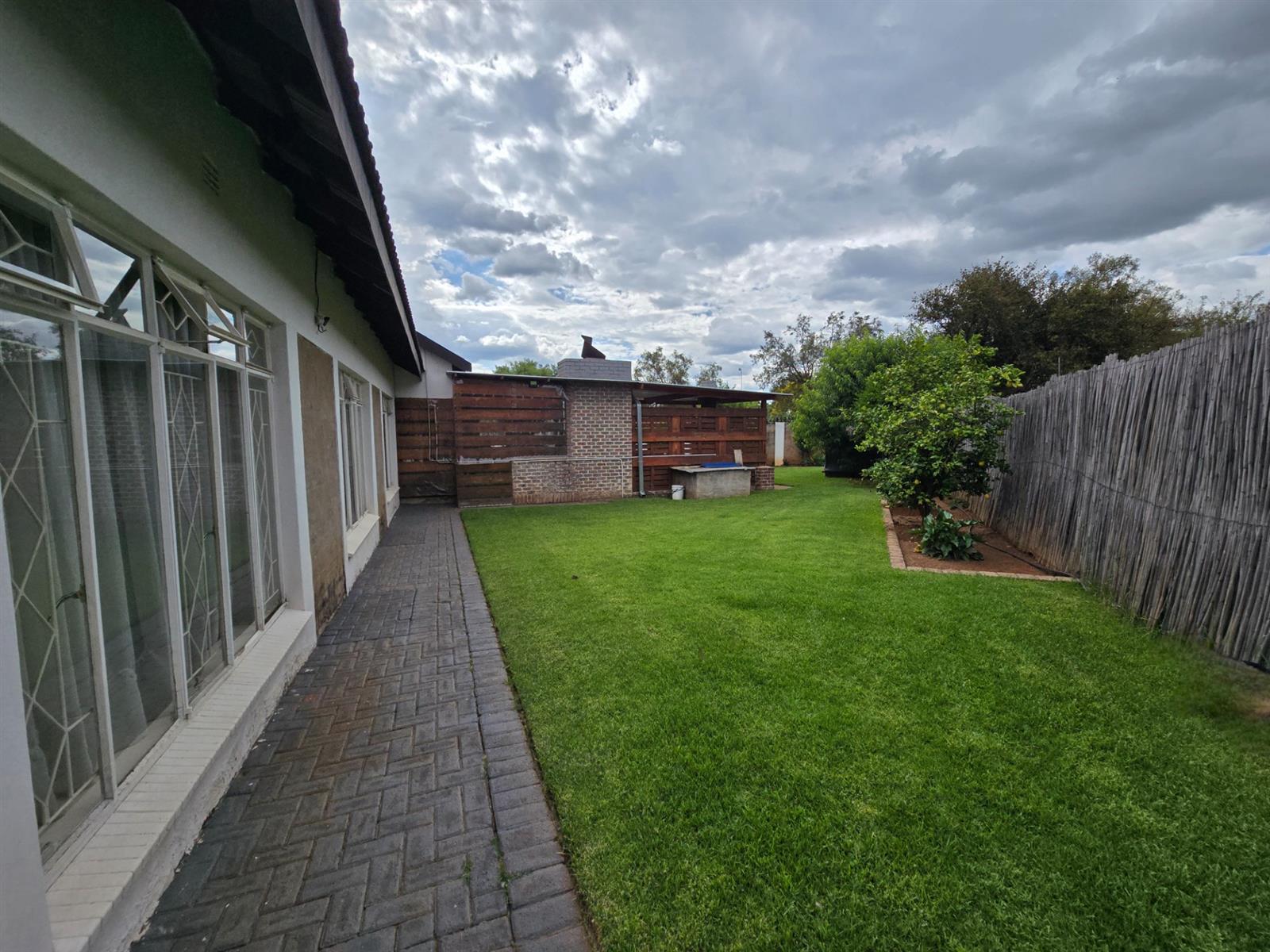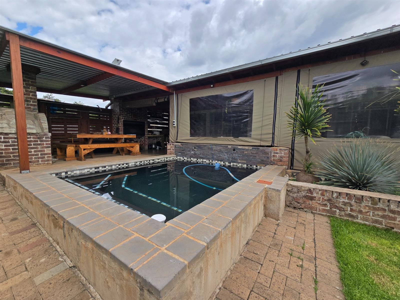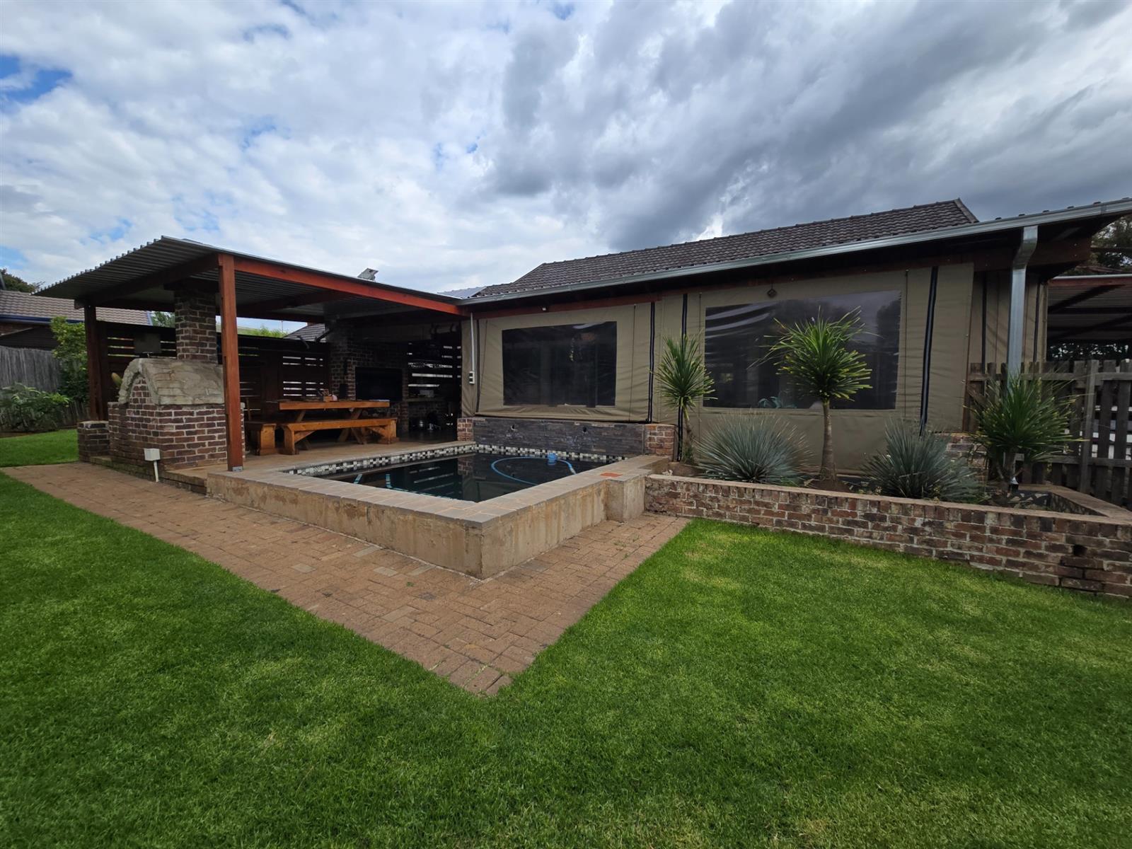 Flowing from the dining room, doors open onto a covered patio fitted with canvasses that can be closed for year-round use. This impressive entertainment area boasts a built-in braai and pizza oven, overlooking the swimming pool and well-maintained garden—an ideal setting for relaxed weekends, family gatherings, and memorable evenings with friends.