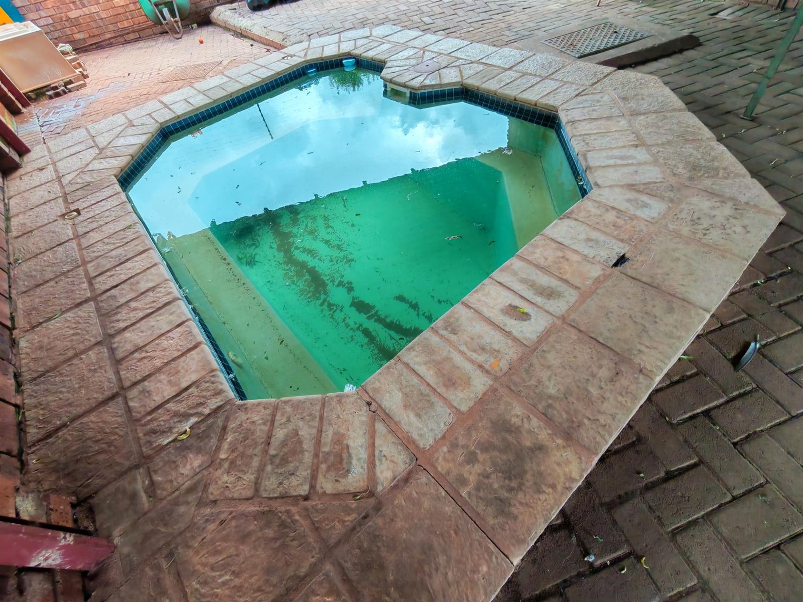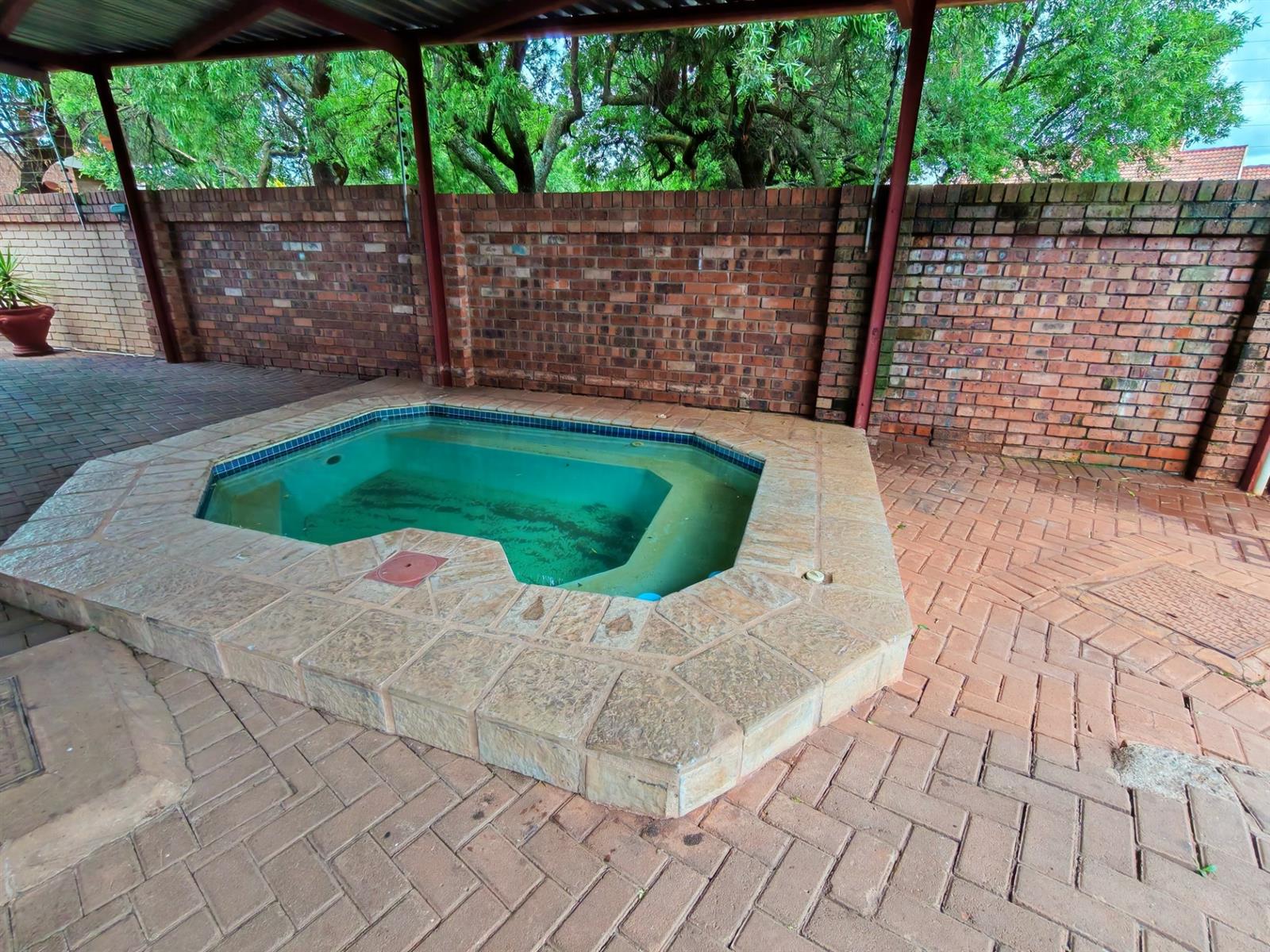 a Small splash pool covered by a carport for protection from the sun