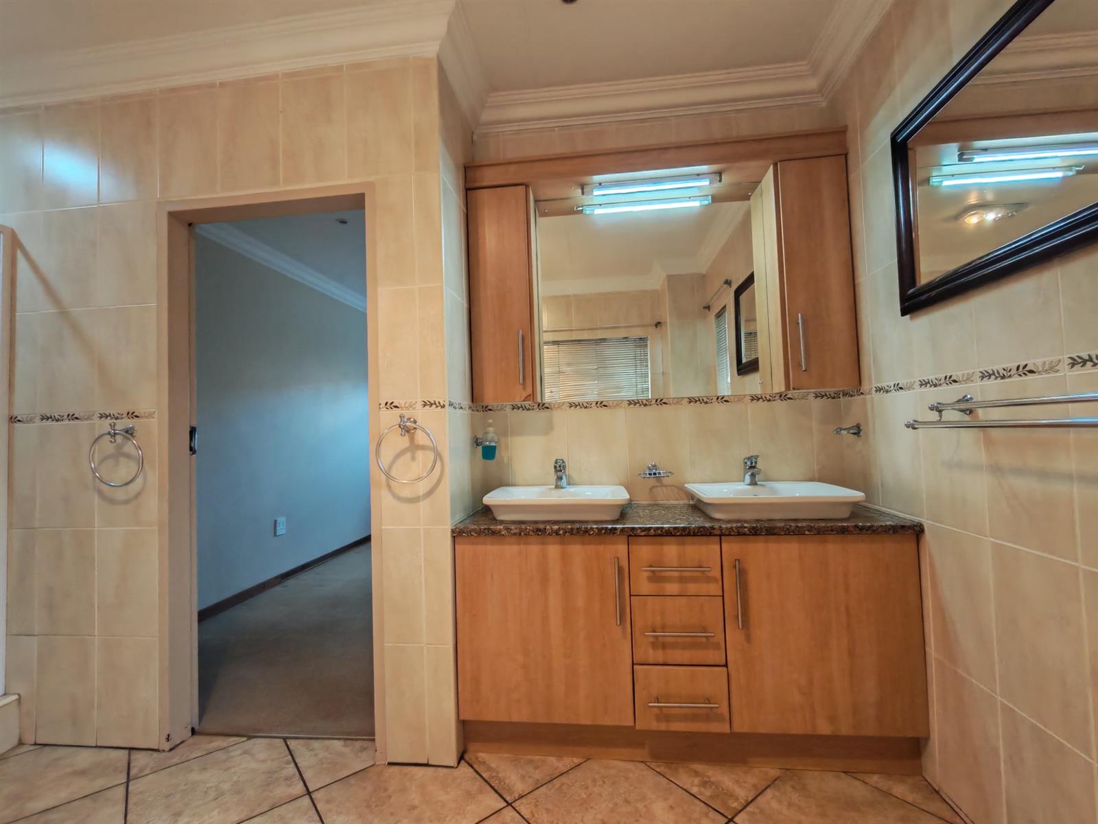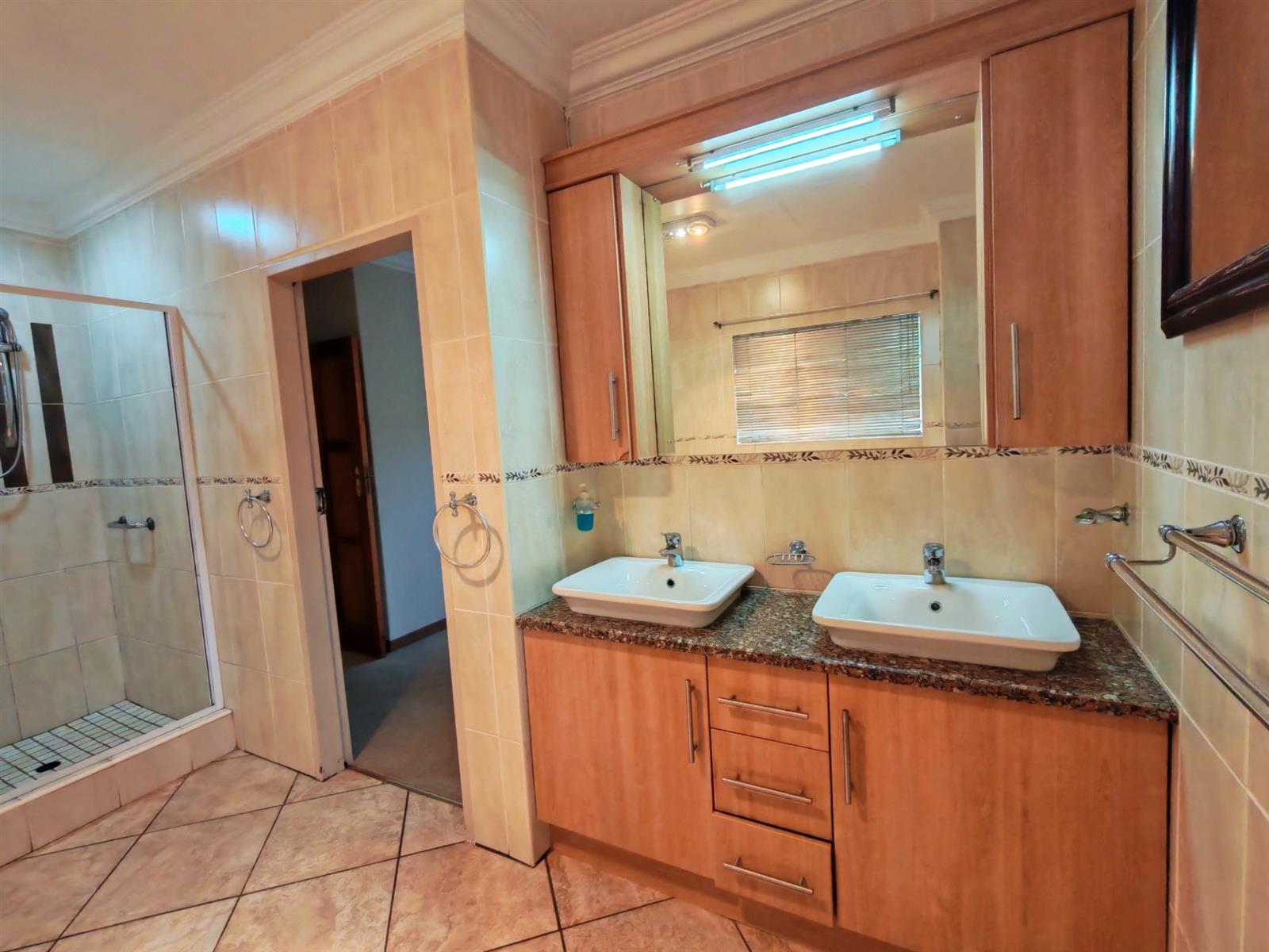 En-suite bathroom with a spacious bath and shower and twin basin with beautiful ligting