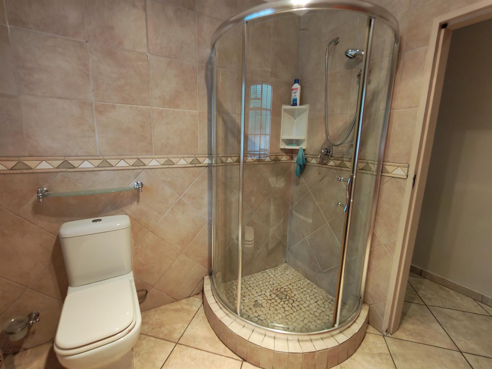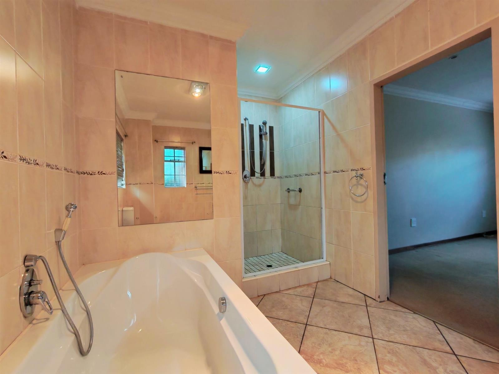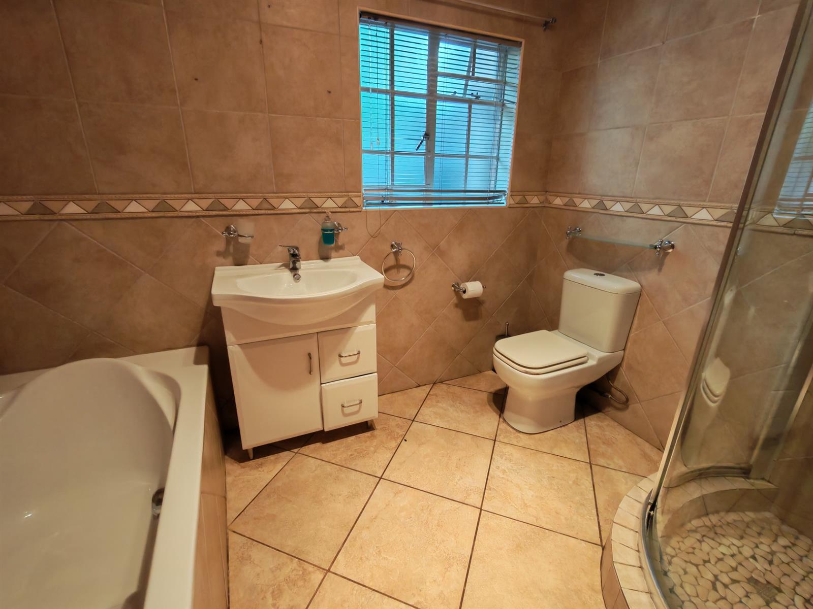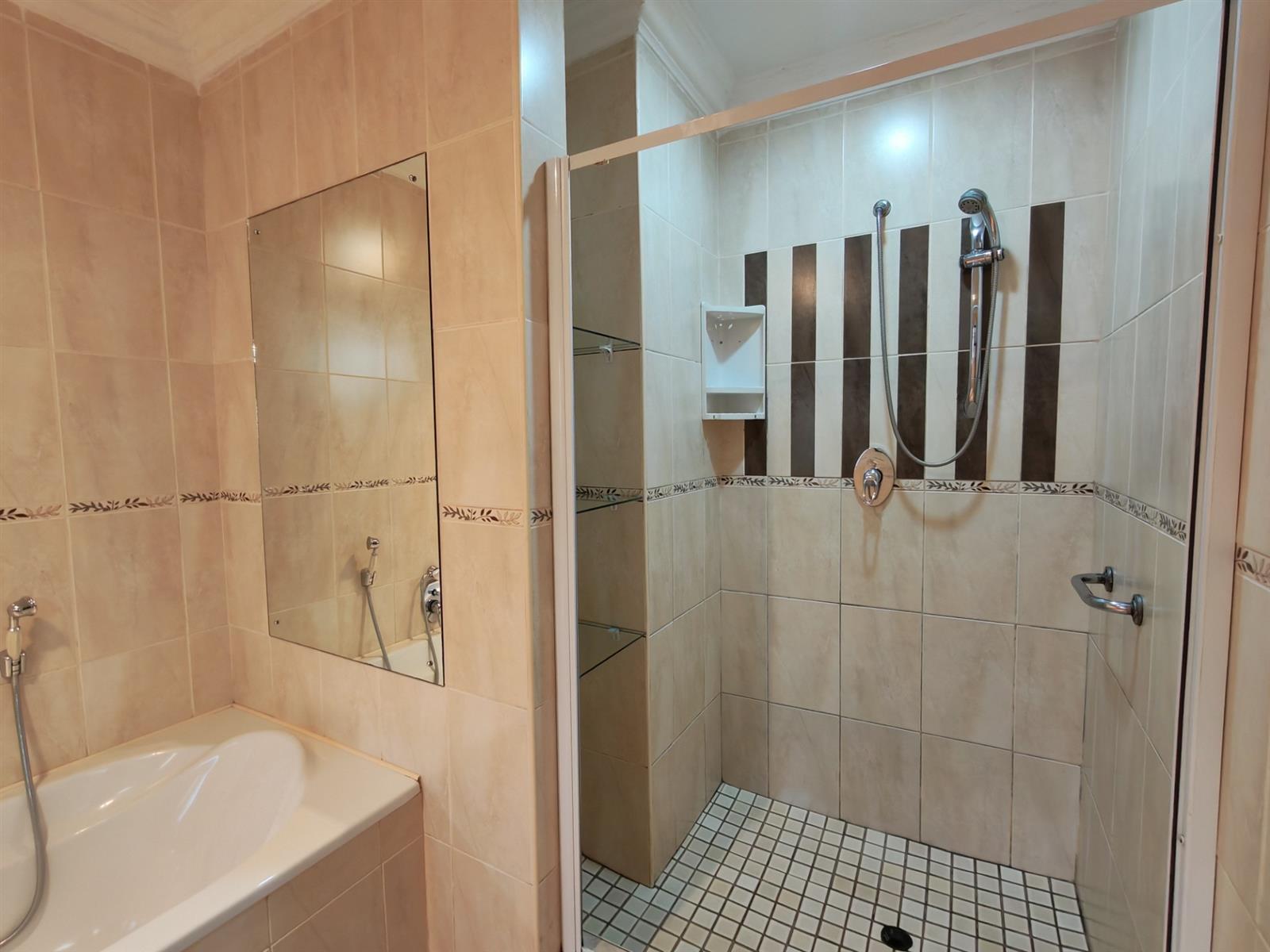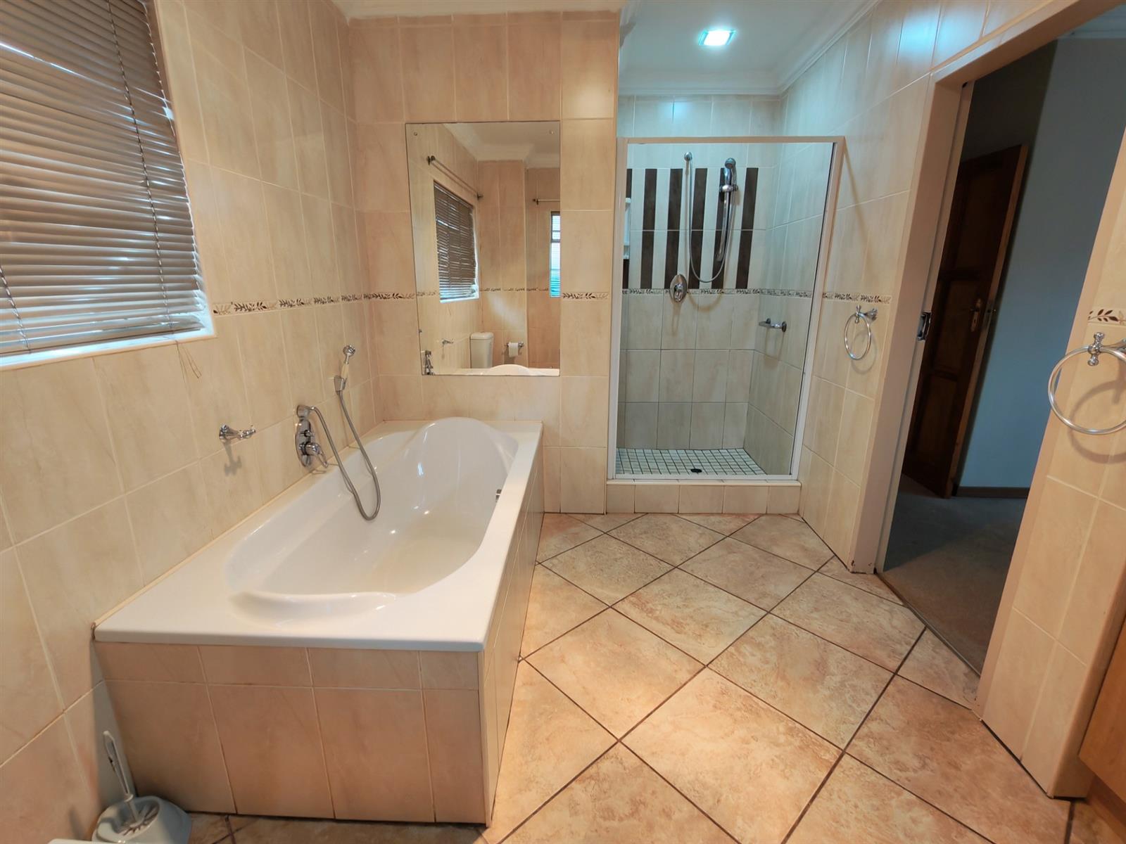 Full bathroom with bath and beautiful shower for guests.