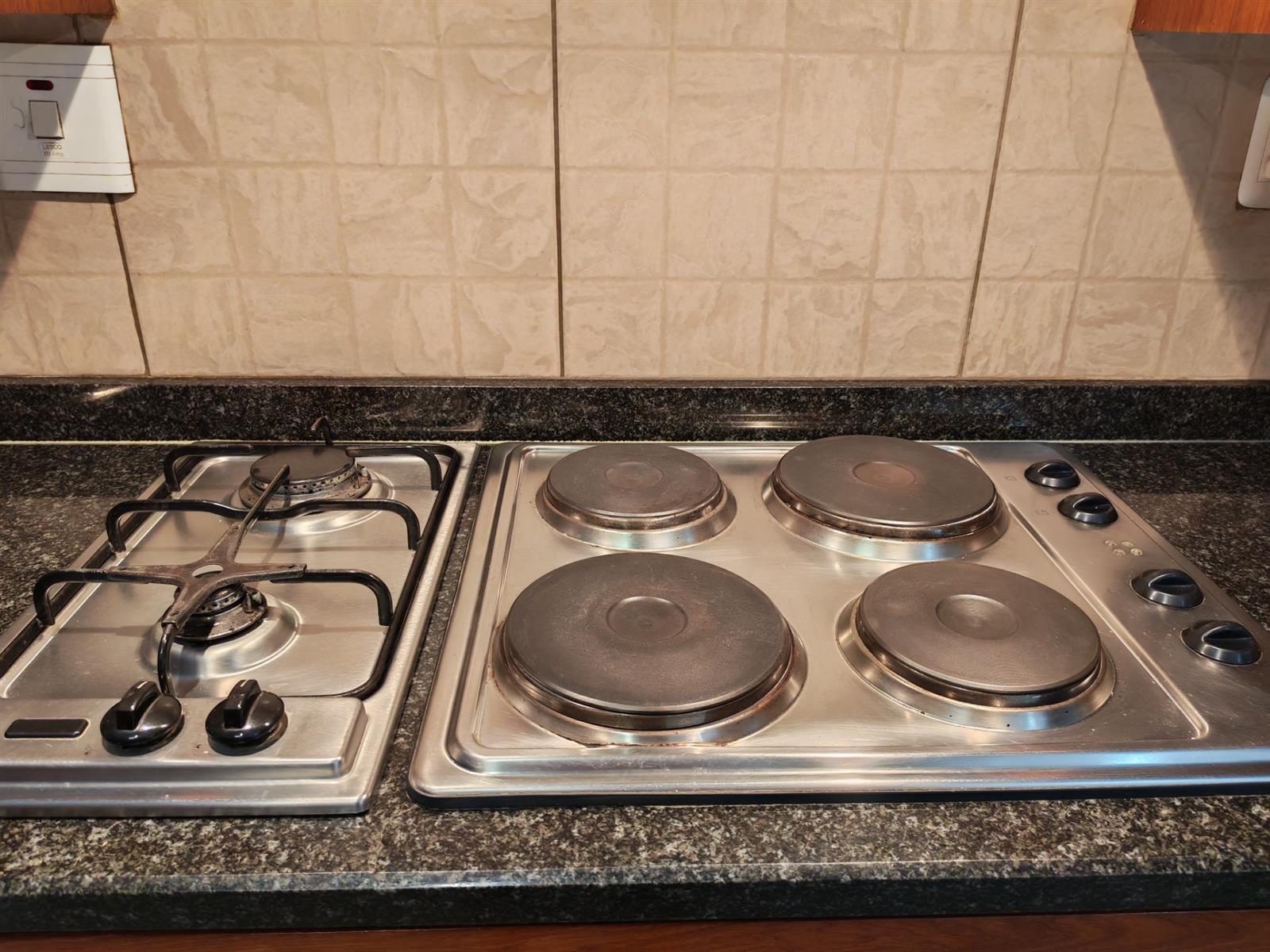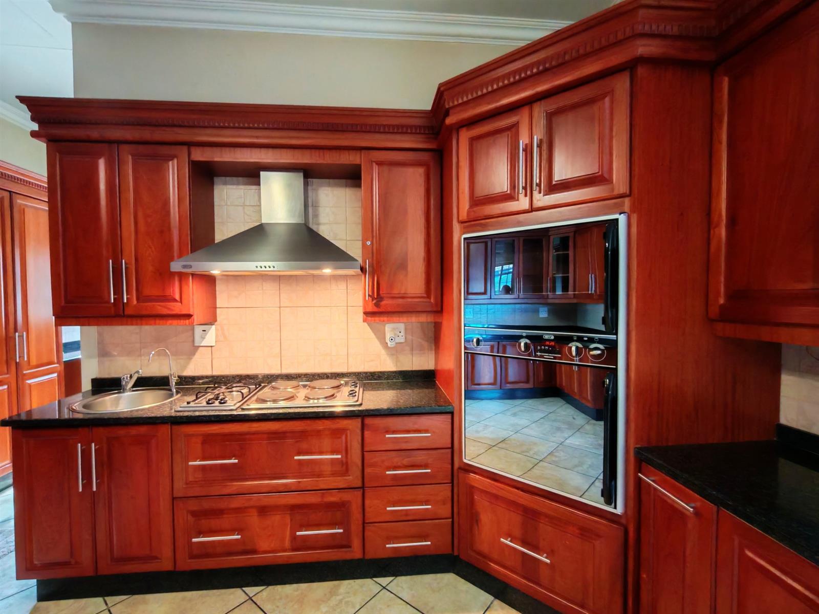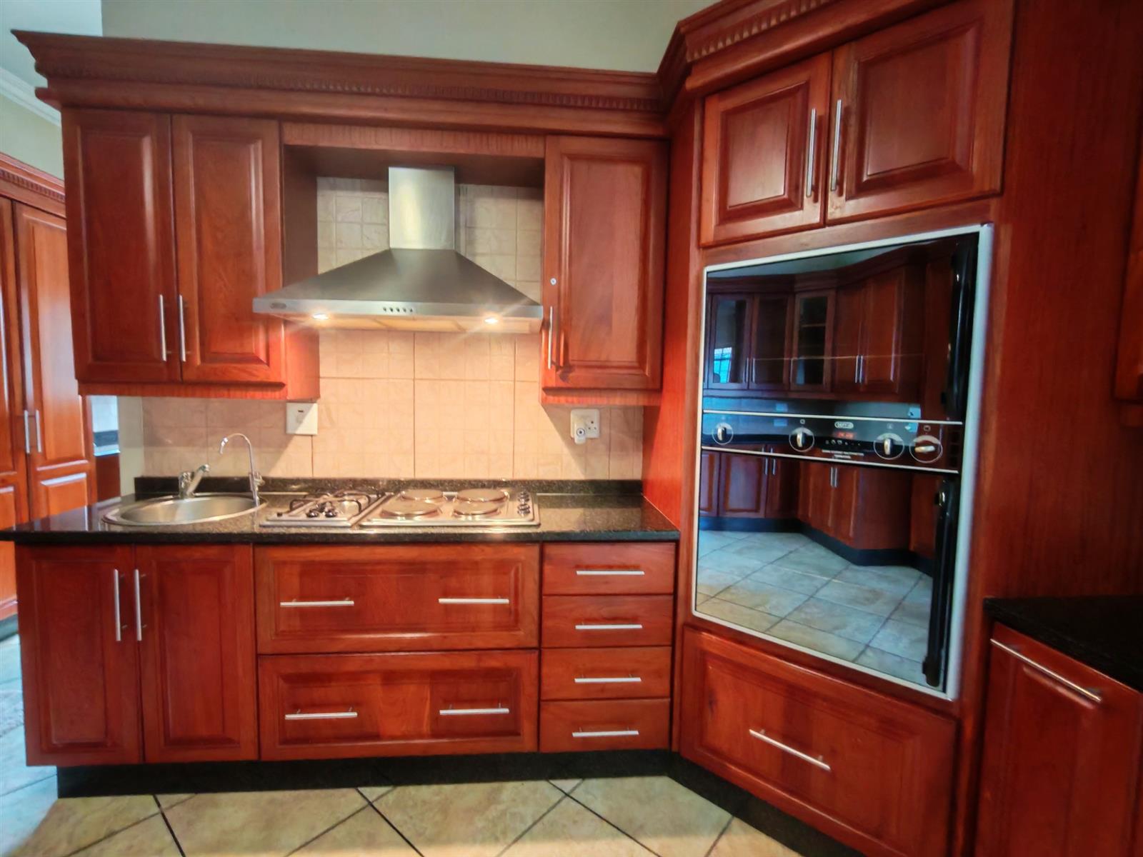 Modern kitchen with rosewood cabinets, granite tops, a water filter, gas and electric hob, electric oven