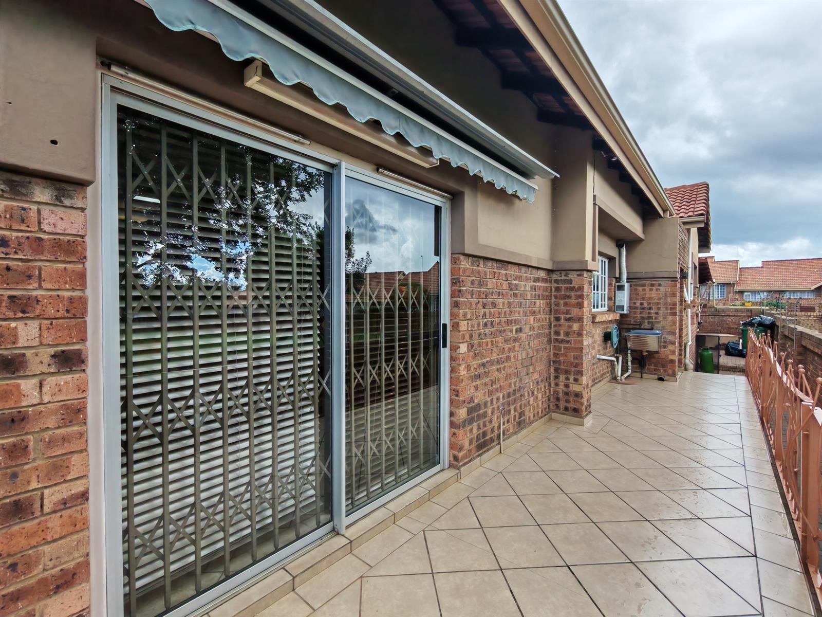 A small patio at the back of the house with a retractable awning