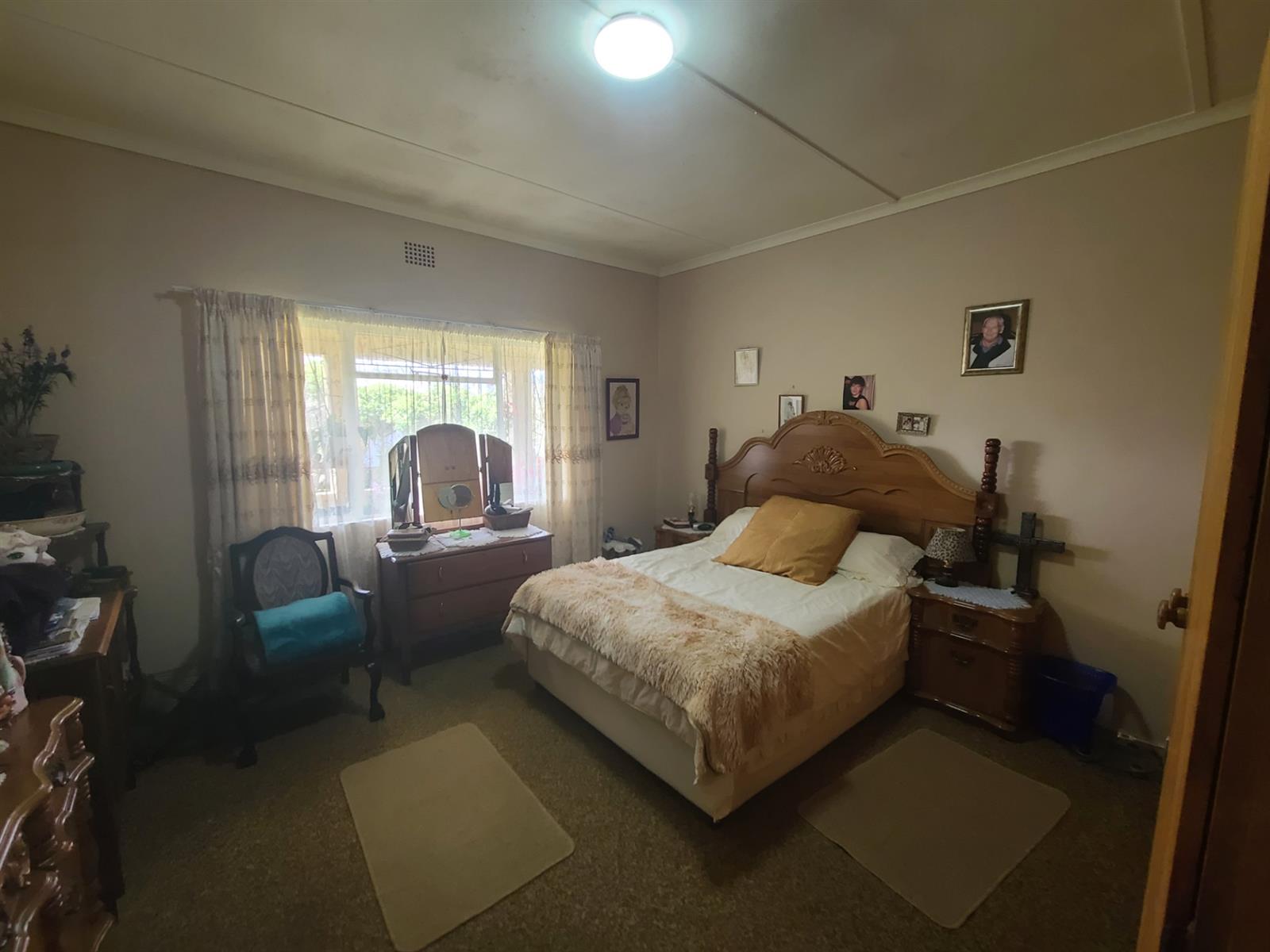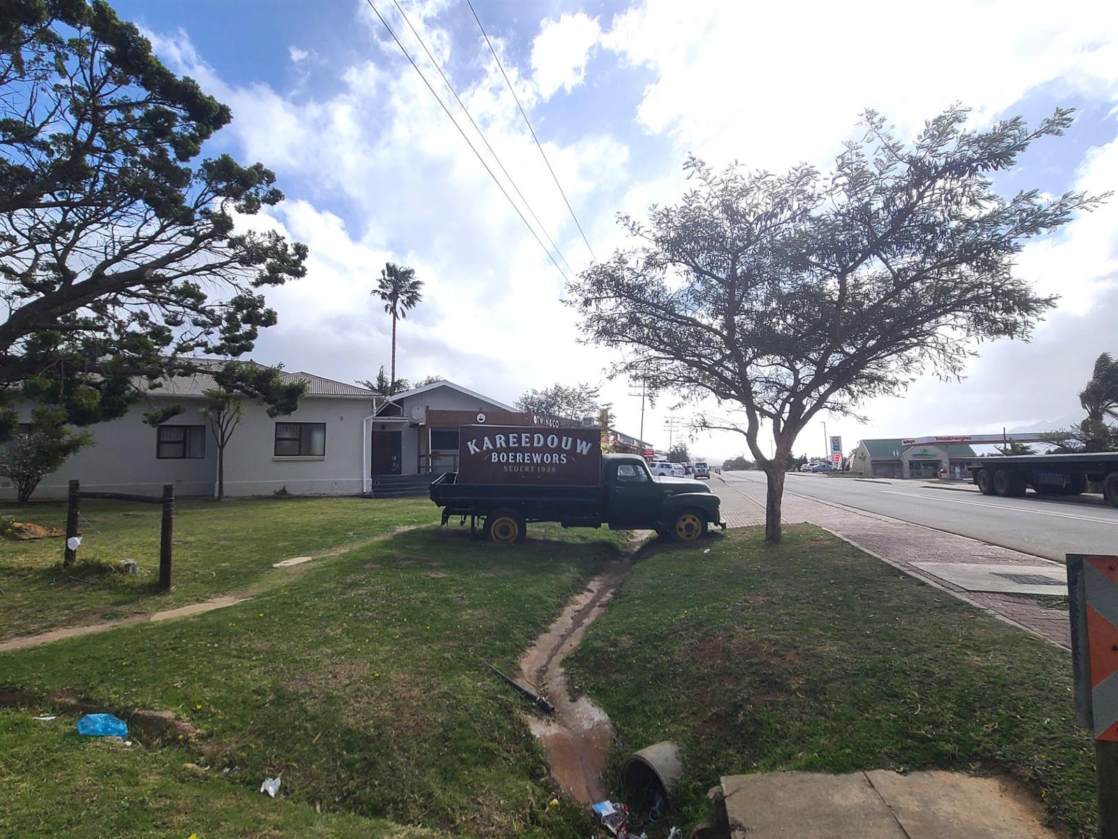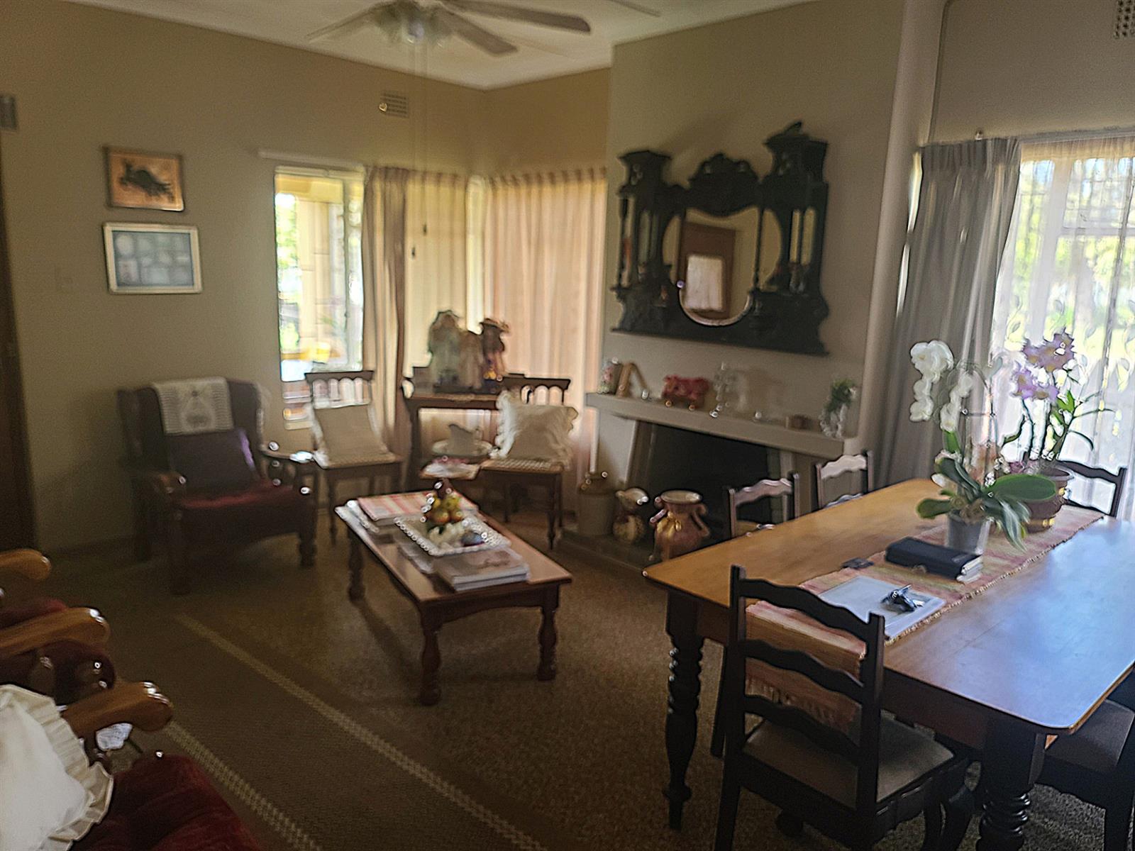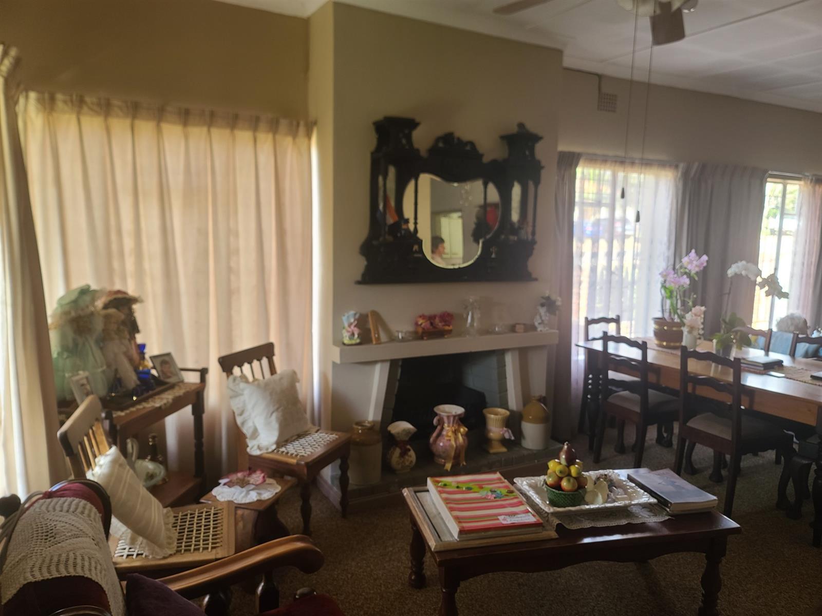 The lounge has a cozy fireplace for the cold winter evenings. The kitchen is old-style and large and has a serving hatch through into the dining/lounge area. The double door garage is slightly longer than standard garages and has a storeroom inside. Behind the garage is an "afdak" for storage/working space.