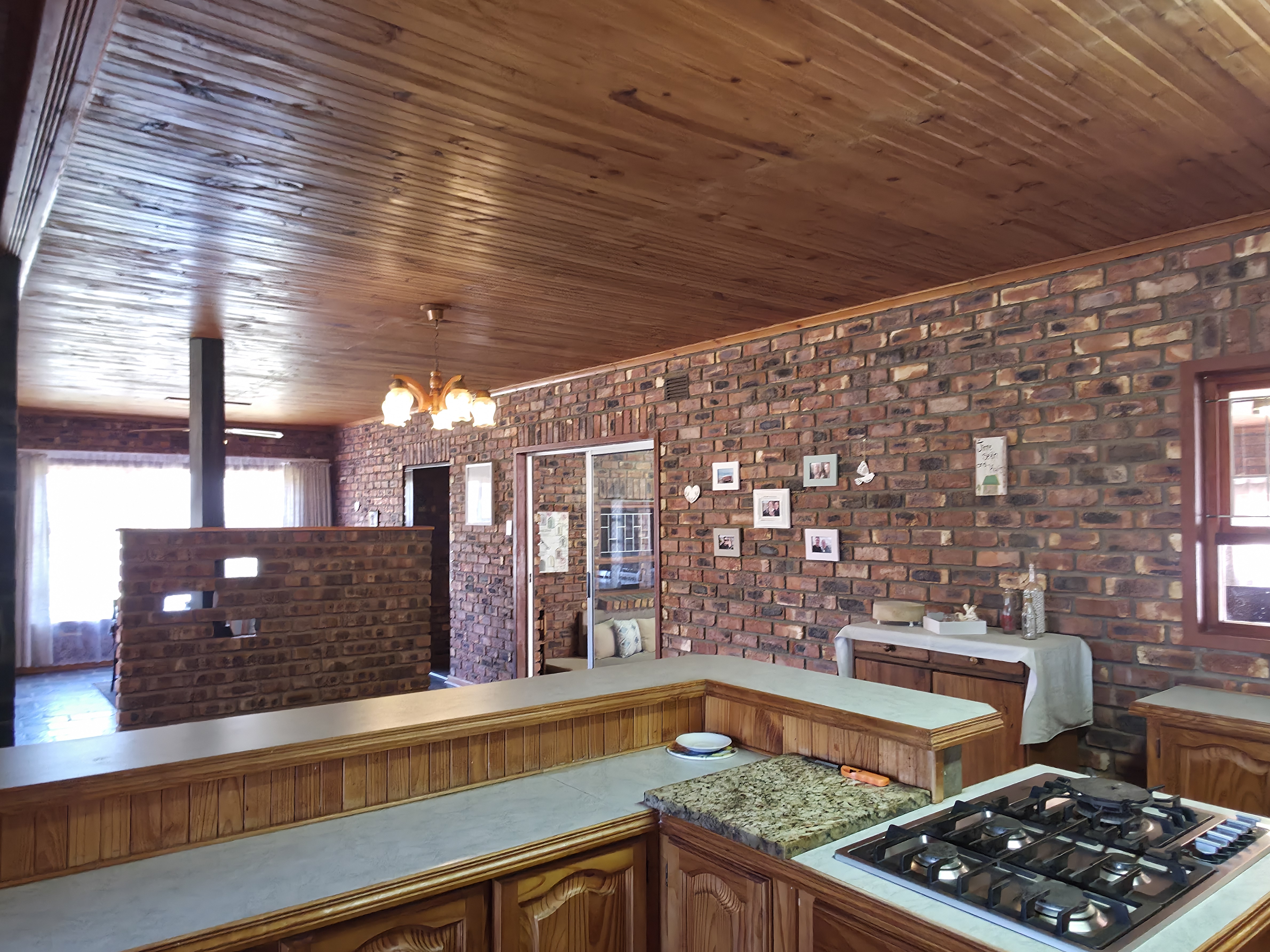 The spacious dining area, complete with a cosy fireplace, enhances the home’s inviting character. The well-appointed open-plan kitchen includes a separate pantry, with an additional laundry room for convenience. A sliding door leads to an expansive TV lounge fitted with a built-in braai—an ideal space for hosting family and friends.