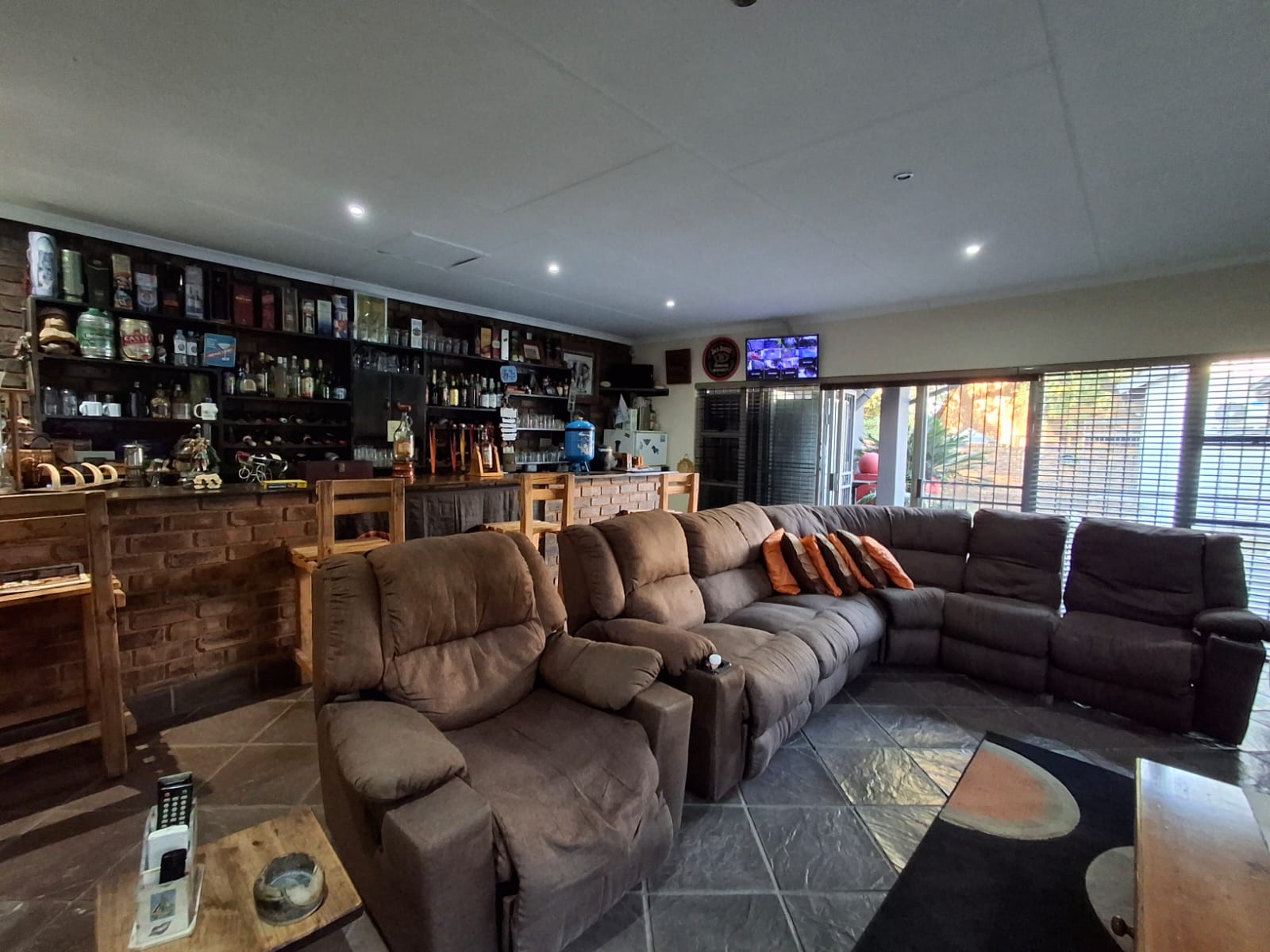 Comfortable living room with built-in bar and air conditioner