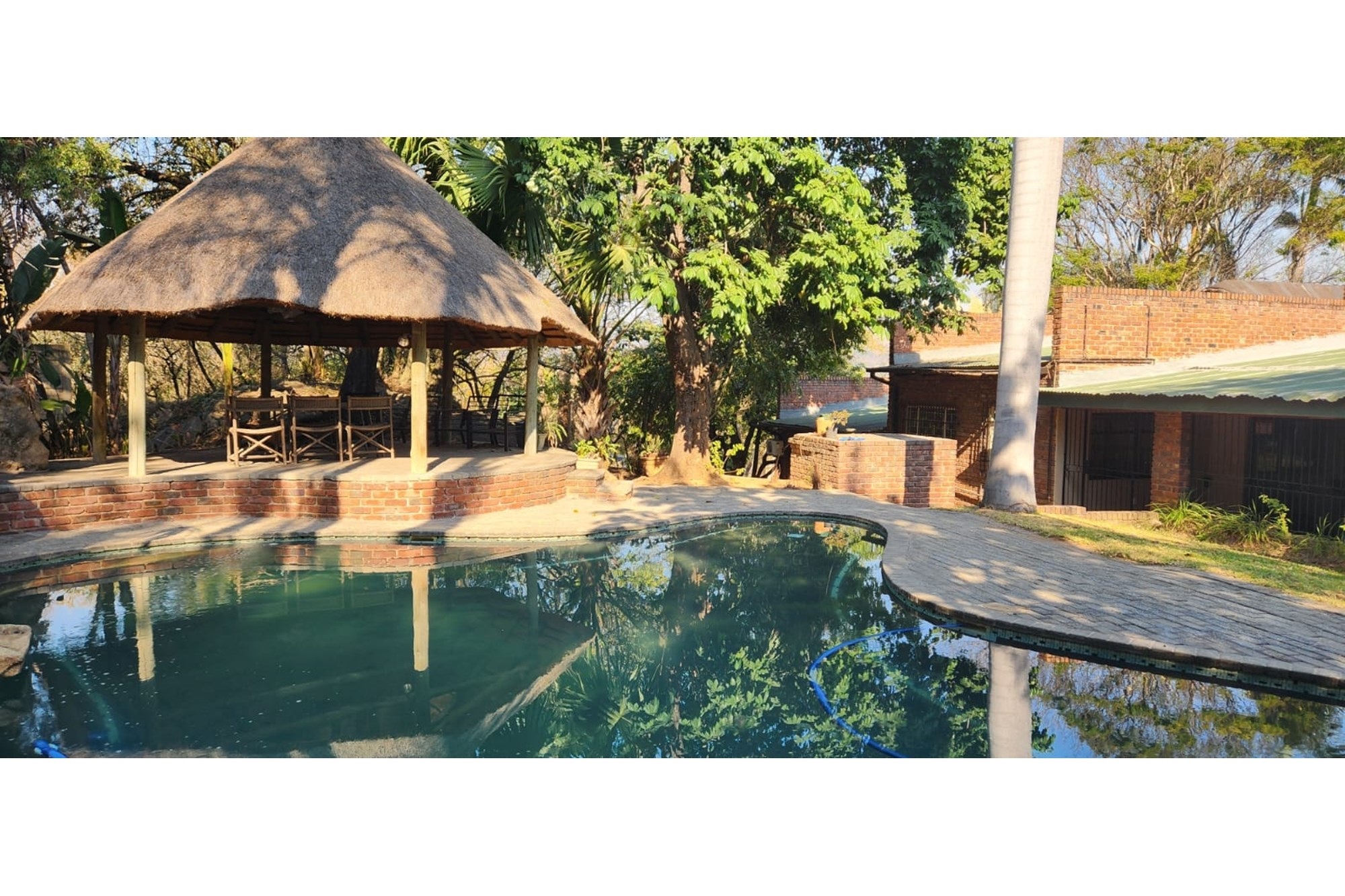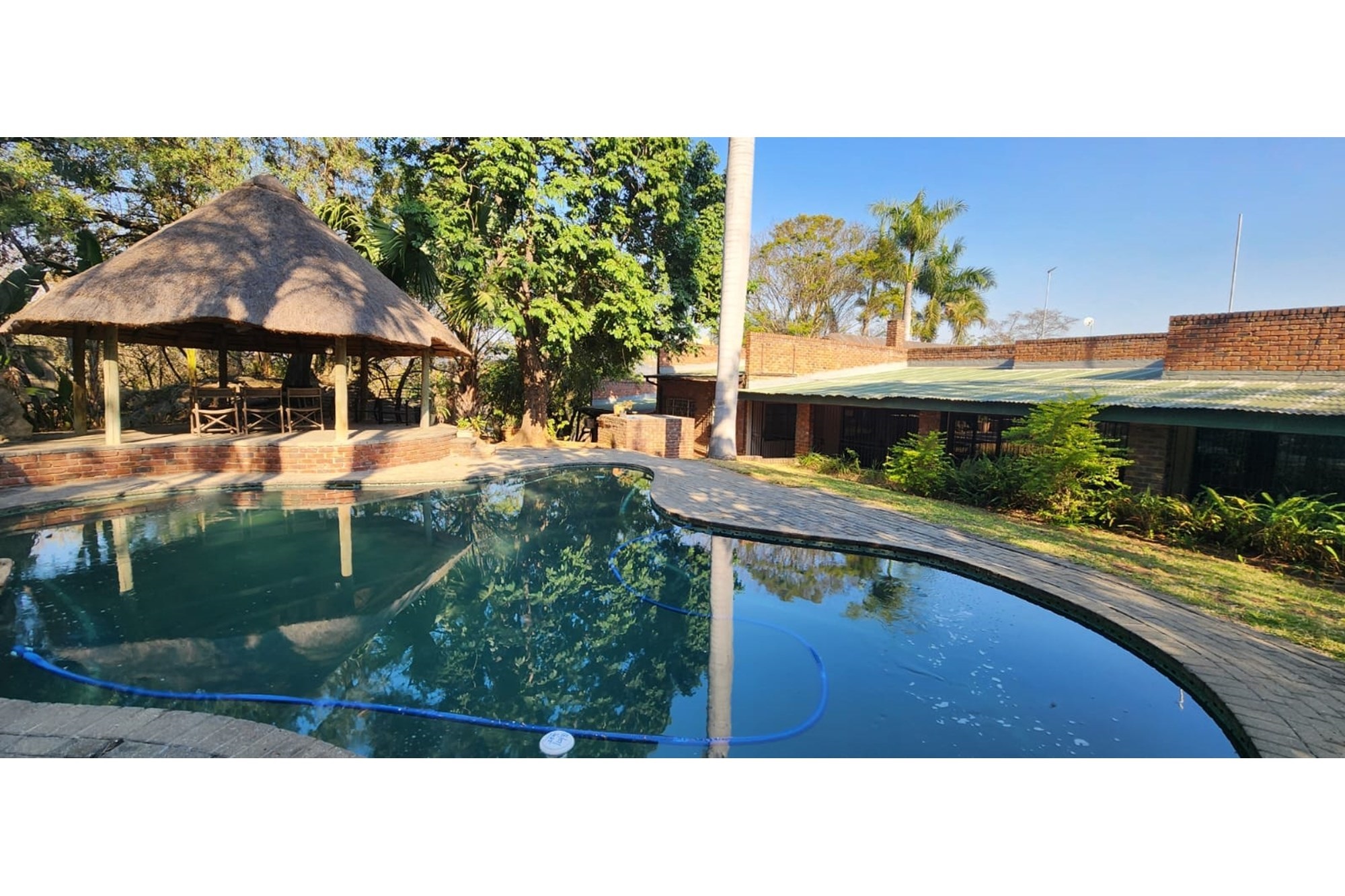 The well designed family home is very spacious; the main attraction is the open plan entertainment area, and include a very spacious living area, which incorporate the lounge, dining room and a closed in verandah with braai facilities. (108sqm). The kitchen is fitted with ample cupboards a fitted gas stove and has a separate scullery and laundry area. The lifestyle home also offers a beautiful black swimming pool (55sqm) with a salt chlorinator, as well as a waterfall; The thatch lapa is next to a natural rocky outcrop and enhance the lowveld ambiance.