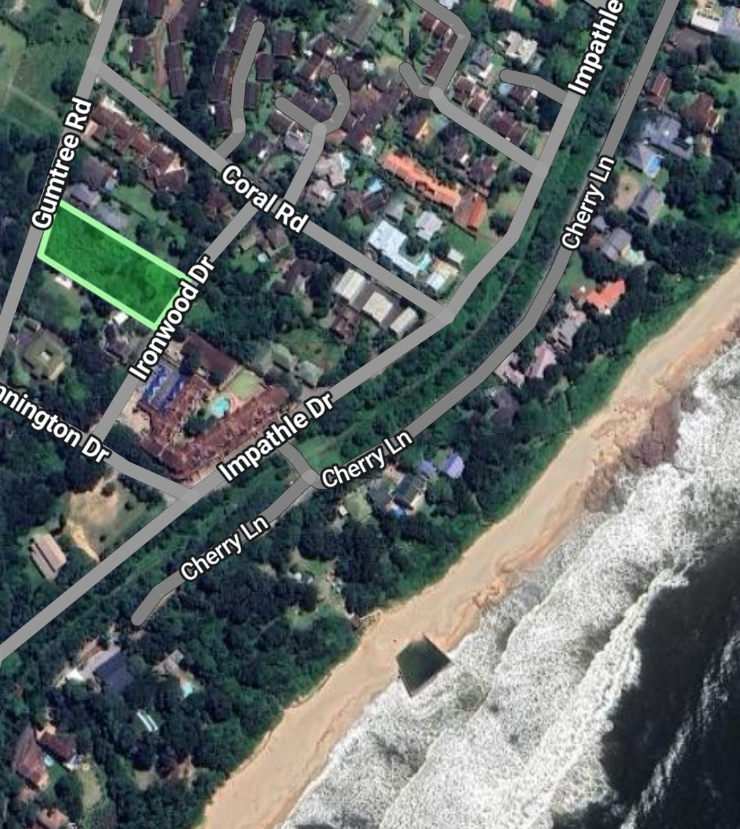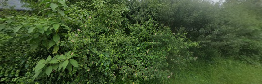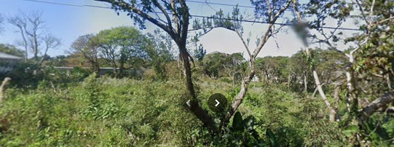 It is a double stand with some brush and tress on it. Located on a quiet street, and flanked by another.