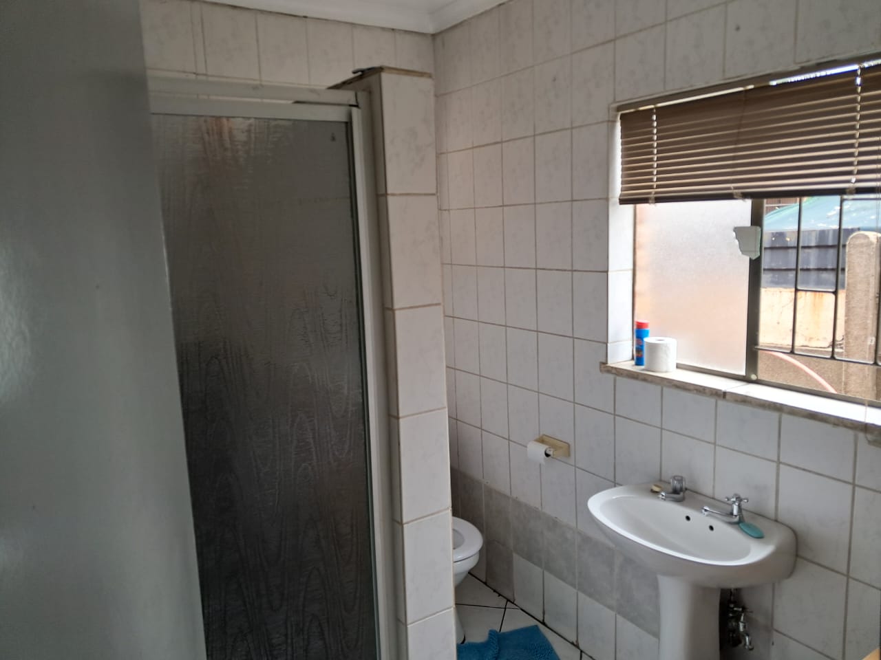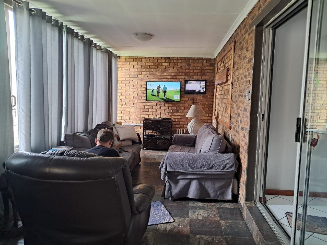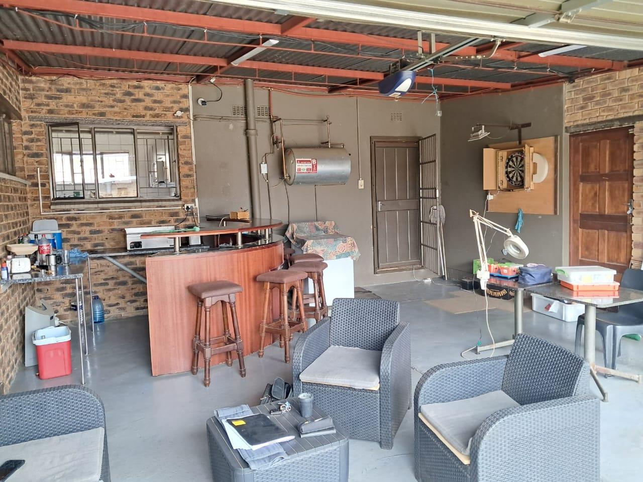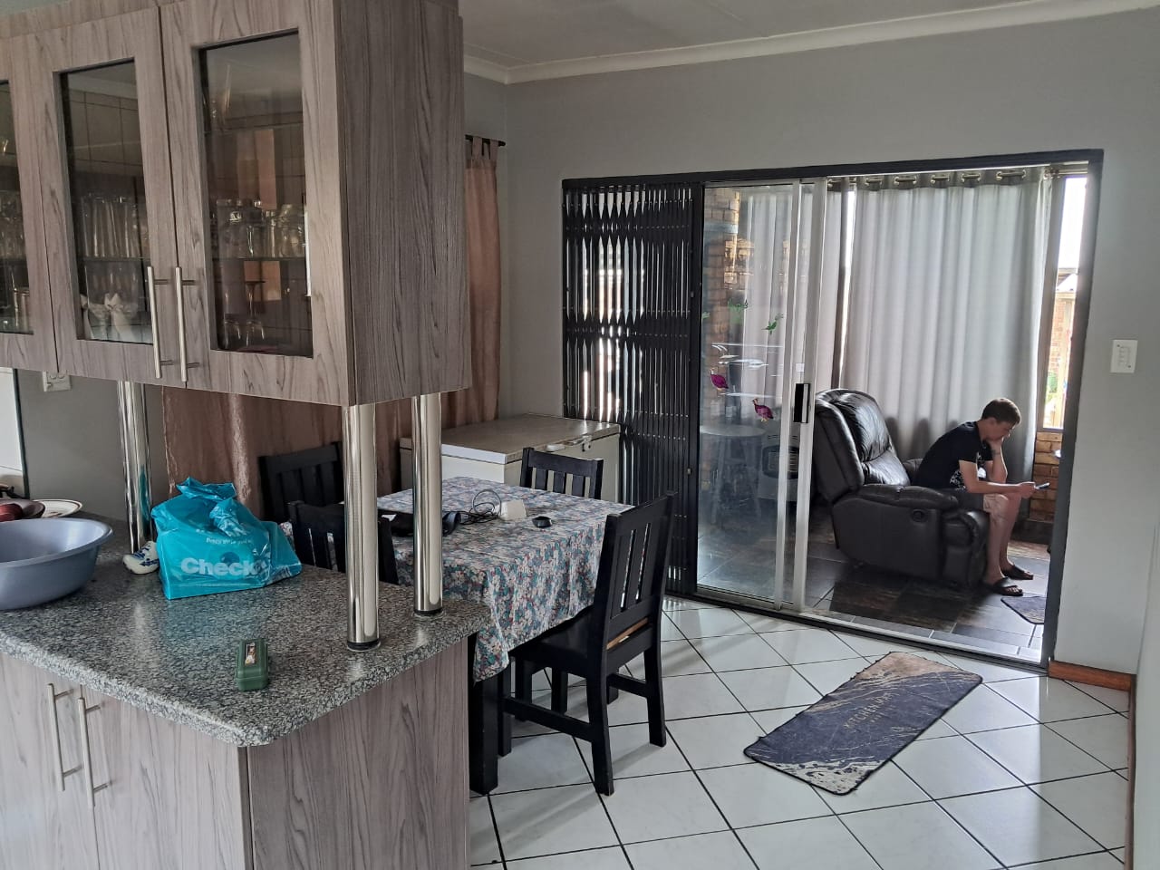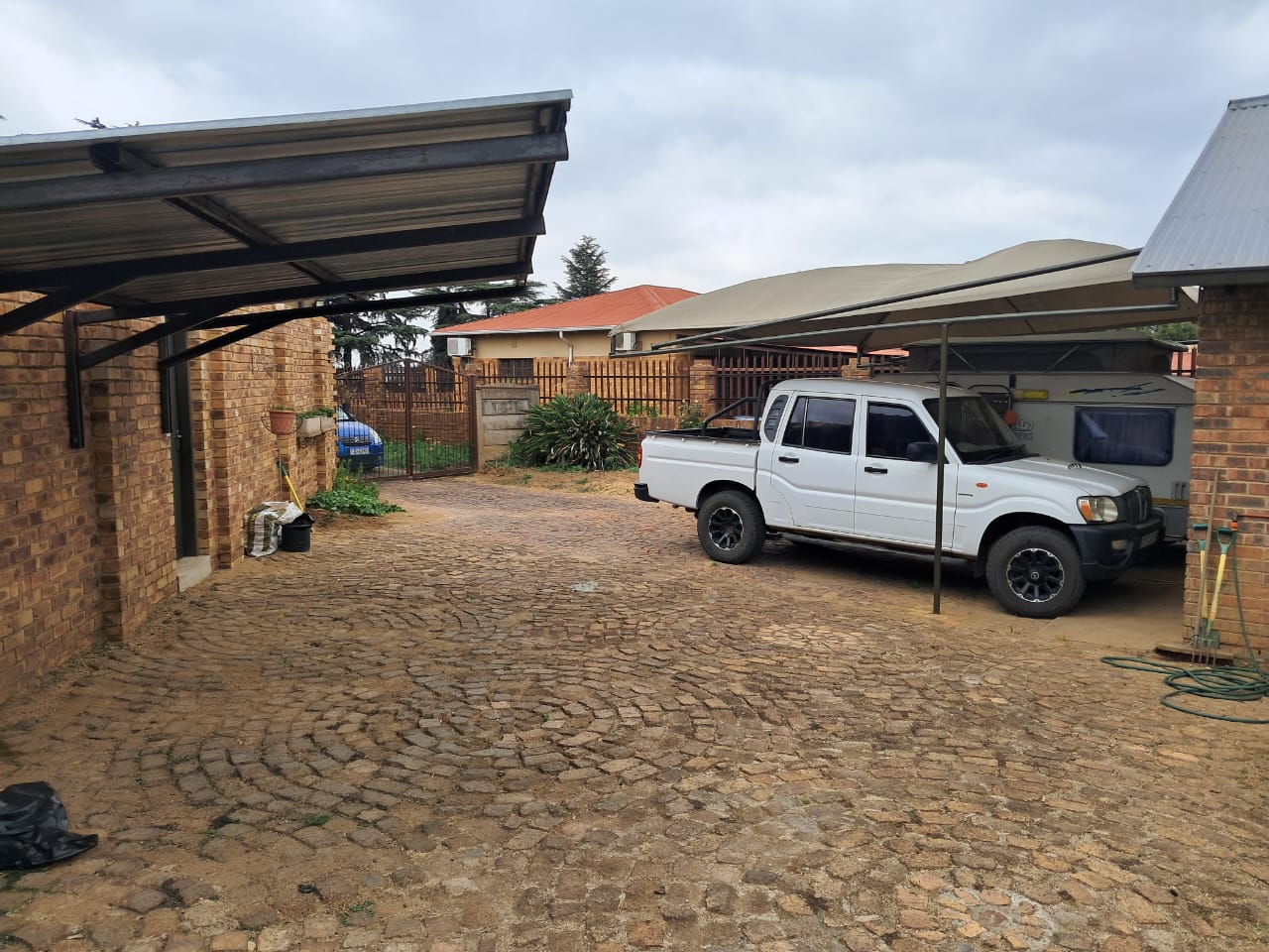 The home features three bedrooms, each with built-in cupboards (BIC), and two modern bathrooms, including an en-suite in the master bedroom. A convenient laundry and scullery offer extra functionality. The property includes three staff quarters, a carport, and a double garage for parking.
