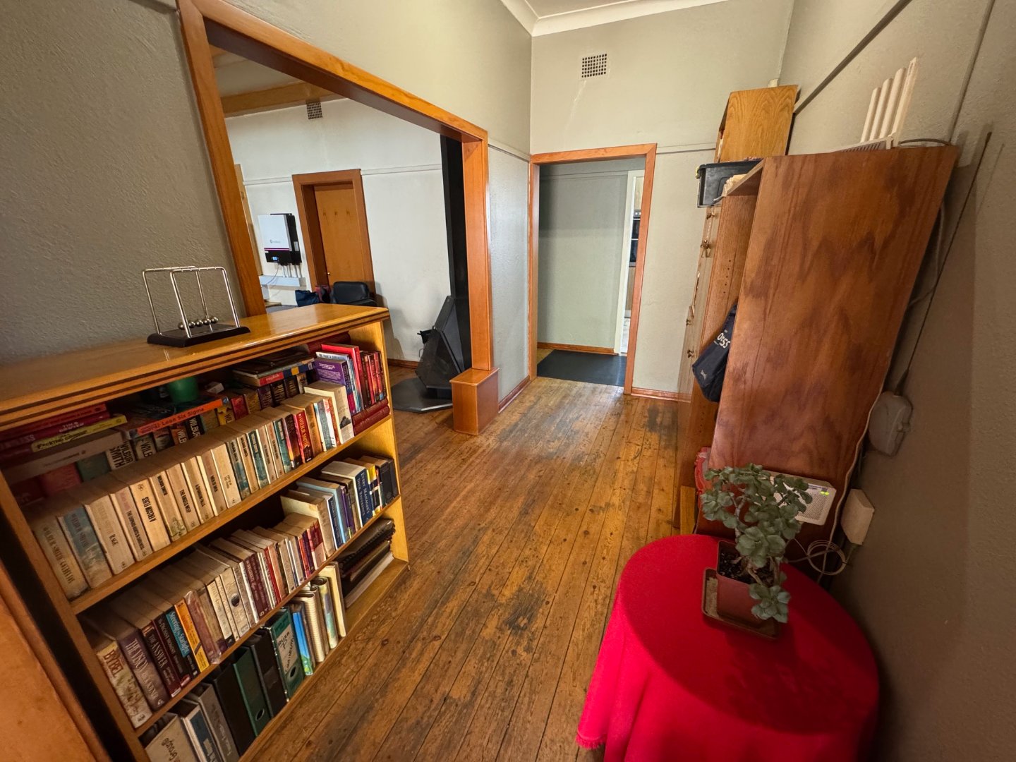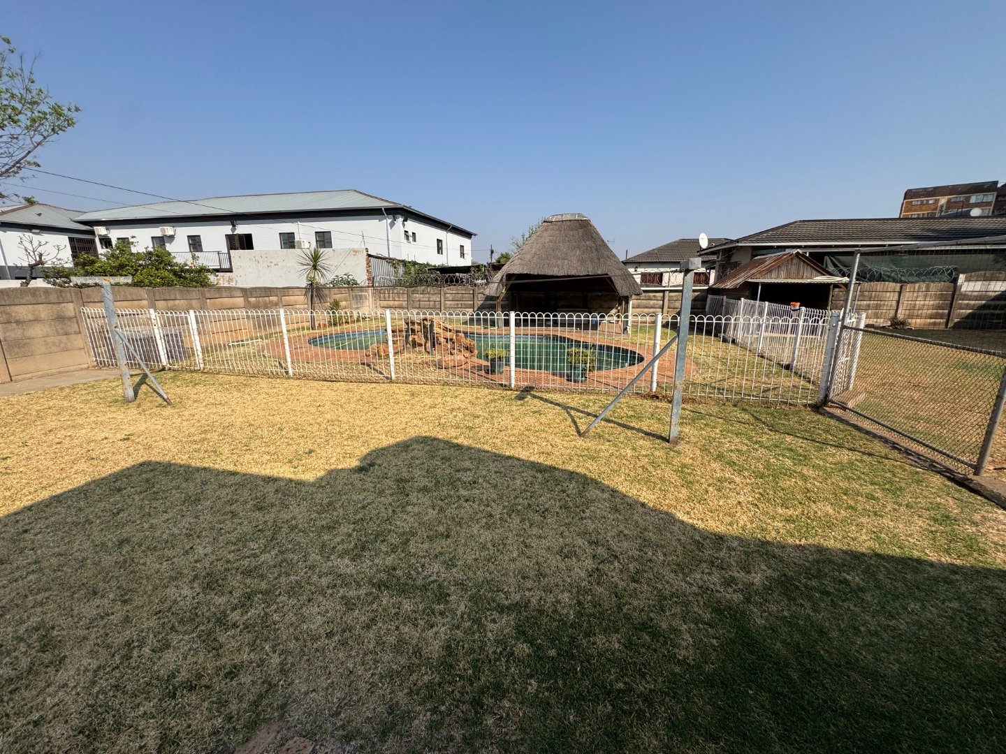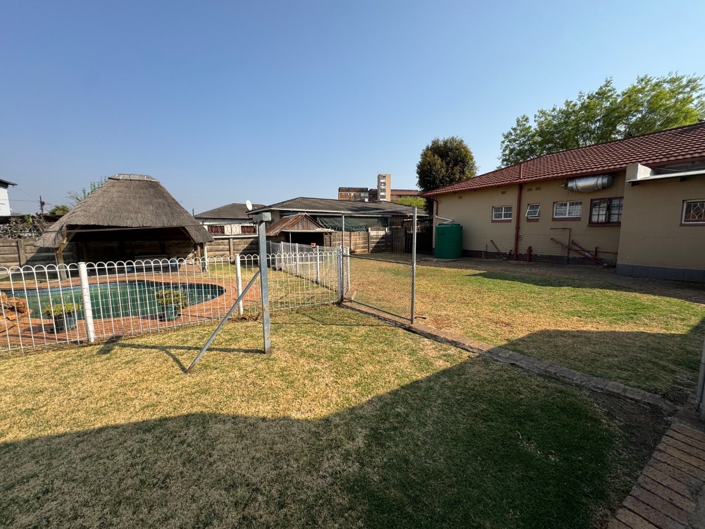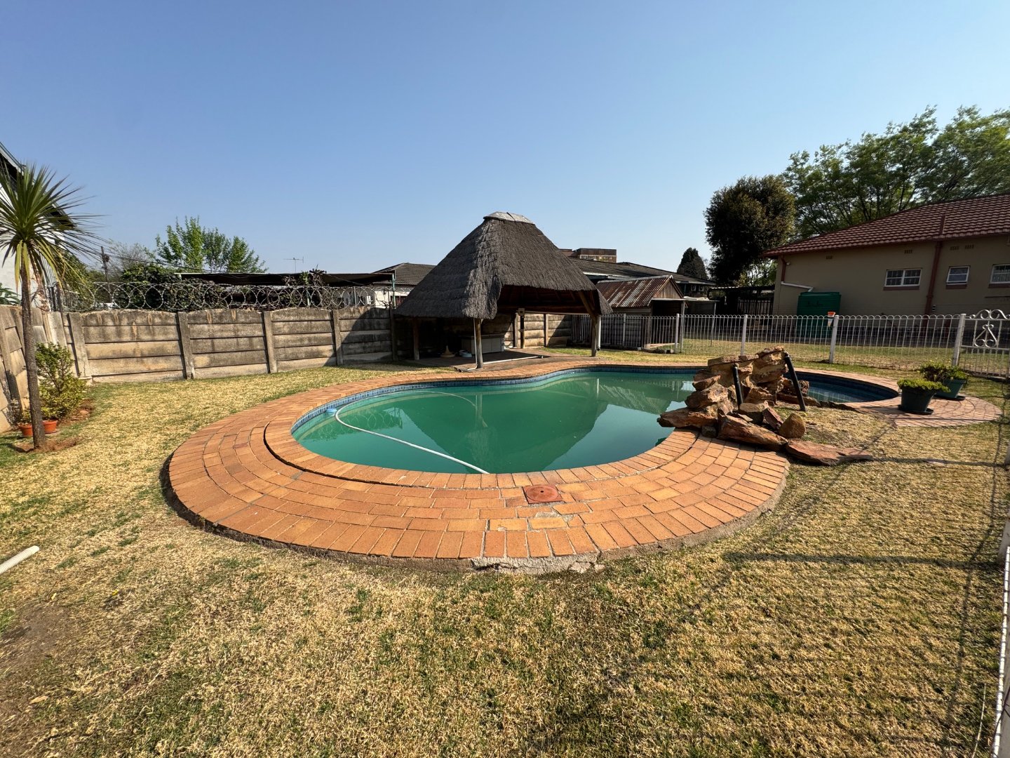 The kitchen is functional and neatly laid out, complemented by a separate laundry room. A dedicated study provides the ideal work-from-home space. The home includes 1 bathroom and ample potential to expand. Outdoor living is a highlight, with a sparkling pool and plenty of parking, including 3 garages and 1 carport.