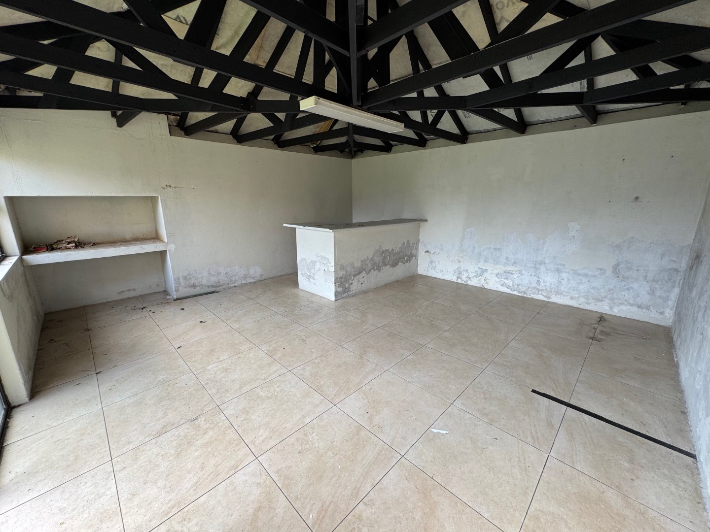 The well-equipped kitchen opens into a dining room, making mealtime gatherings easy and enjoyable. With two bathrooms, this home ensures convenience for all residents. The four built-in cupboards provide plenty of storage space, keeping the home organized. A staff quarter adds extra practicality, while the two garages offer secure parking.