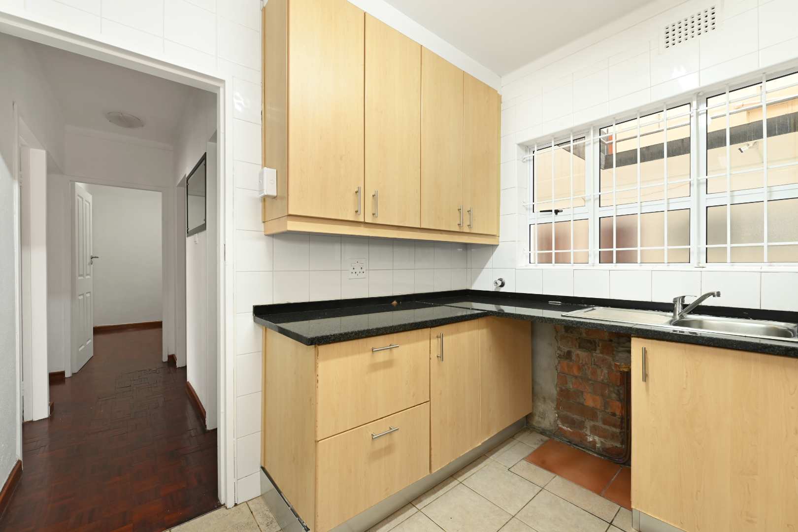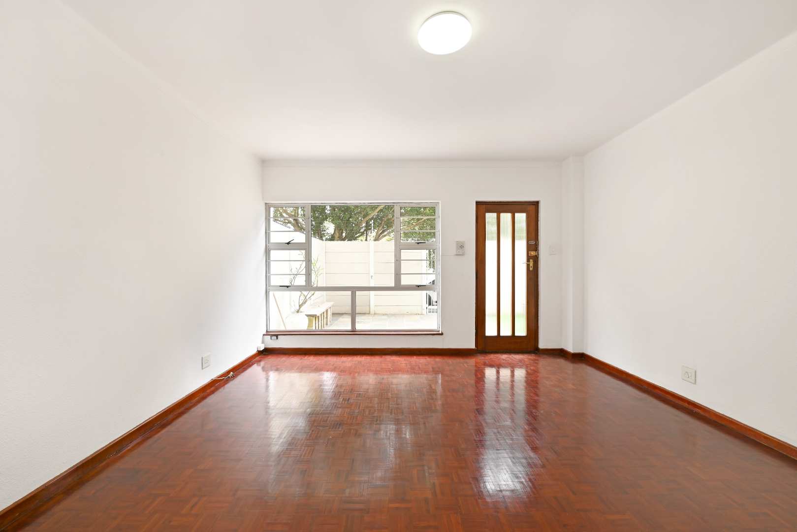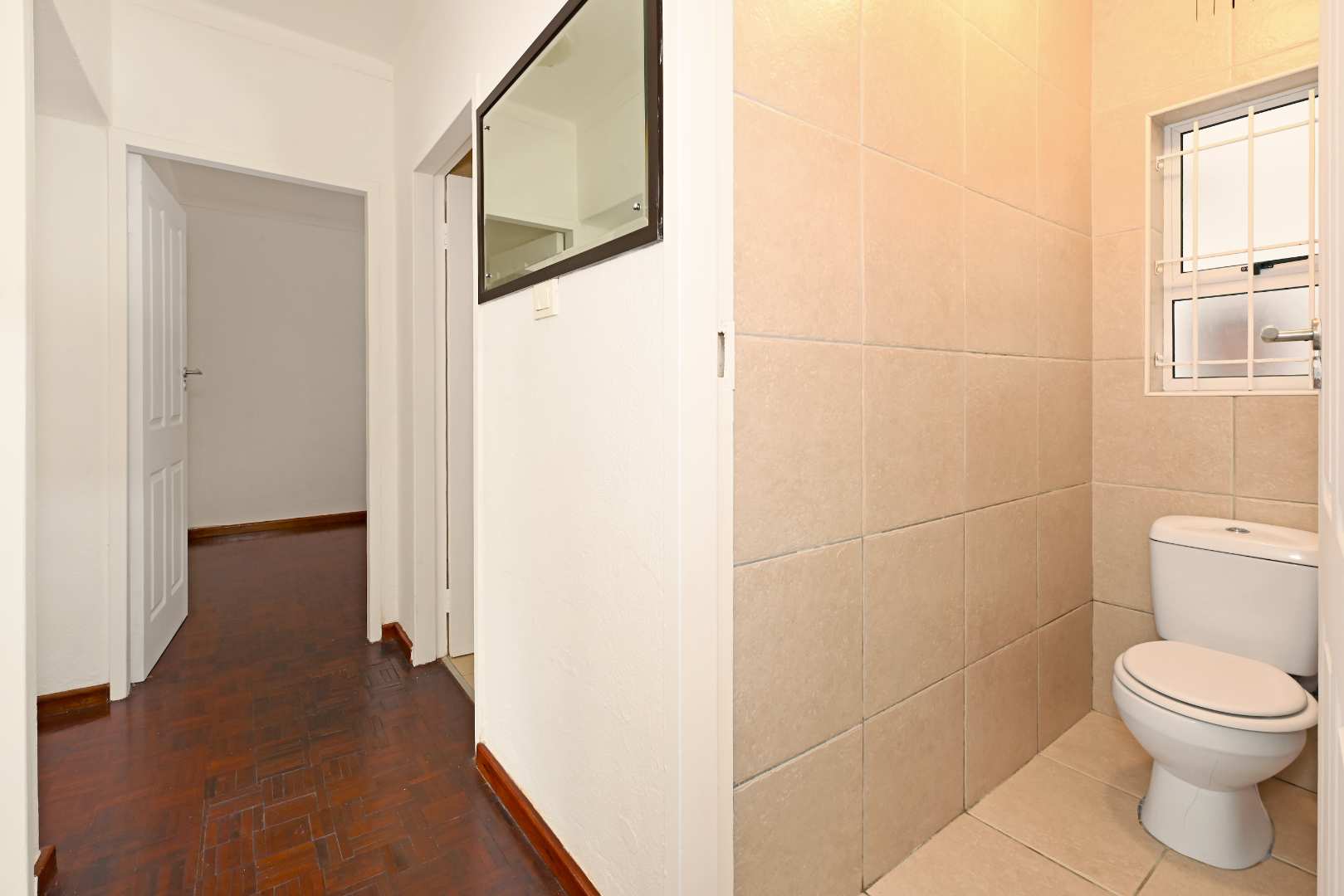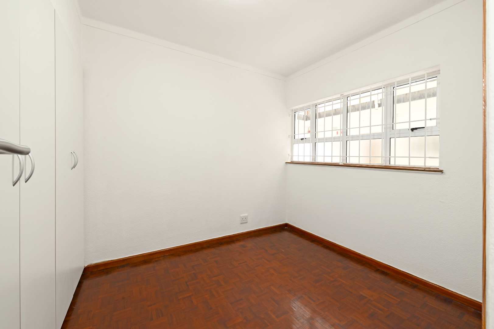 Step inside to a generously sized living area, where beautiful parquet flooring flows seamlessly into both bedrooms, adding warmth and timeless appeal. The aluminium windows invite in natural light, creating a bright and welcoming atmosphere throughout.