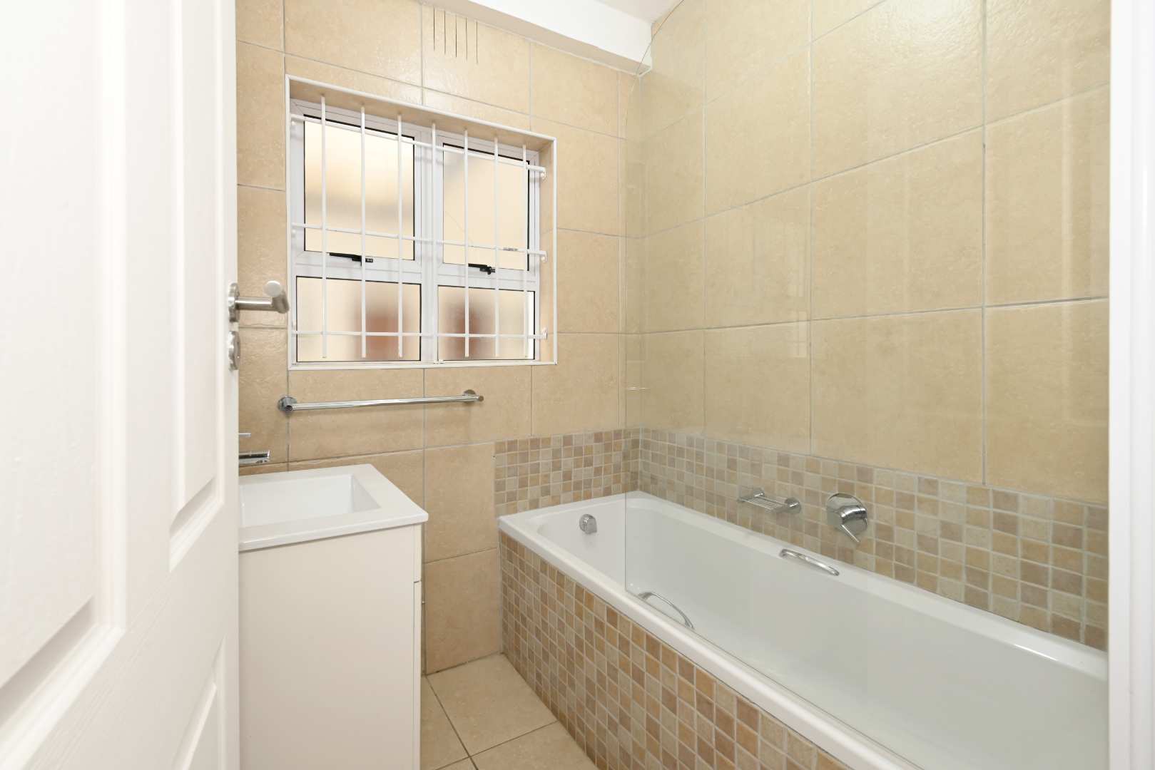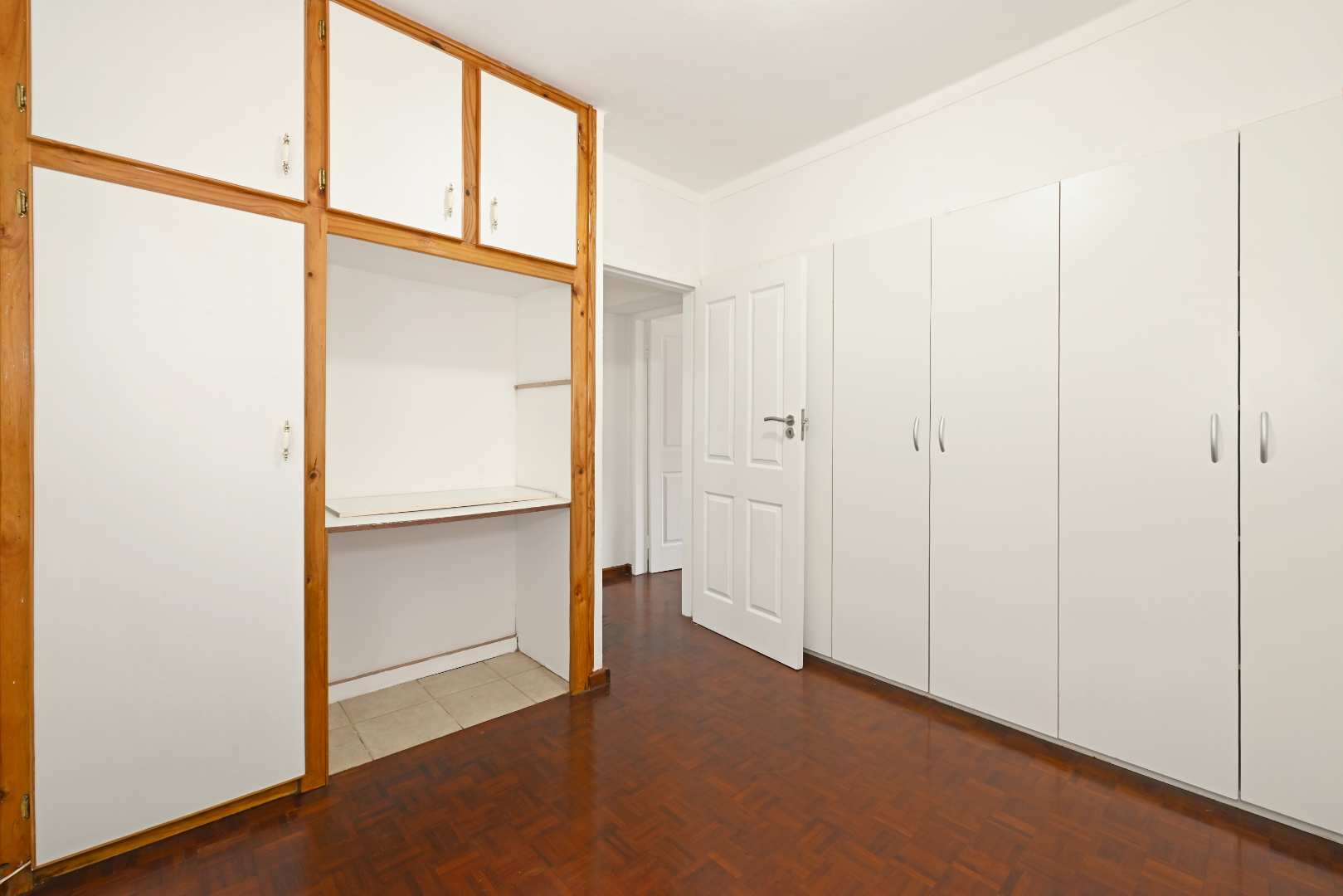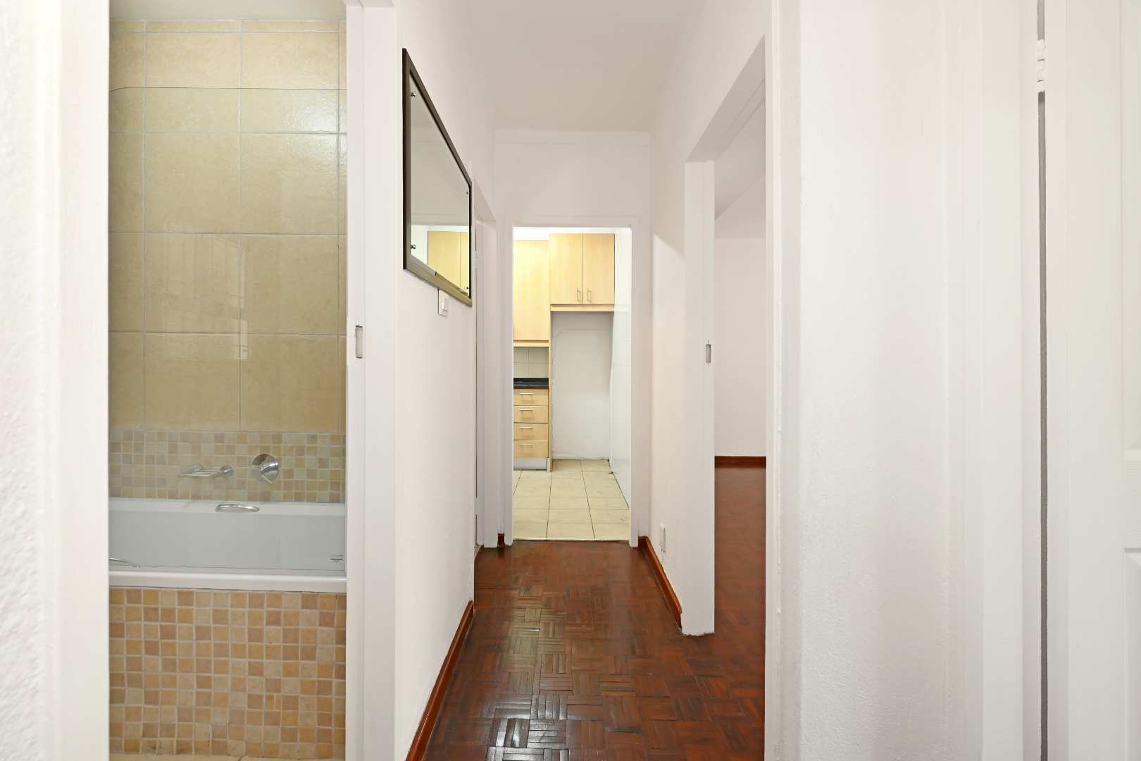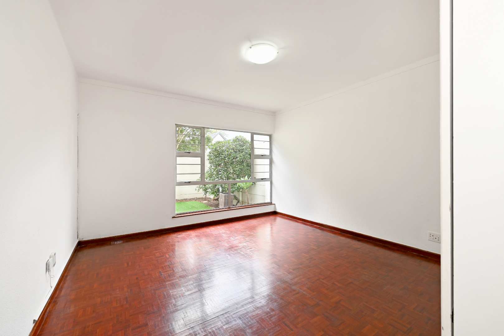 Step inside to a generously sized living area, where beautiful parquet flooring flows seamlessly into both bedrooms, adding warmth and timeless appeal. The aluminium windows invite in natural light, creating a bright and welcoming atmosphere throughout.