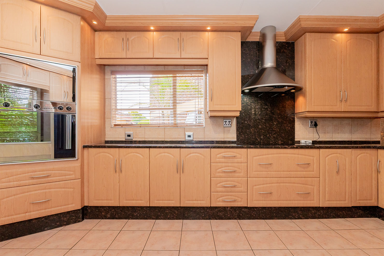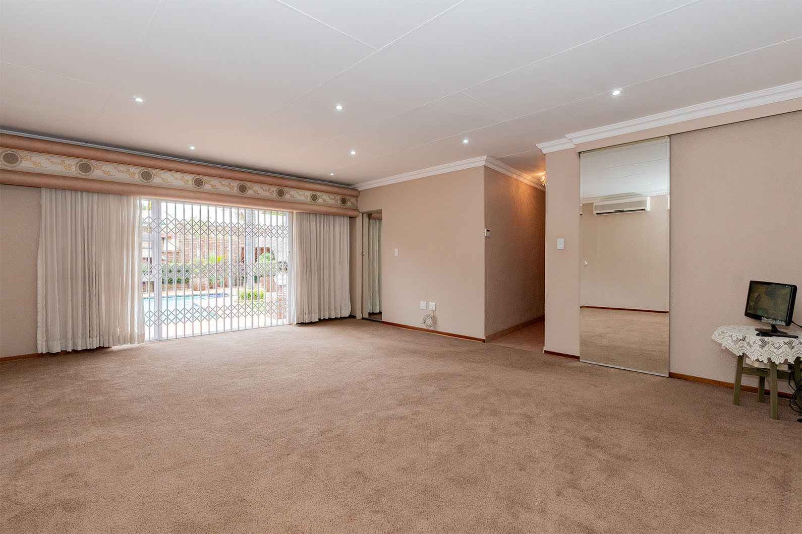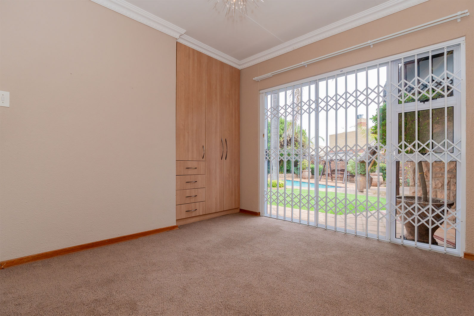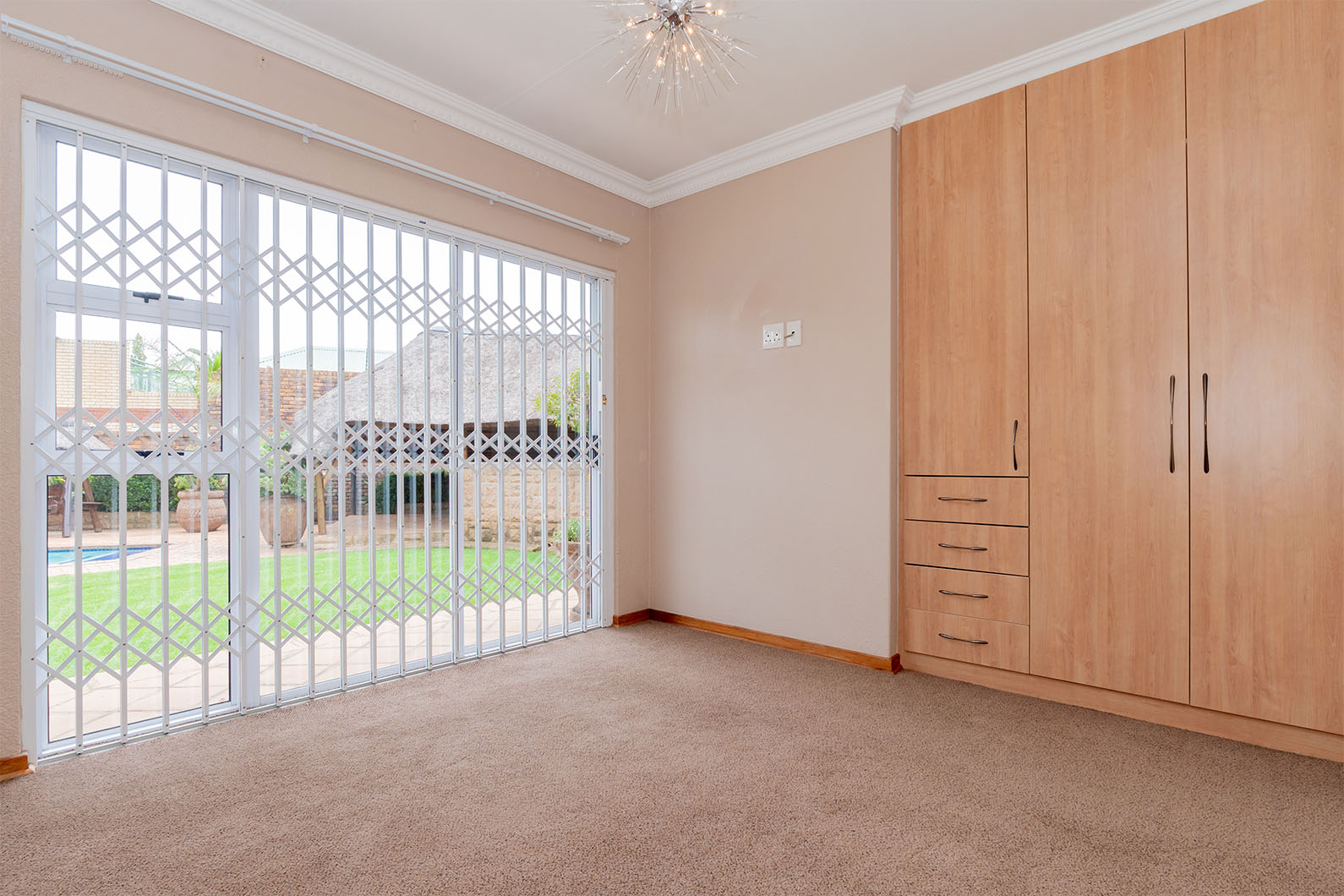 All 4 bedrooms feature built-in cupboards, while sliding doors open onto the sparkling swimming pool area, creating a light and airy atmosphere throughout the home. The main bedroom offers a private en-suite bathroom and a walk-in closet. A second full bathroom includes both bath and shower, and an additional bathroom offers a bath only for added convenience.