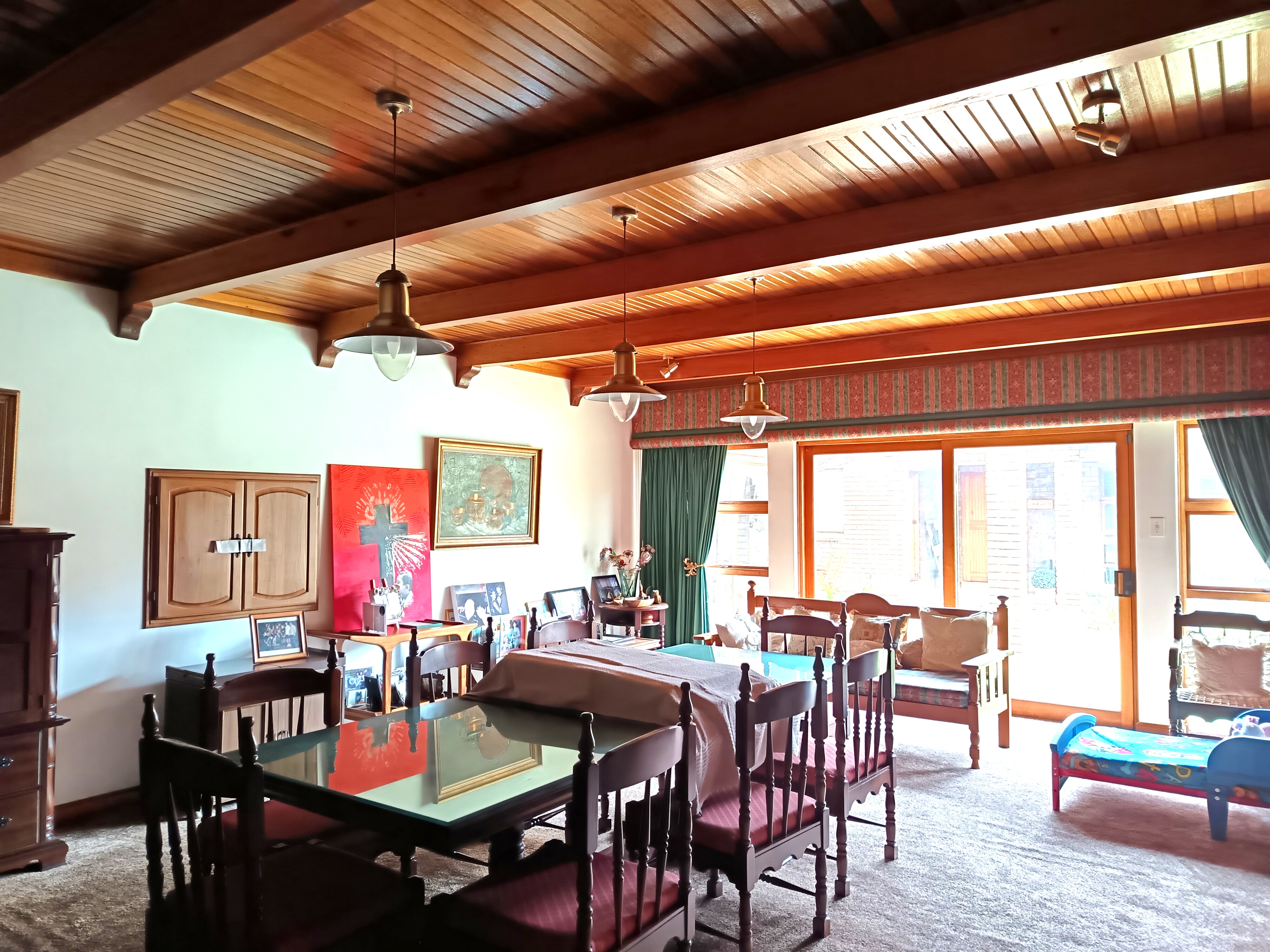 Formal lounge, formal dining room, and TV/family lounge, all flowing seamlessly and fitted with solid Meranti and Iroko double wooden doors, exposed beams.