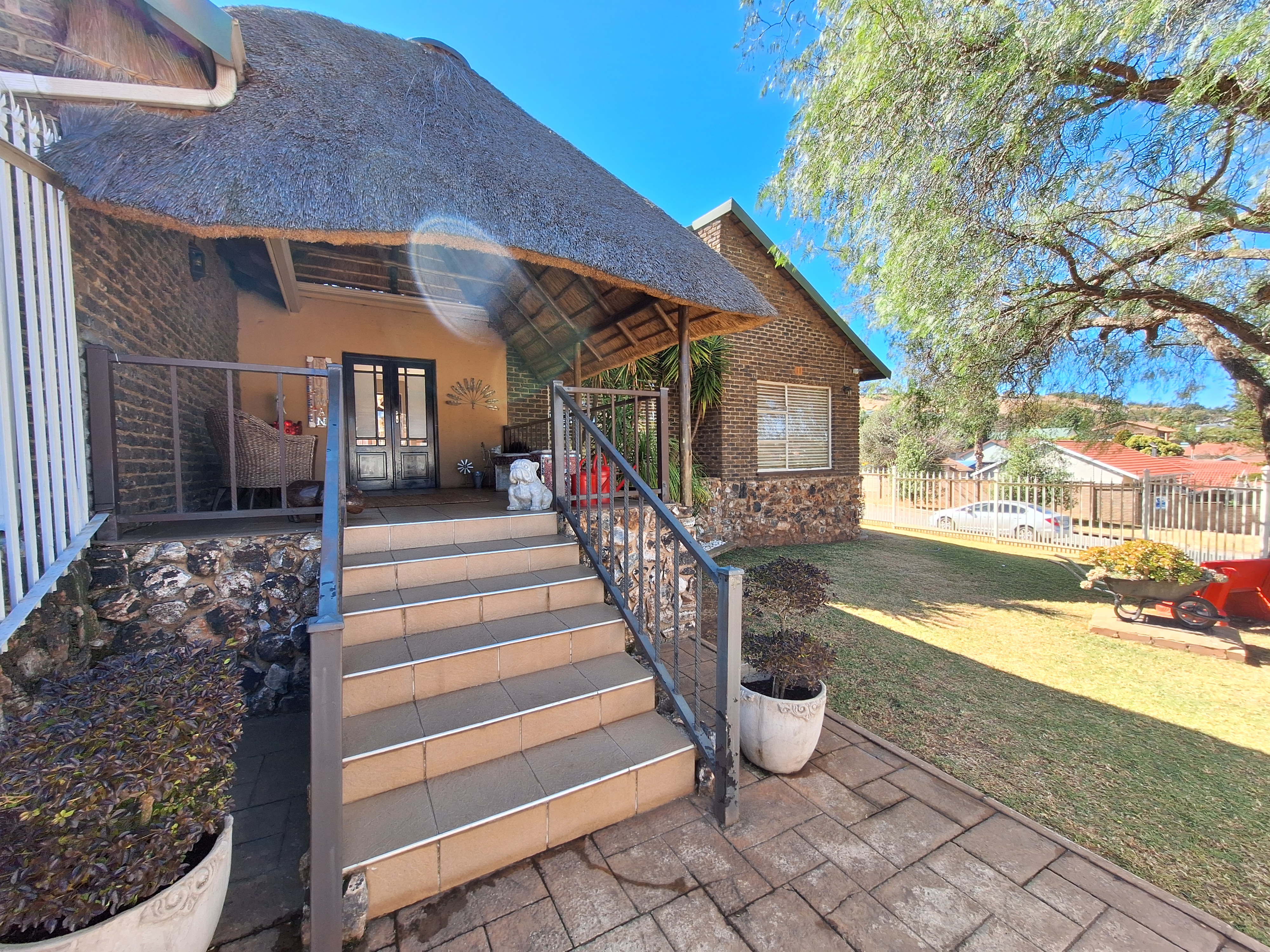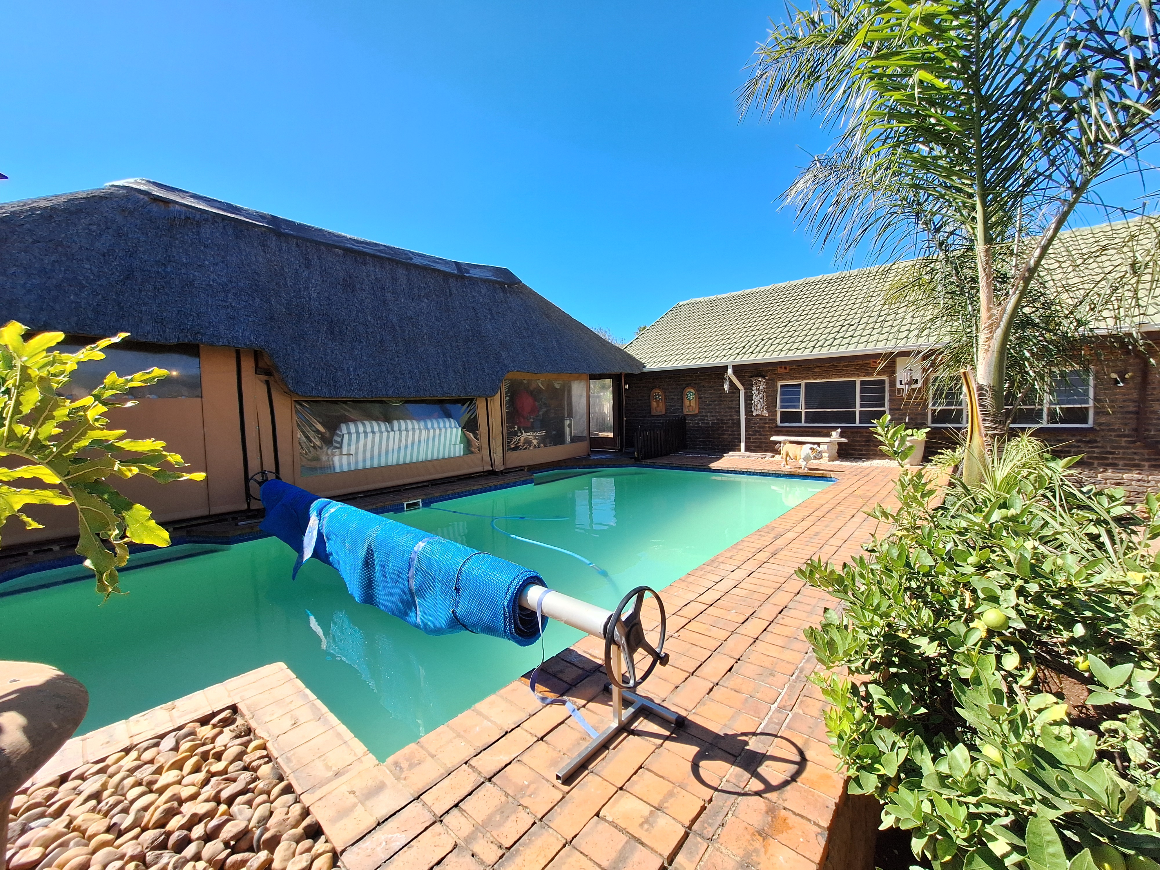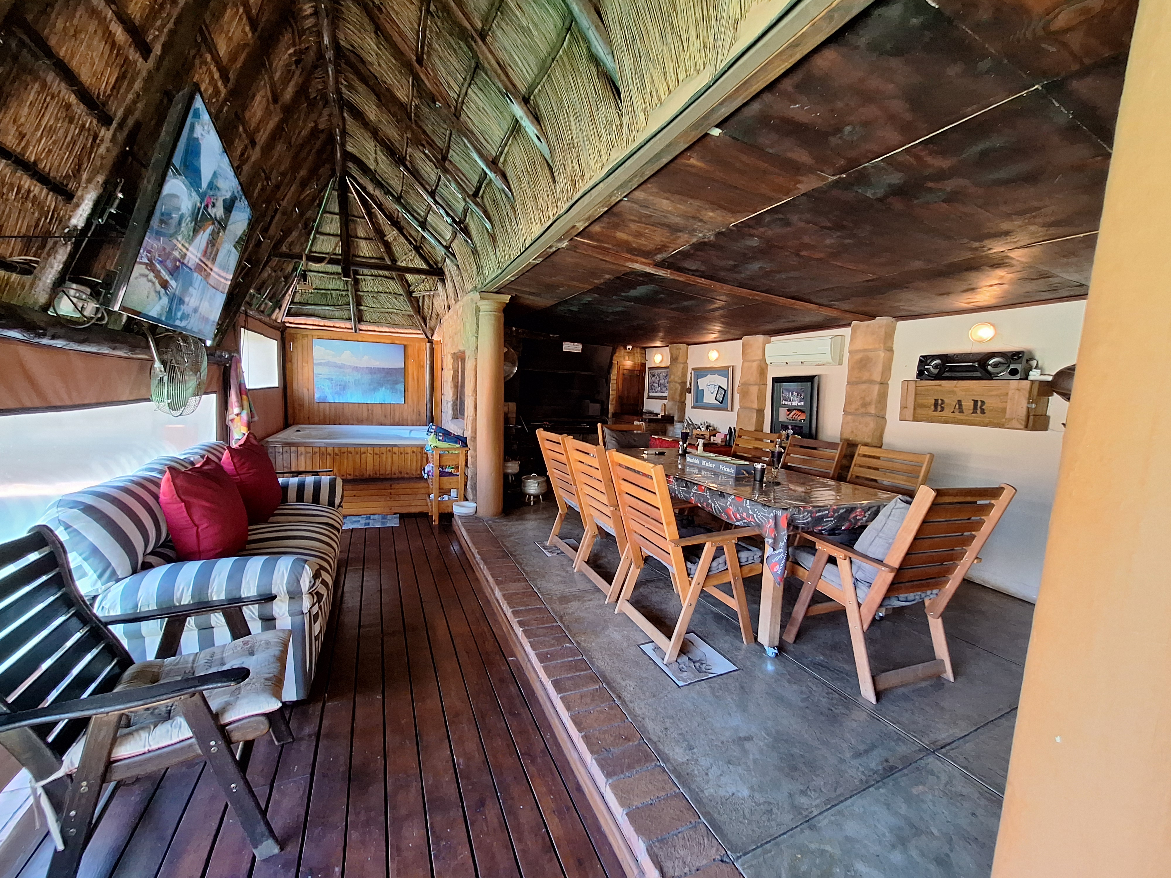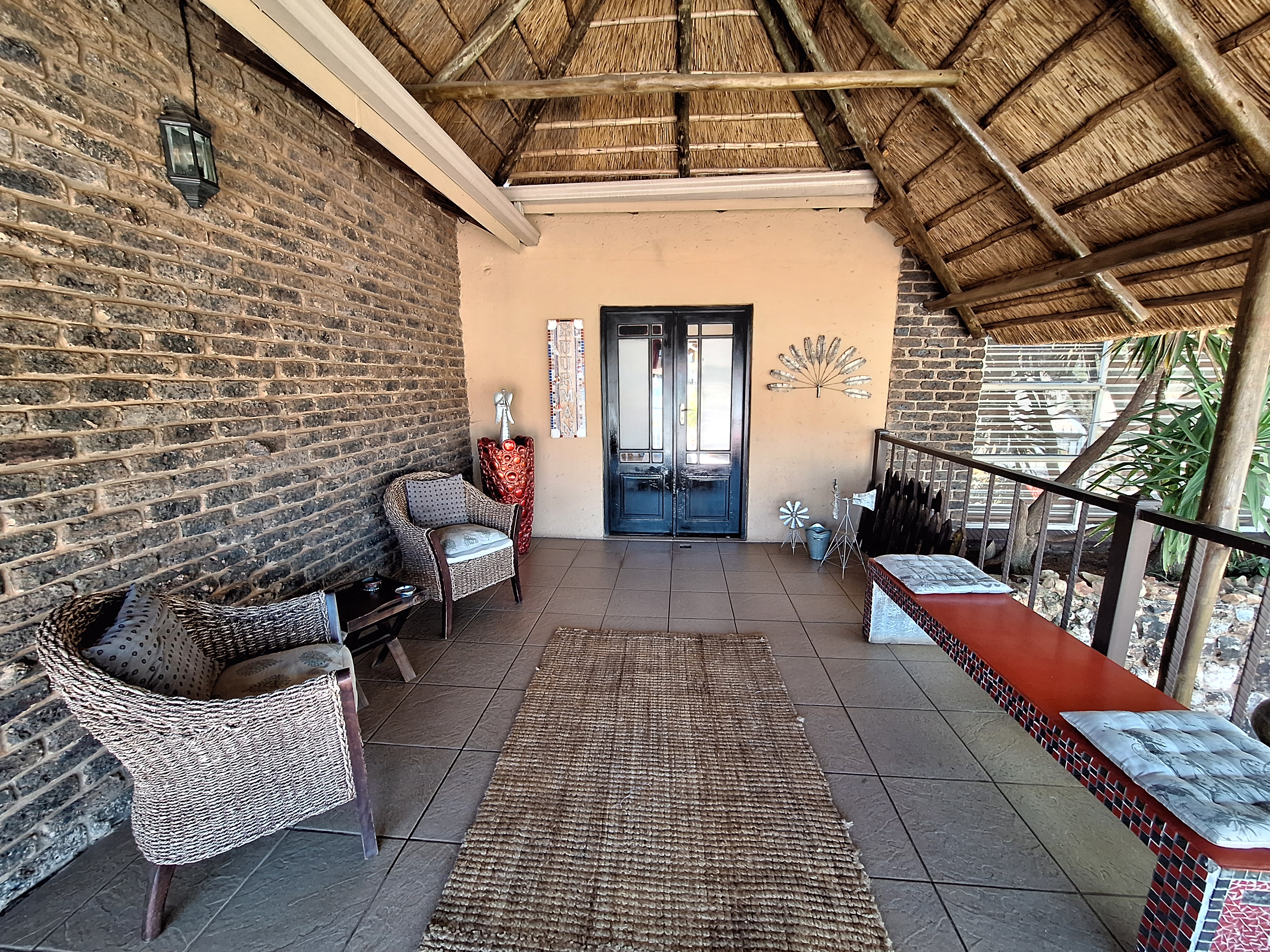 Welcome to this spacious and inviting family home, designed with comfort and functionality in mind. Step onto a generous, covered thatch patio that sets the tone for what’s to come. The home opens into a large entrance hall that flows effortlessly into the expansive lounge and open-plan dining area – ideal for hosting friends and family.