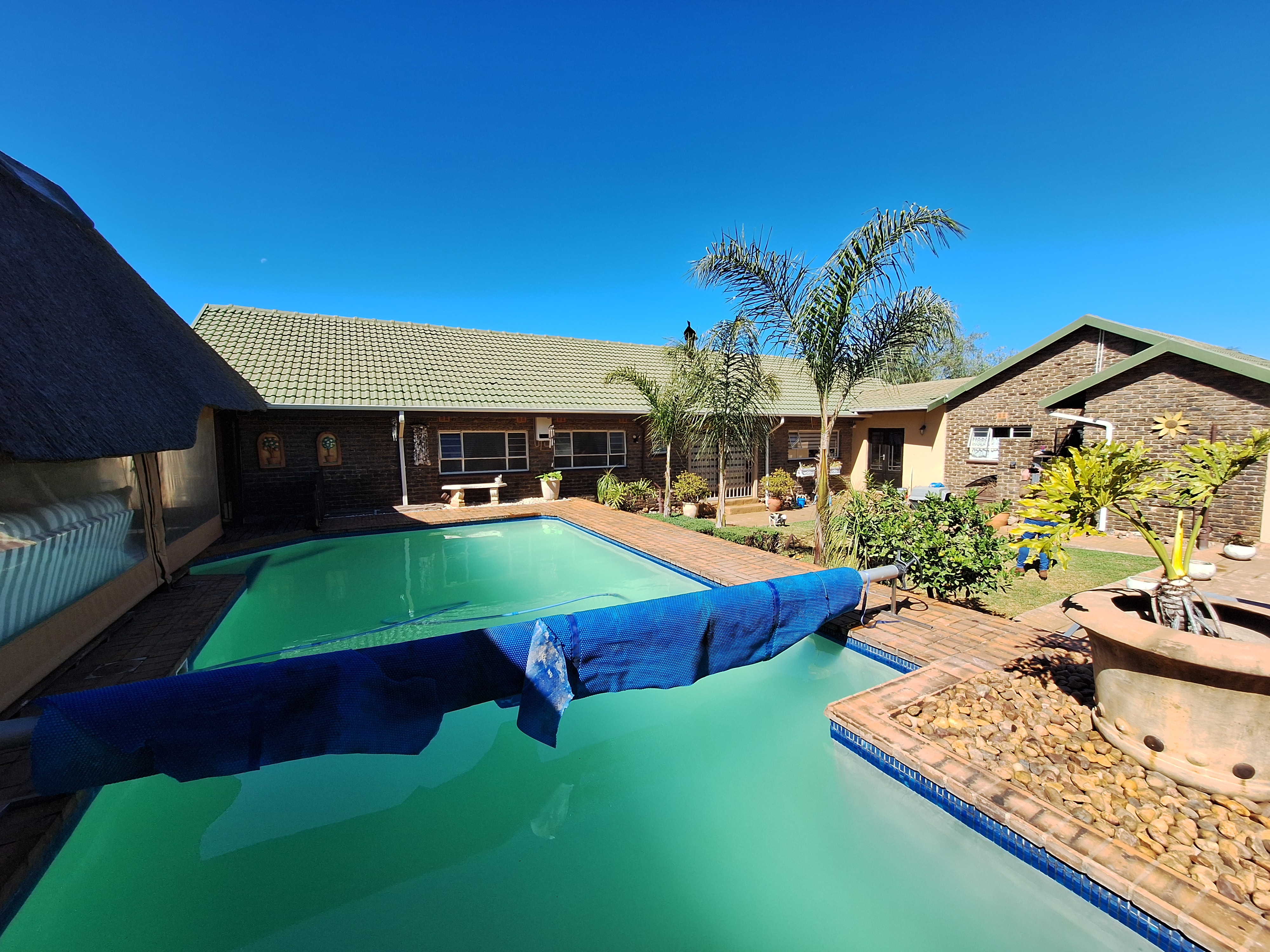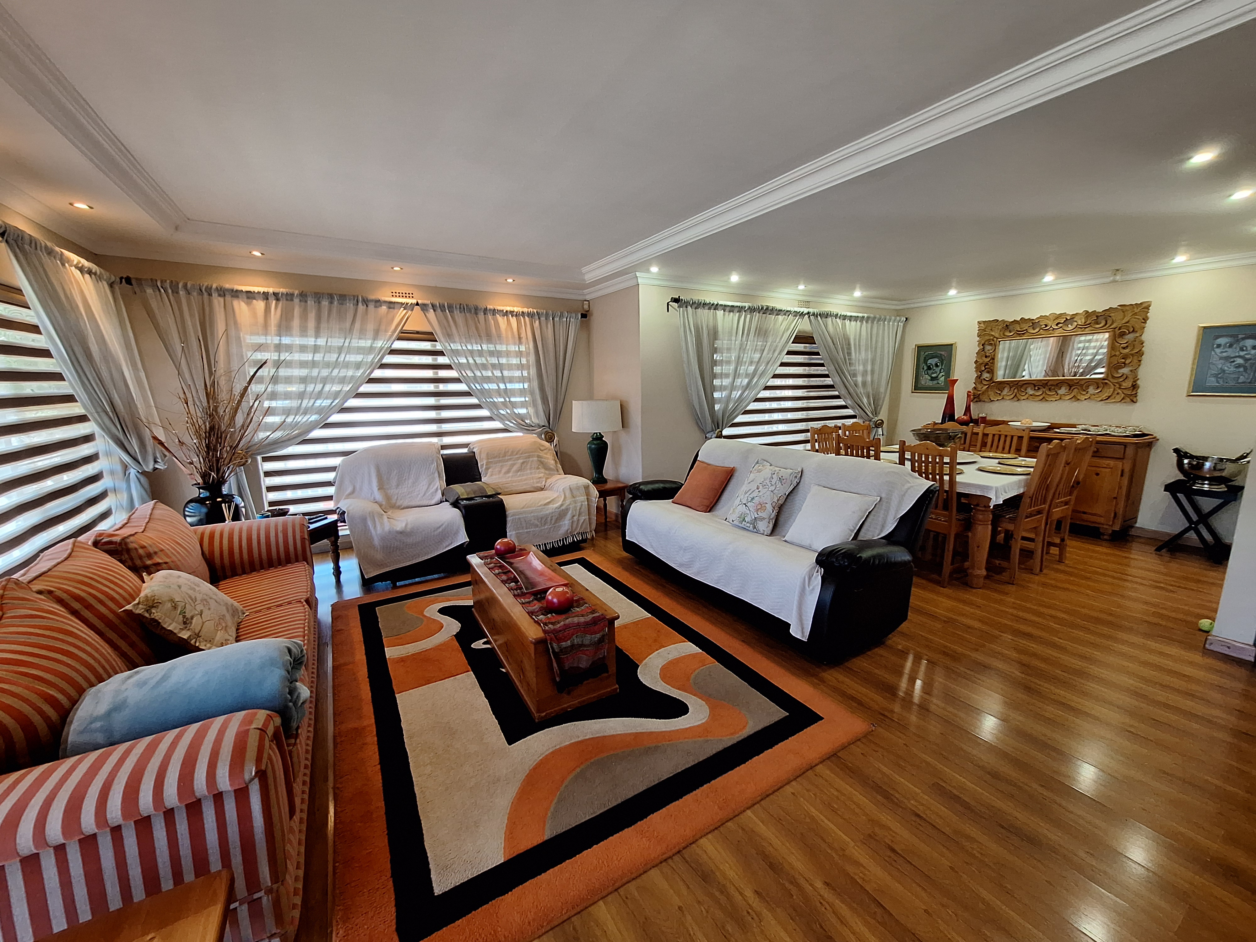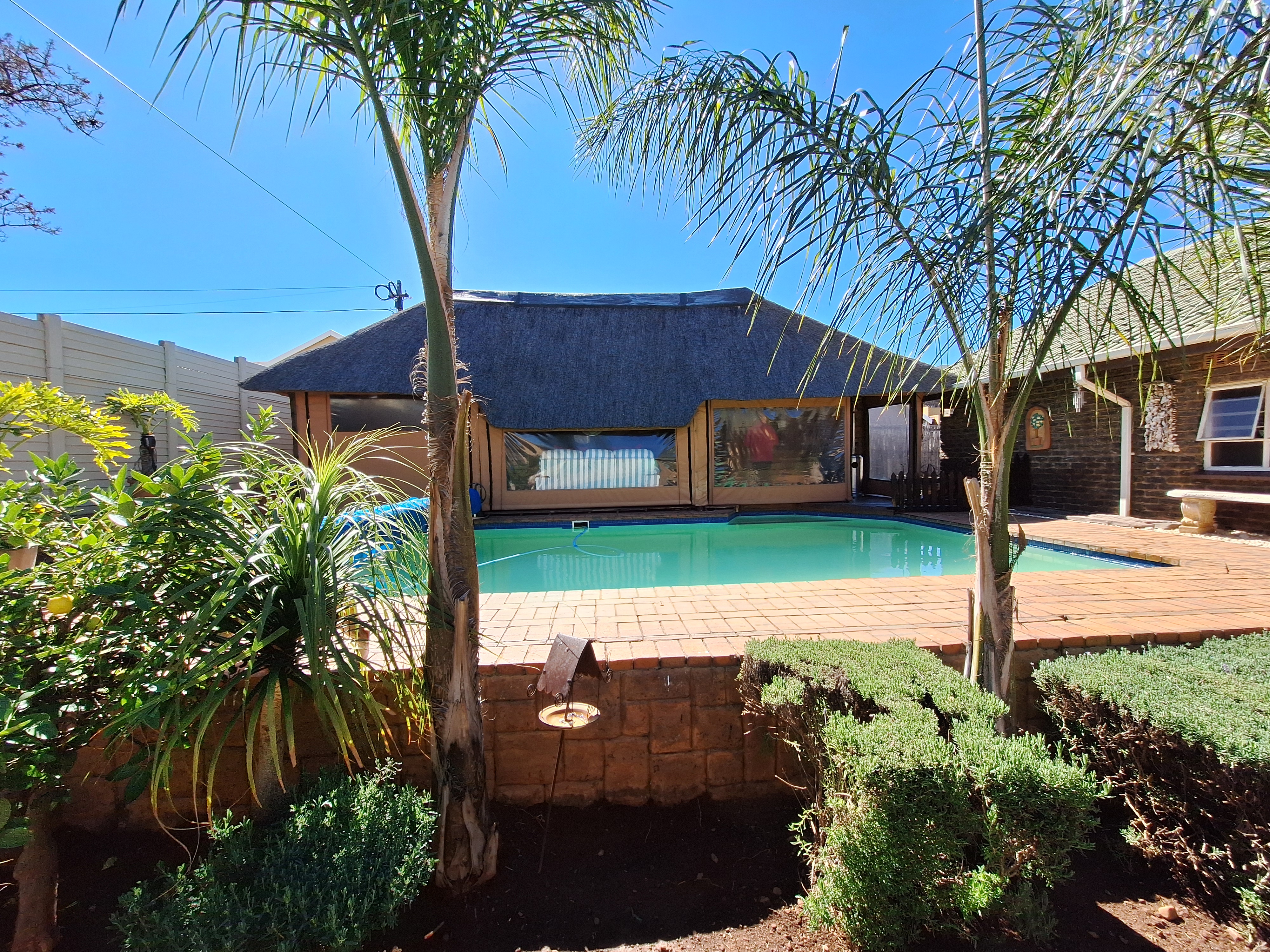 Welcome to this spacious and inviting family home, designed with comfort and functionality in mind. Step onto a generous, covered thatch patio that sets the tone for what’s to come. The home opens into a large entrance hall that flows effortlessly into the expansive lounge and open-plan dining area – ideal for hosting friends and family.