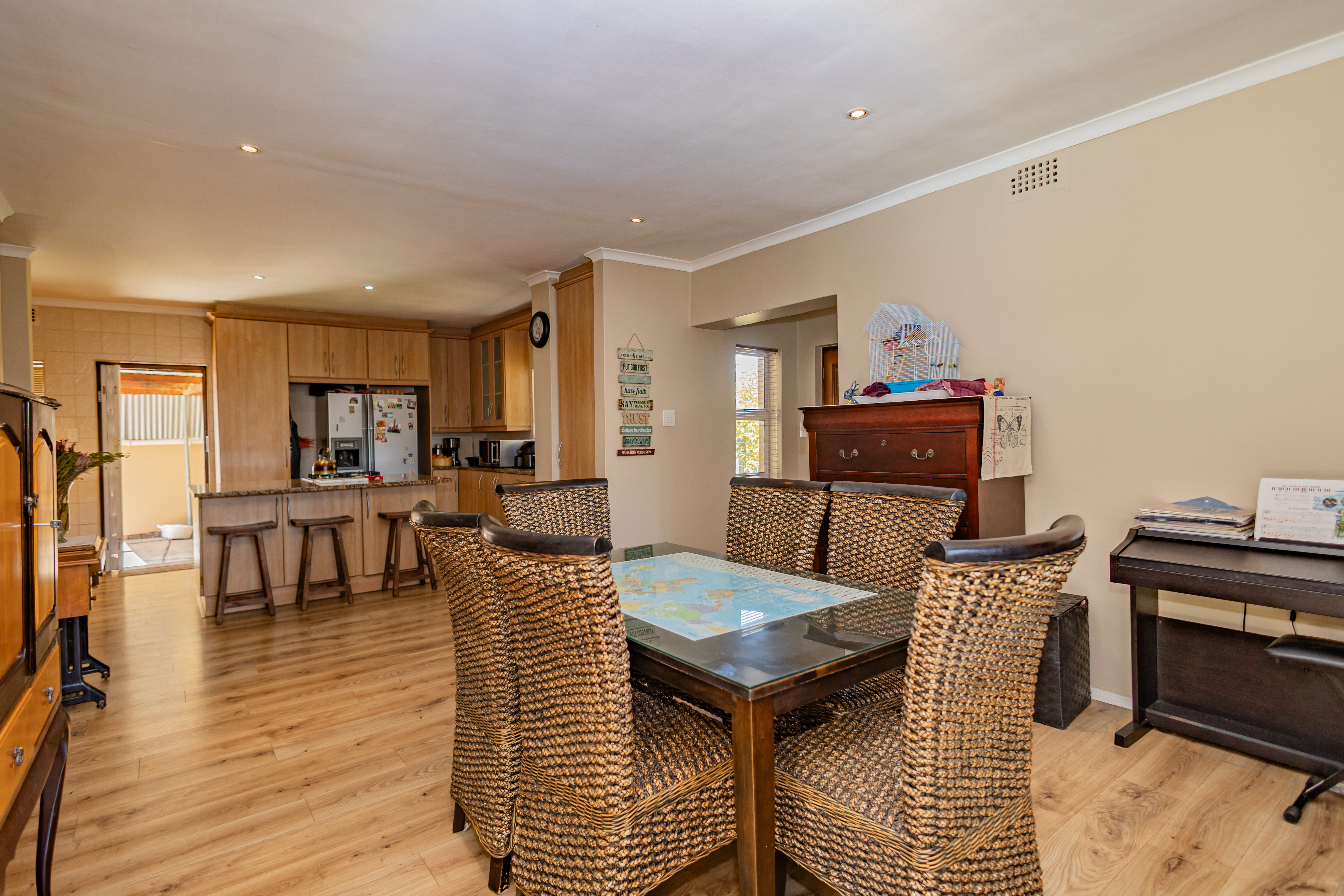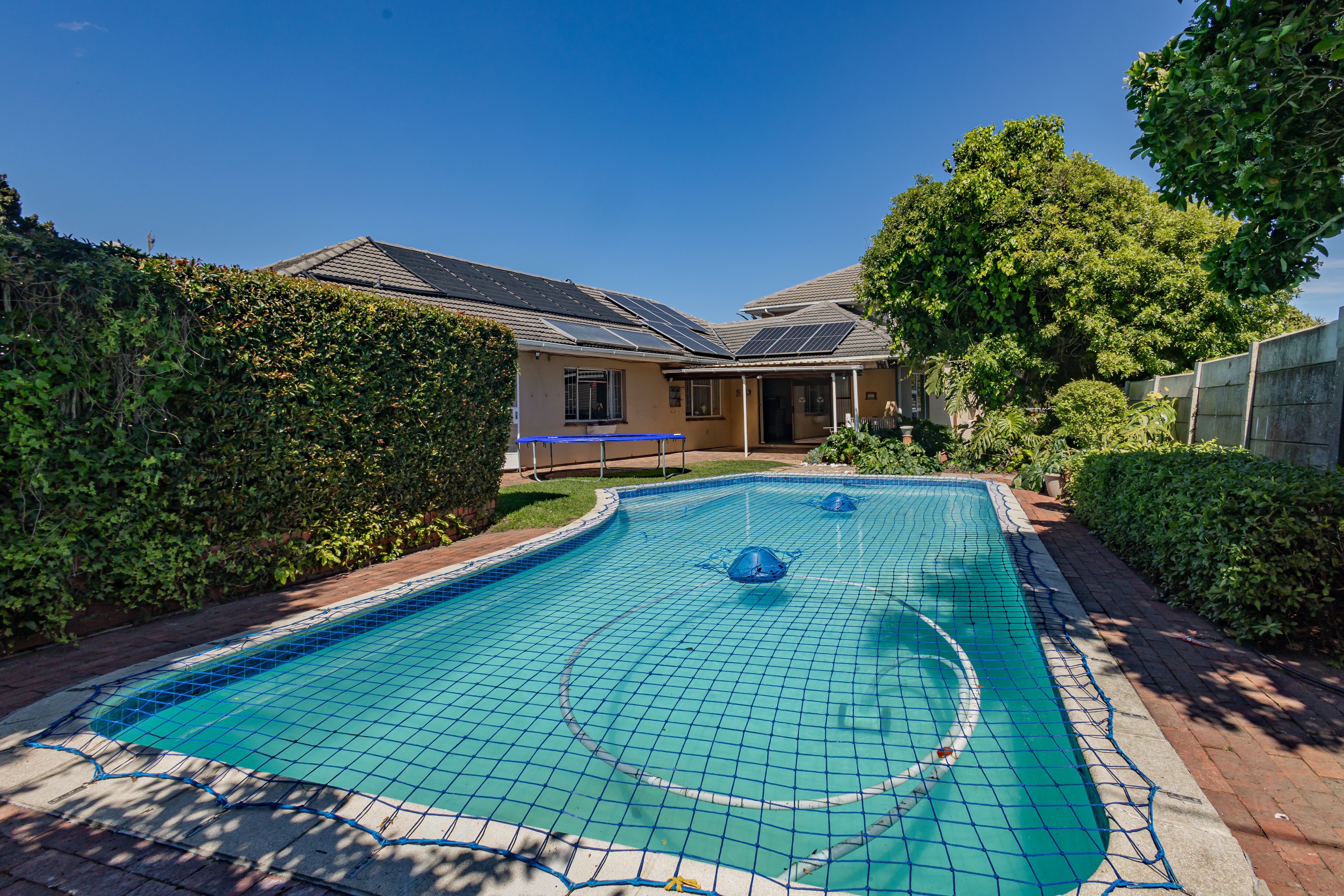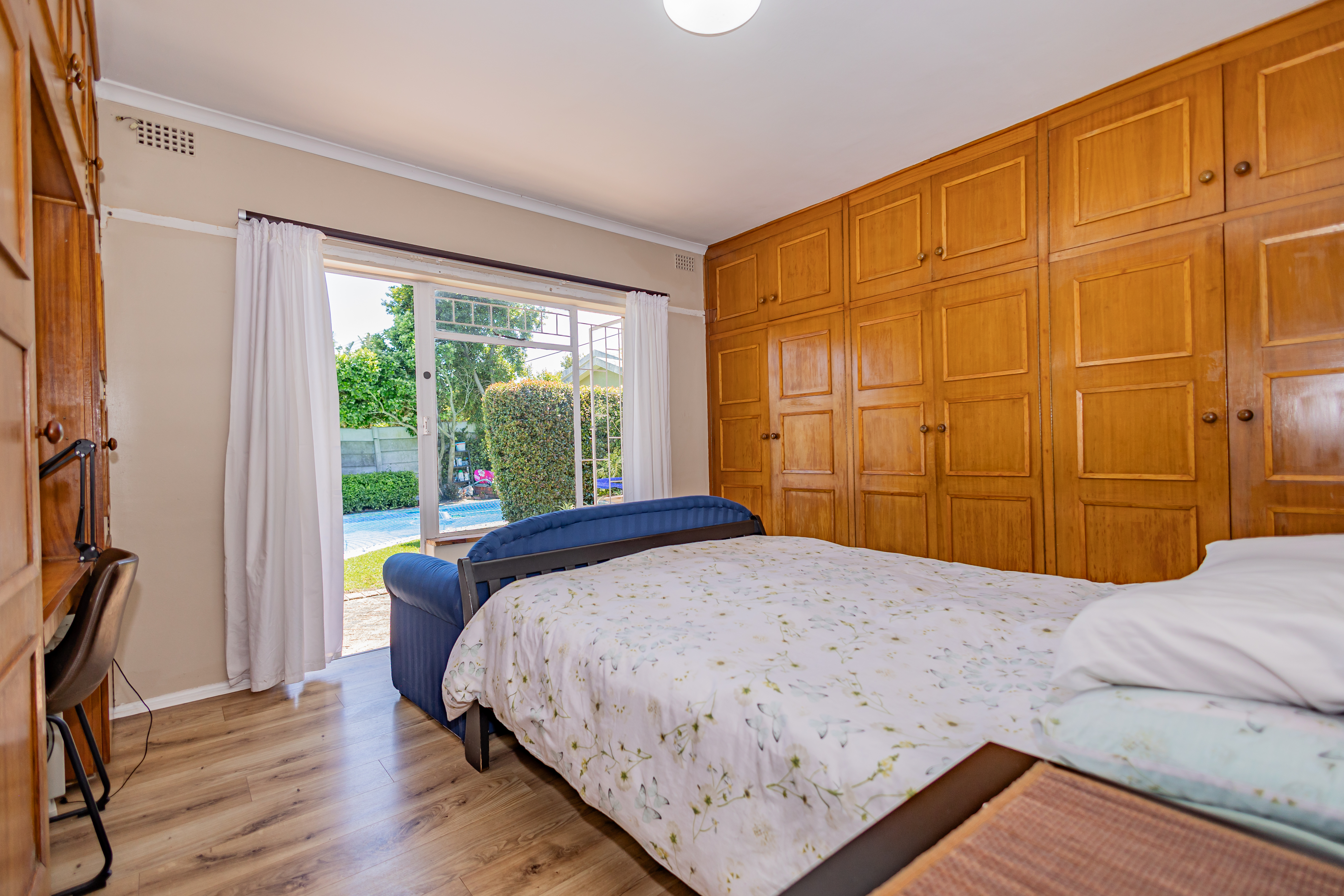 The open-plan lounge and dining area flow seamlessly onto a private, established garden featuring a sparkling swimming pool – perfect for entertaining or relaxing with the family. The granite-fitted kitchen comes complete with a gas hob, electric oven and ample storage space. Adjacent is a large, separate laundry room and staff accommodation with shower and toilet.