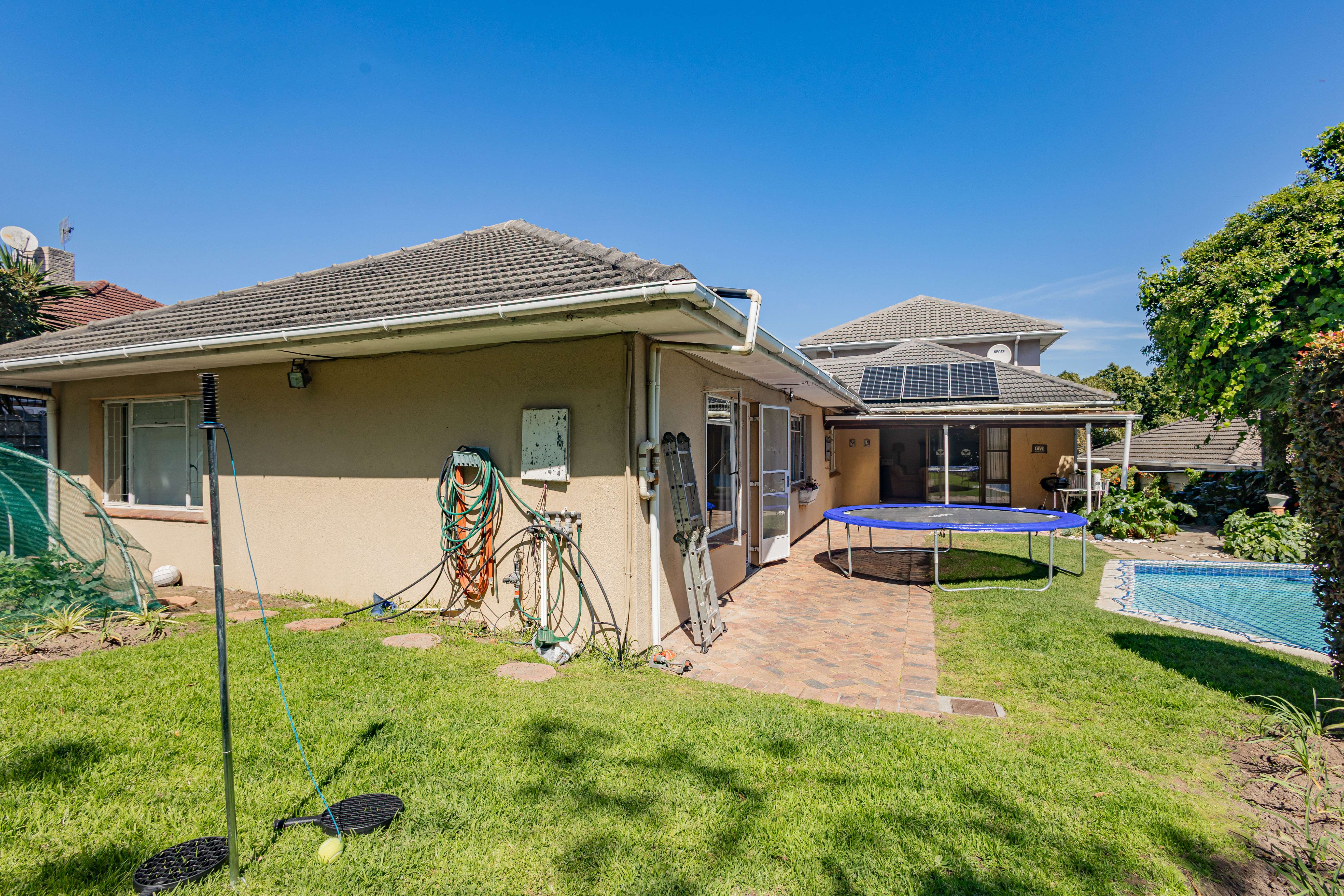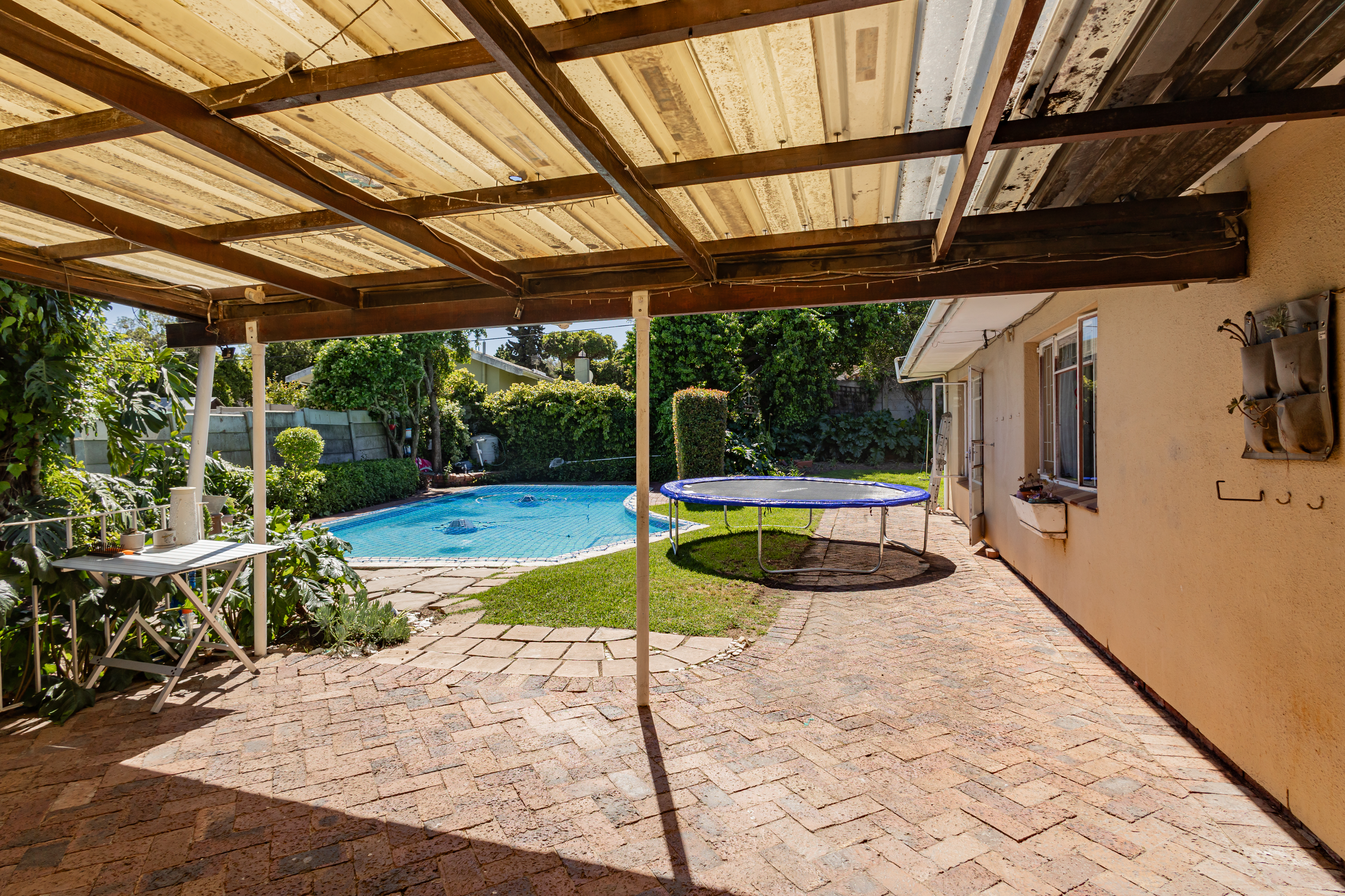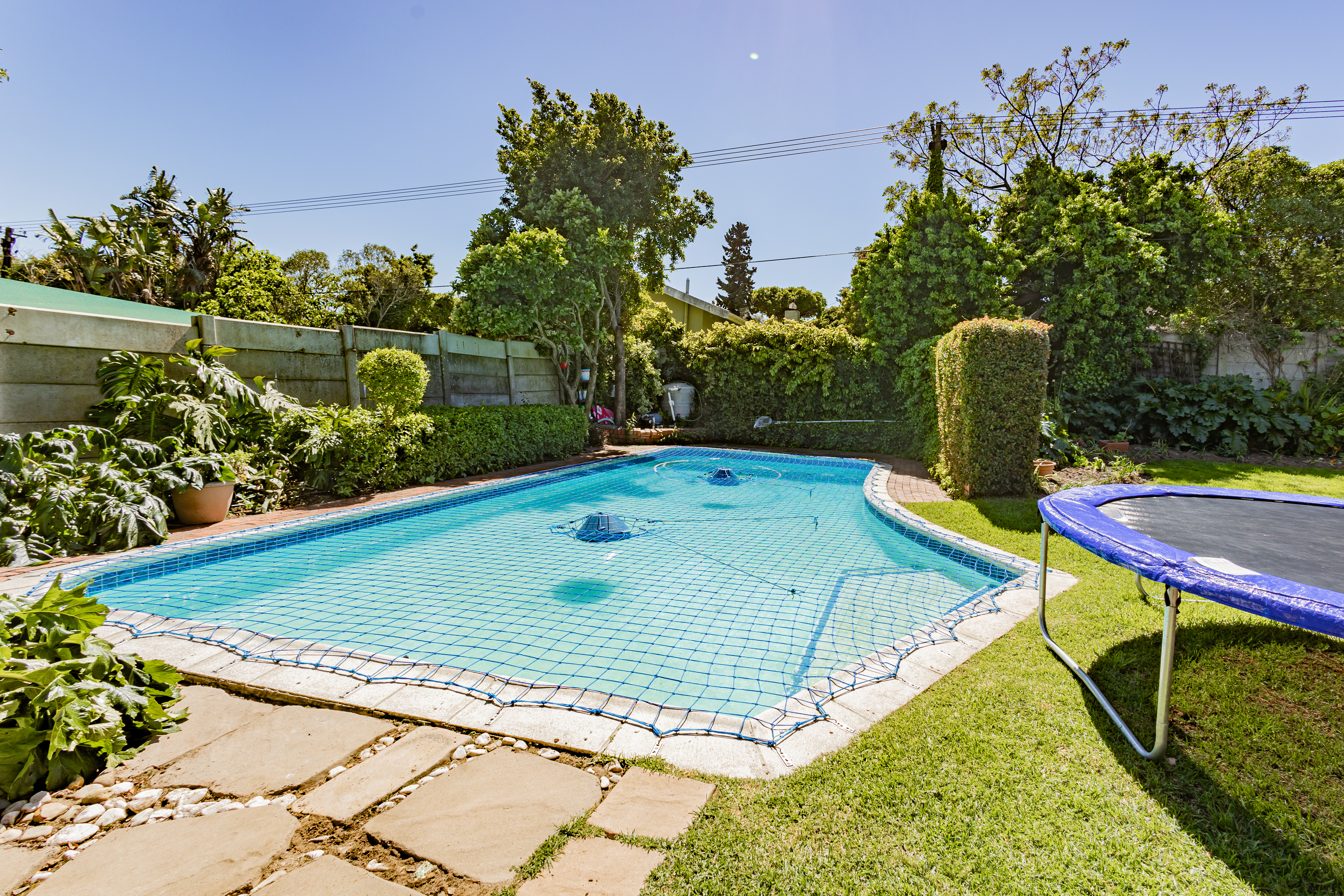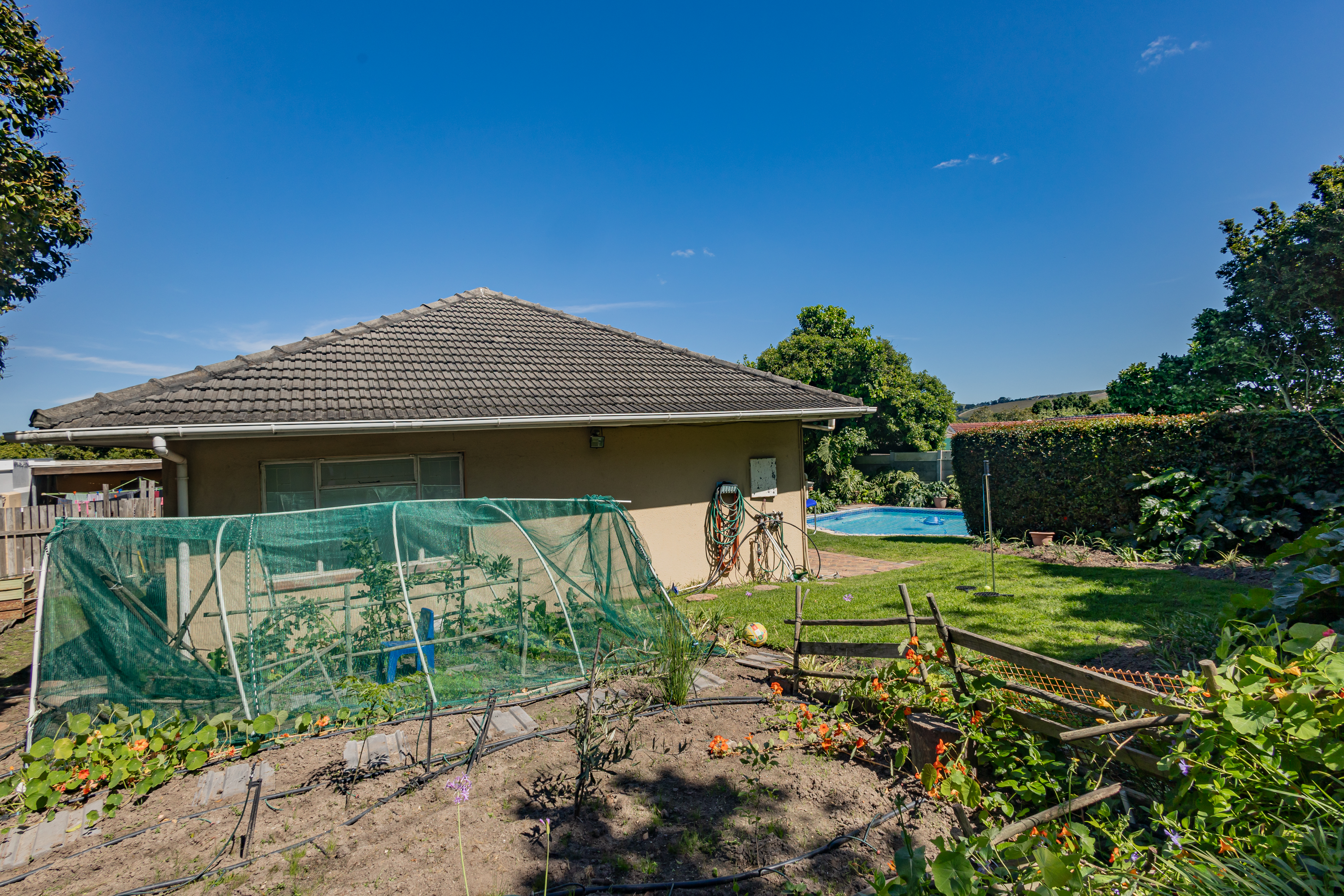 The open-plan lounge and dining area flow seamlessly onto a private, established garden featuring a sparkling swimming pool – perfect for entertaining or relaxing with the family. The granite-fitted kitchen comes complete with a gas hob, electric oven and ample storage space. Adjacent is a large, separate laundry room and staff accommodation with shower and toilet.