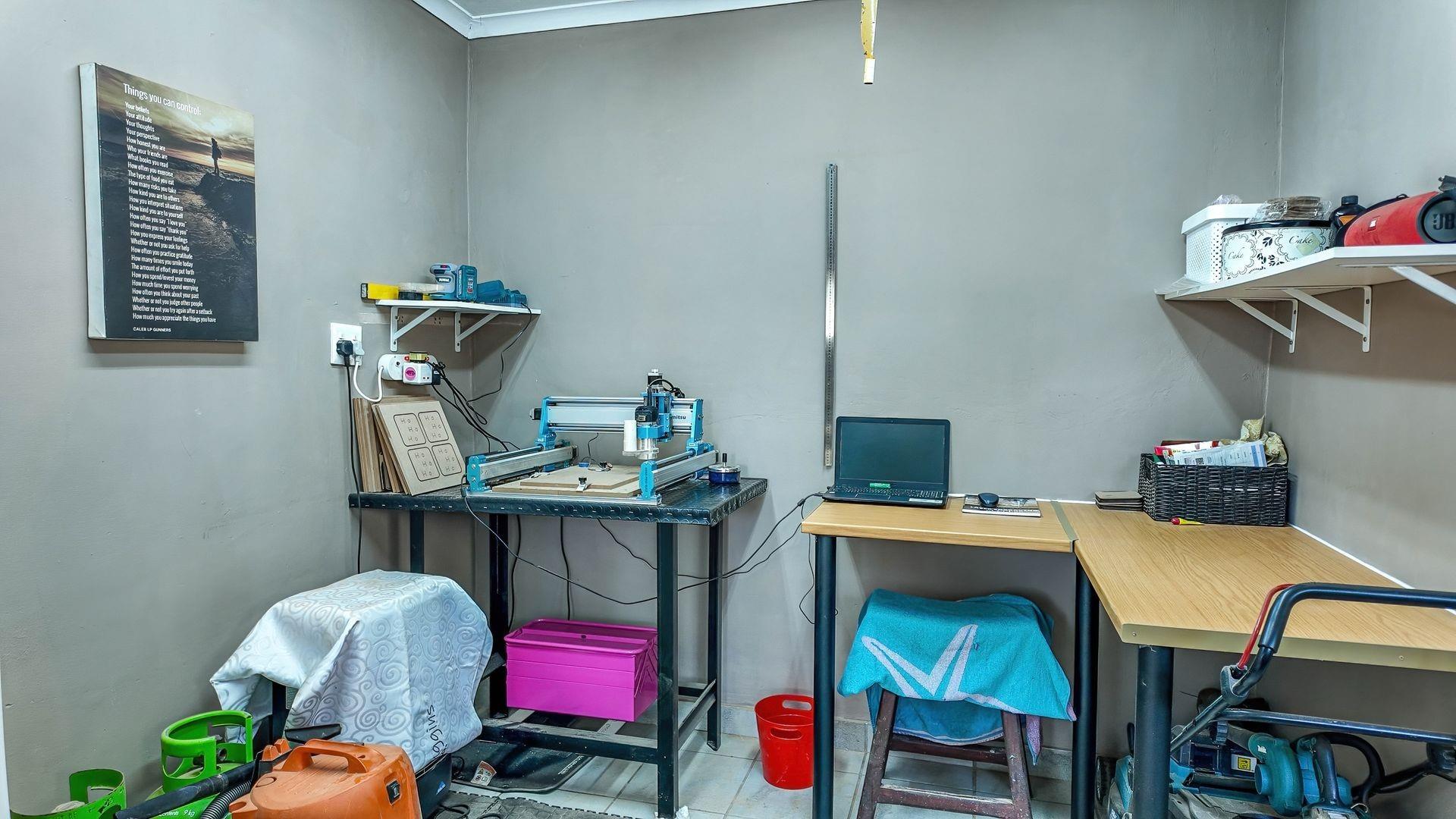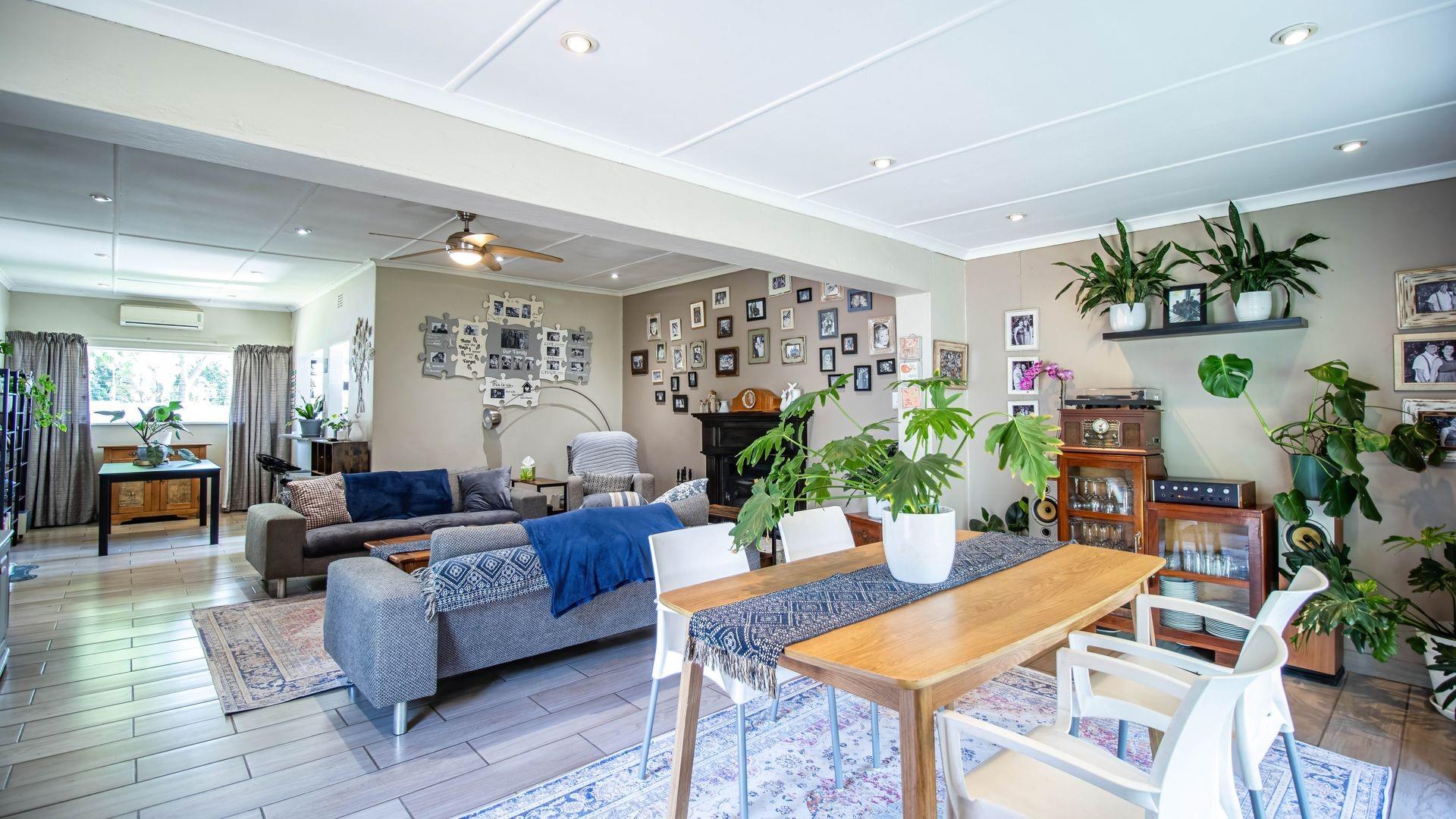 The entrance hall leads into a stunning open-plan lounge that seamlessly connects to the dining room and kitchen, complete with a gas hob and eye-level electric oven. From here, you can access the entertainment area, which boasts a built-in braai and a generously sized room with fitted extras, perfect for gatherings with family and friends.