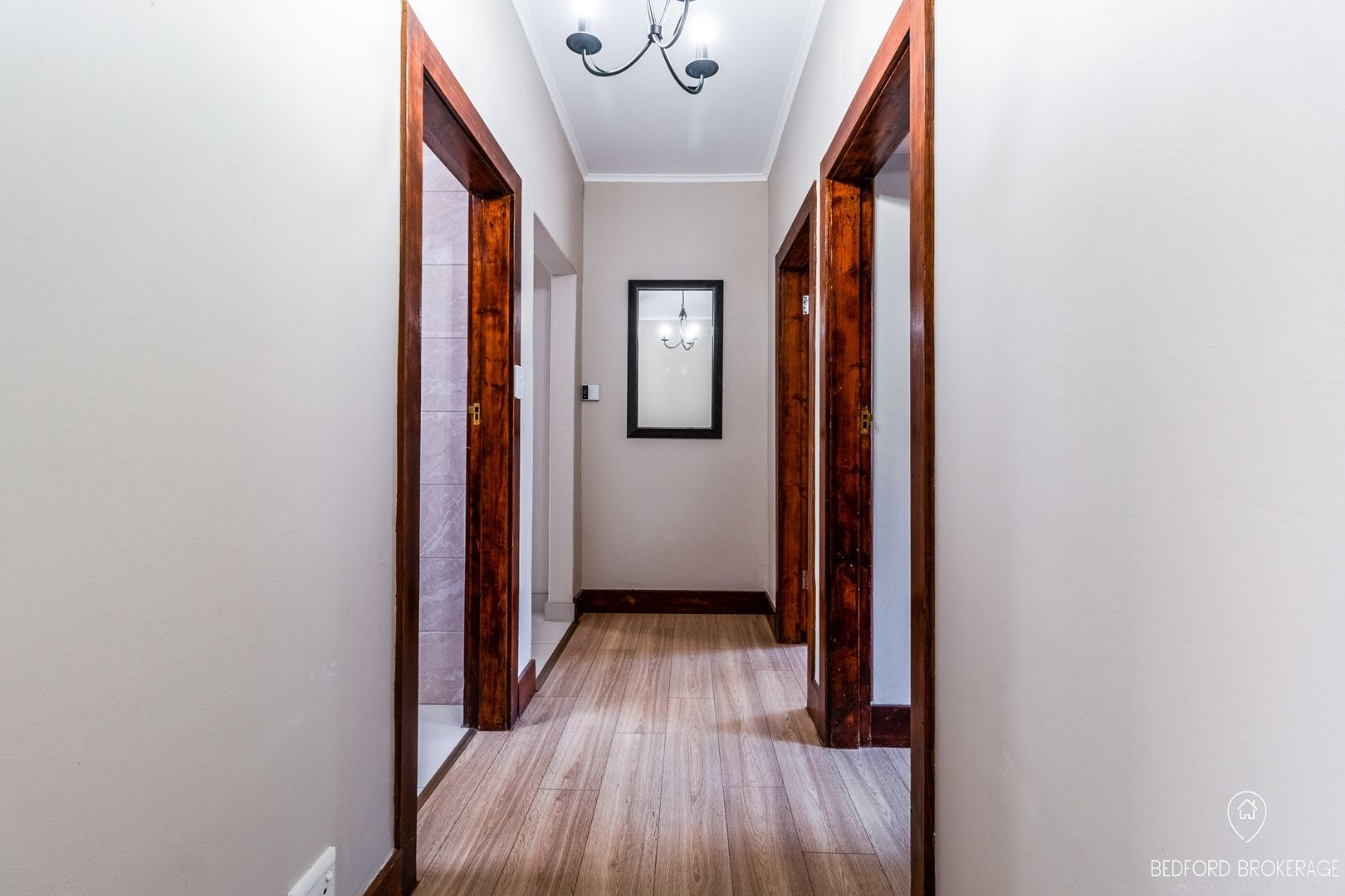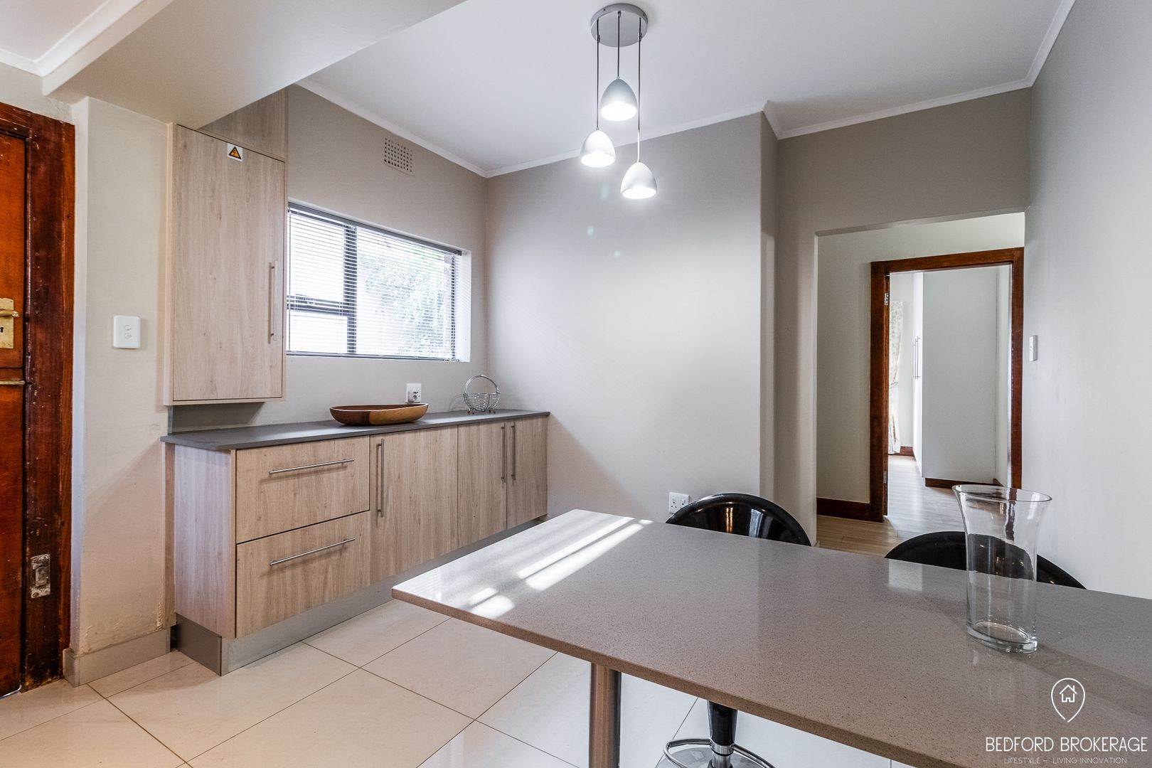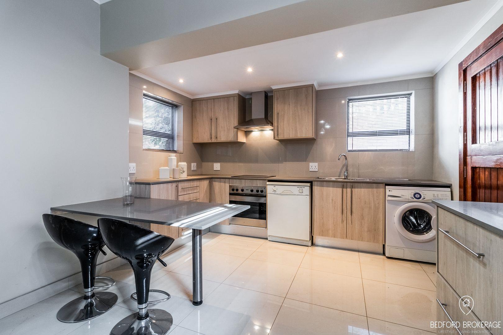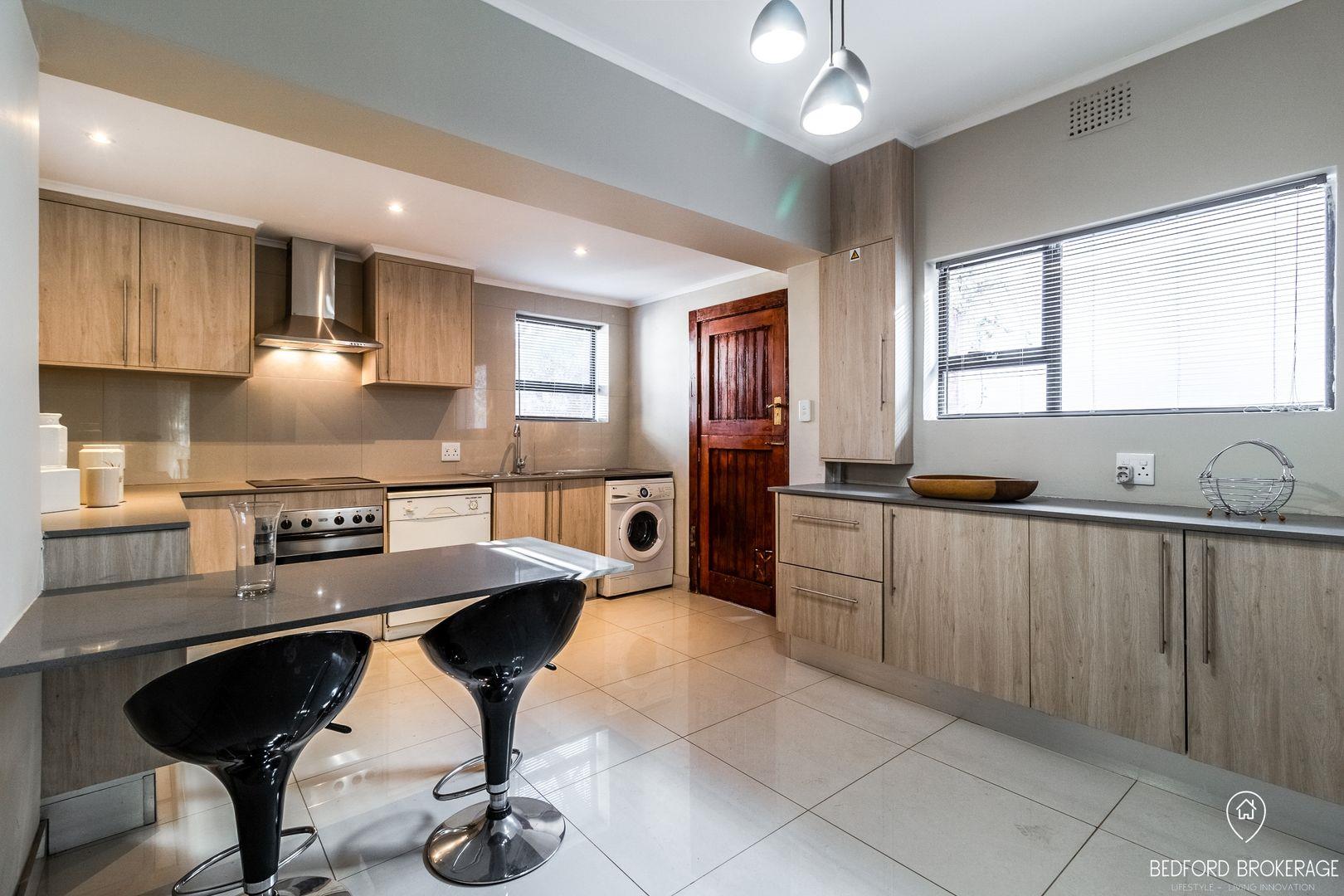 The kitchen offers space for two appliances, Caesarstone countertops, a double sink, ample cupboard space, and a breakfast bar. It features a Defy oven and hob, newly tiled floors, and all the plumbing has redone through out the house.