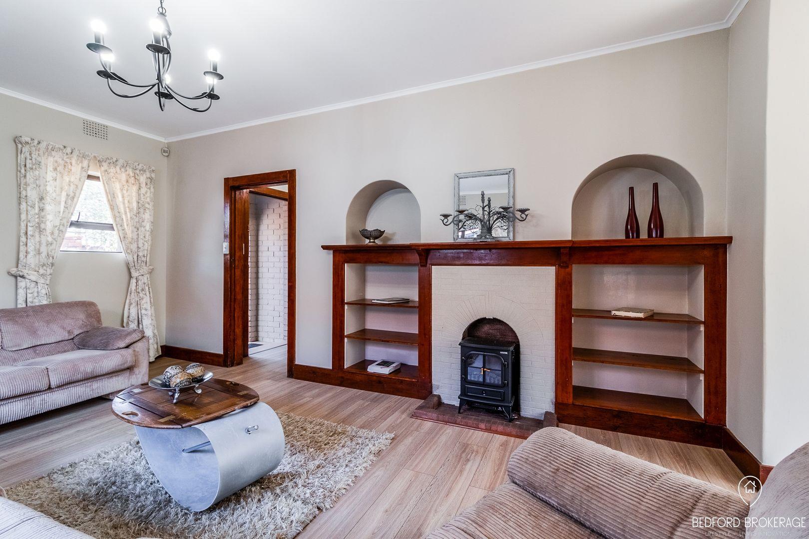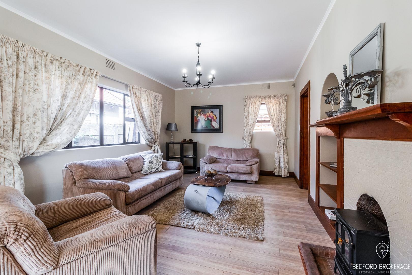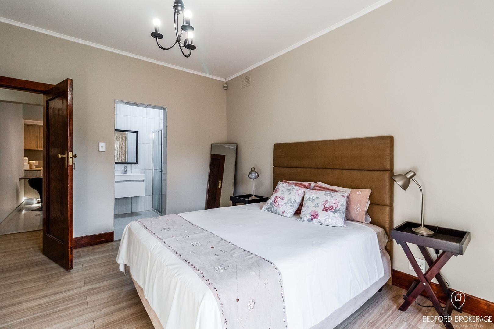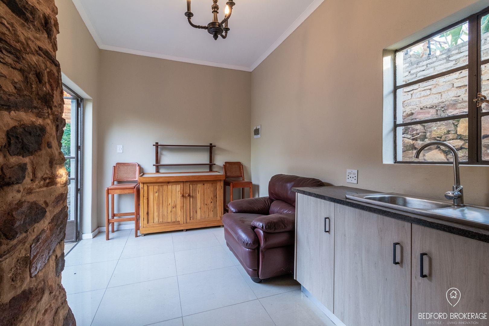 The kitchen offers space for two appliances, Caesarstone countertops, a double sink, ample cupboard space, and a breakfast bar. It features a Defy oven and hob, newly tiled floors, and all the plumbing has redone through out the house.