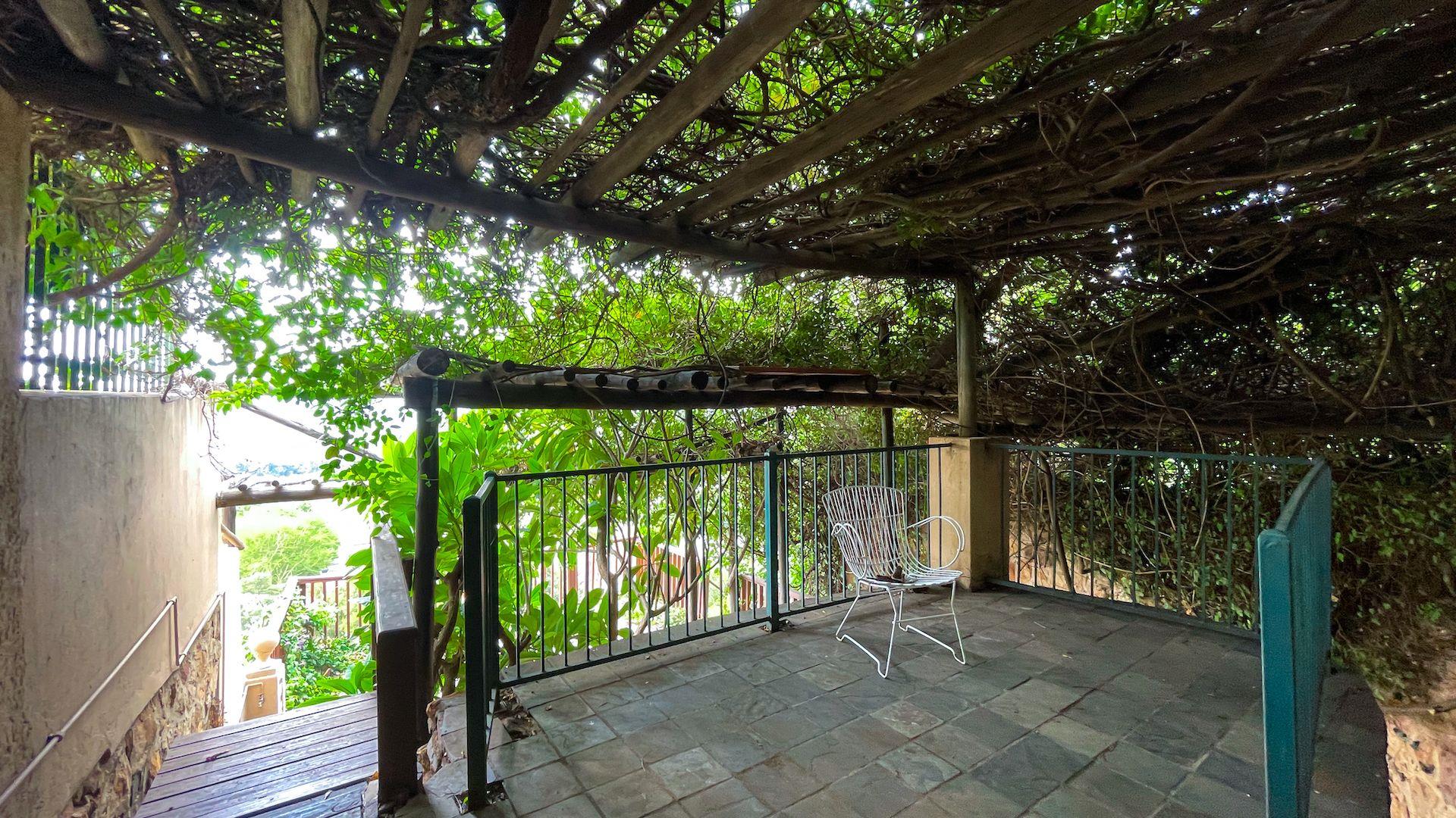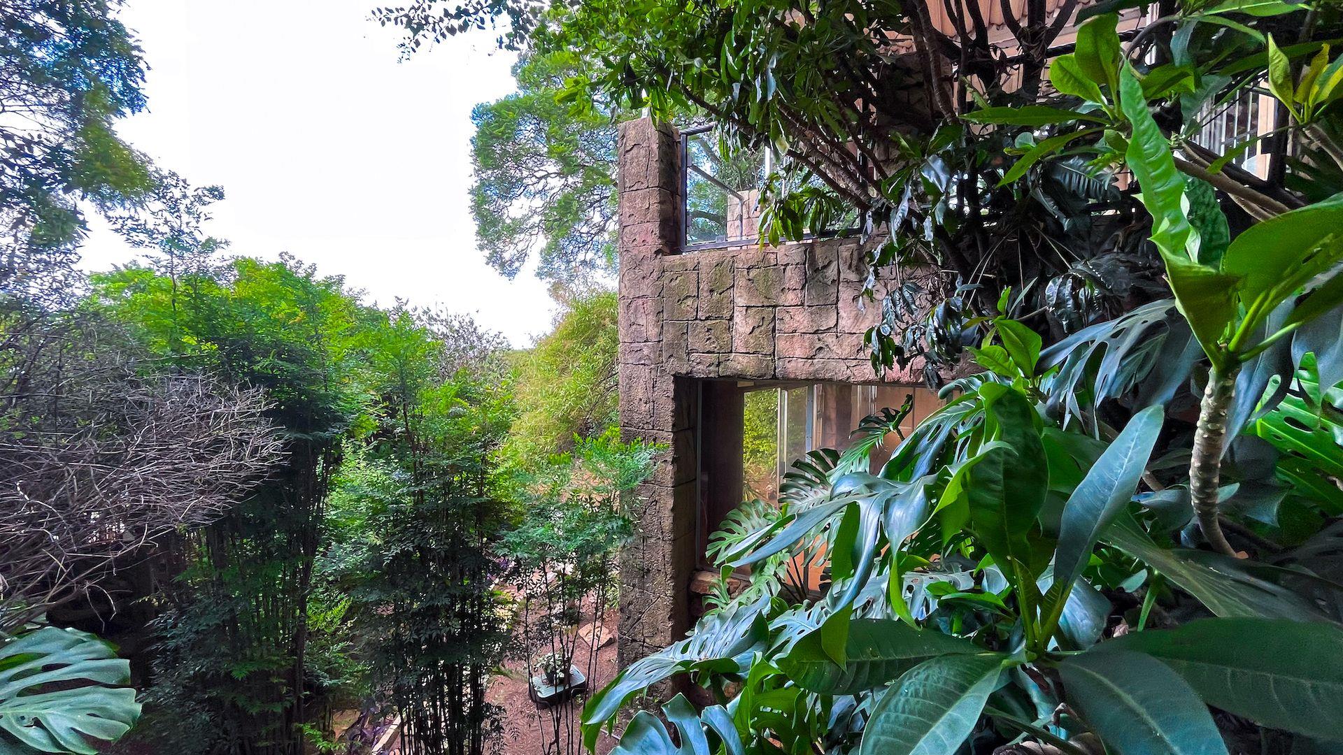 8. There is a jacuzzi, needing fixing, and a garden with lots of vegetation.