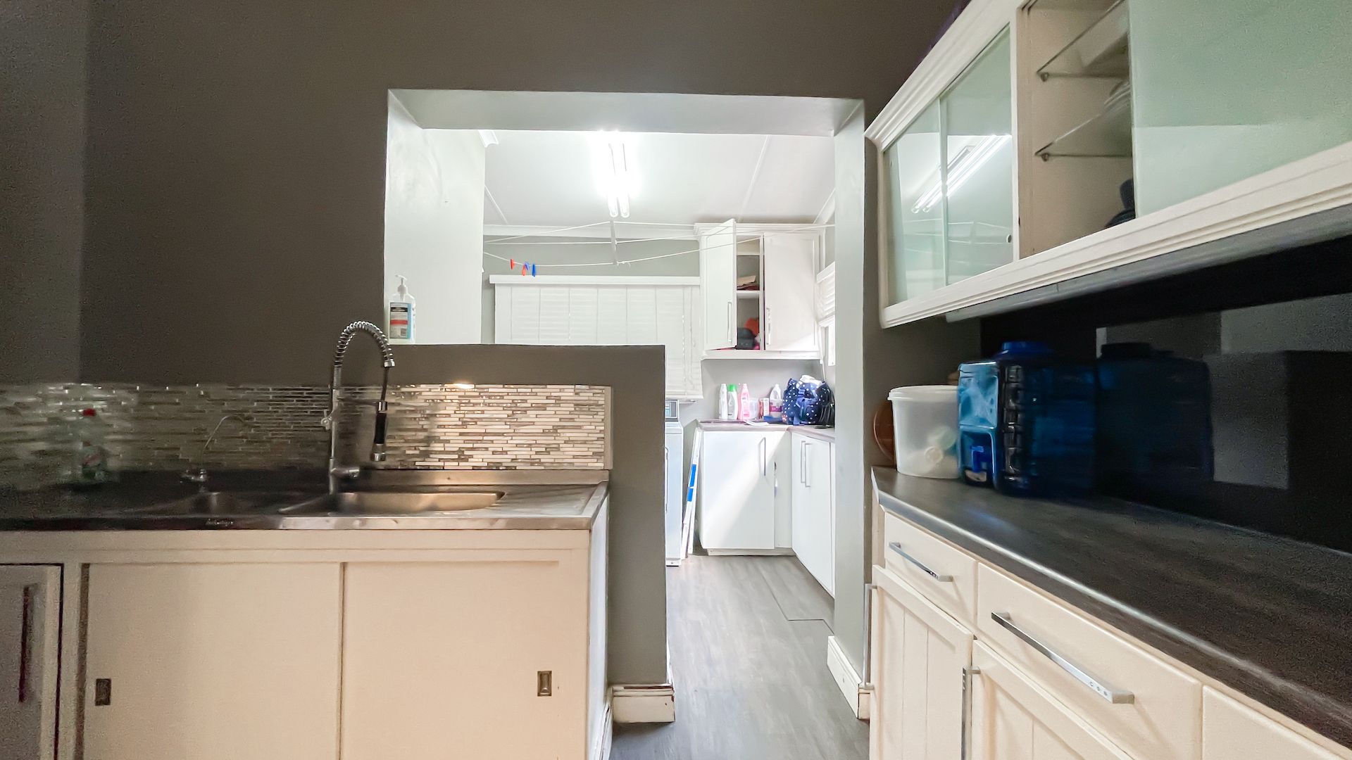 6. The kitchen is modern and furnished with White built-in cupboards and black, tops, a true dream kitchen.