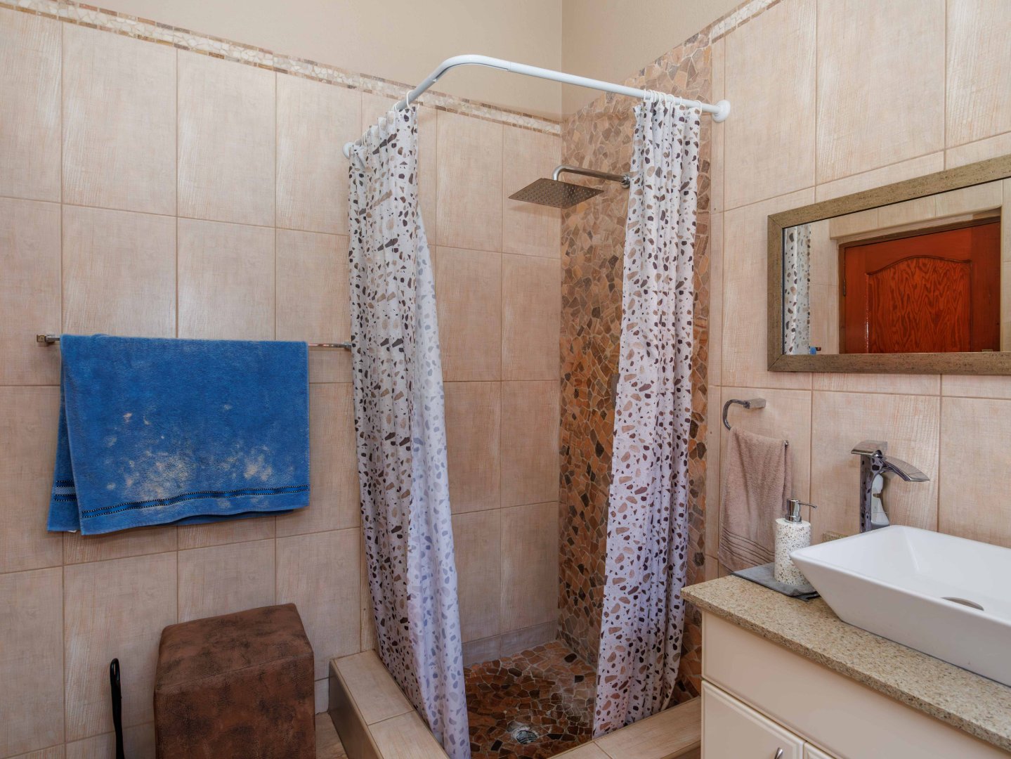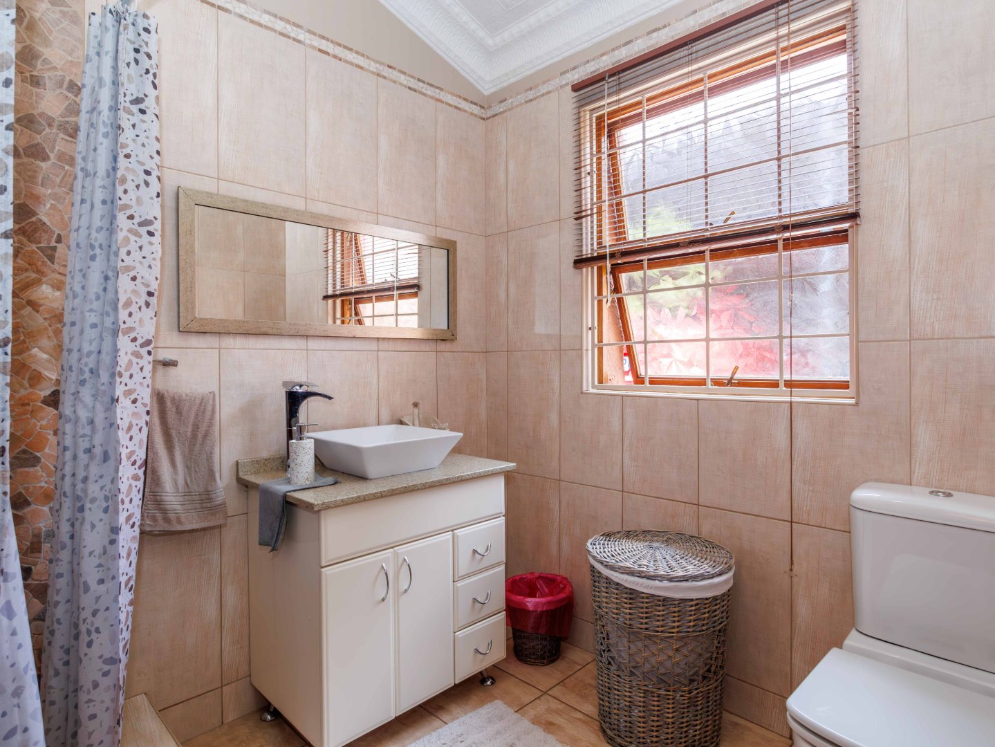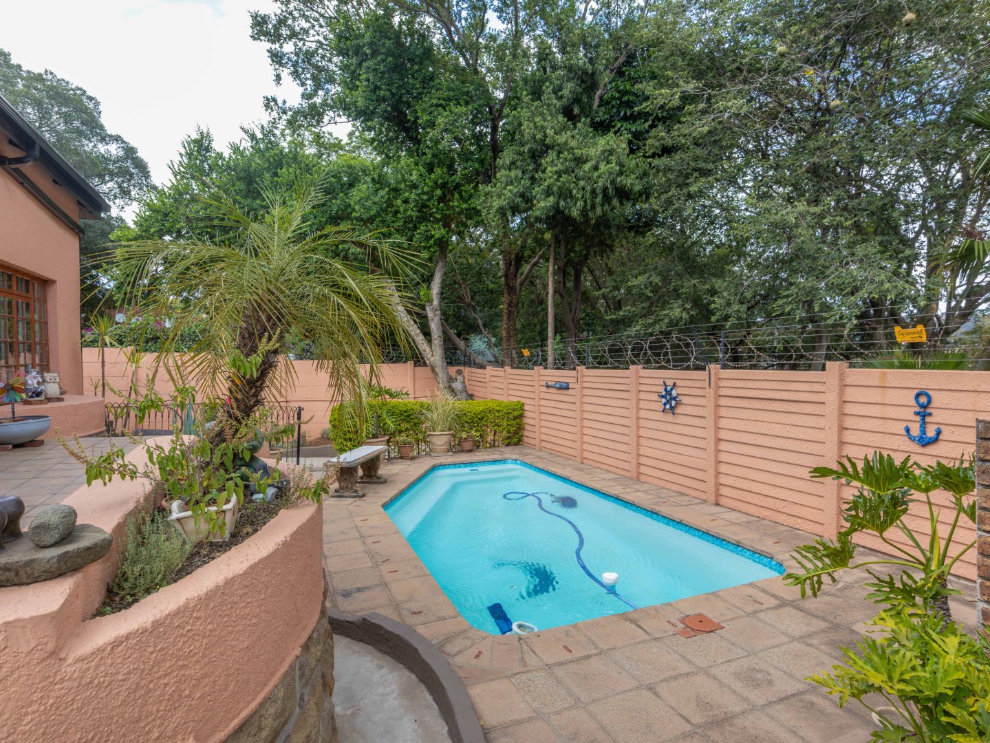 The main bedroom features an en-suite bathroom. The well maintained garden includes a solar-heated pool and Jojo-supported veggie patch.