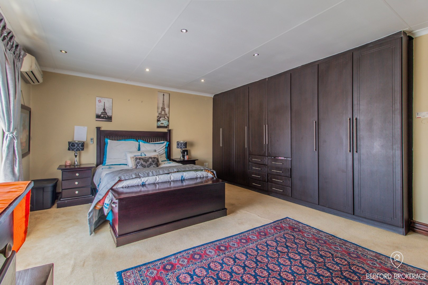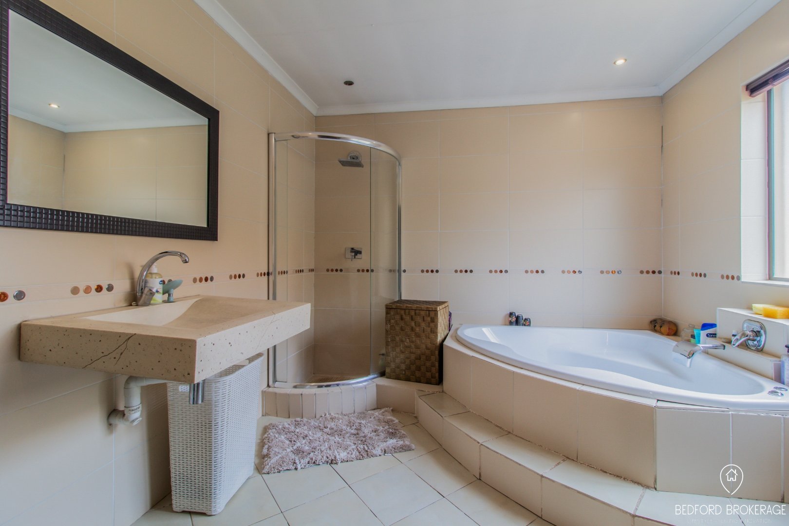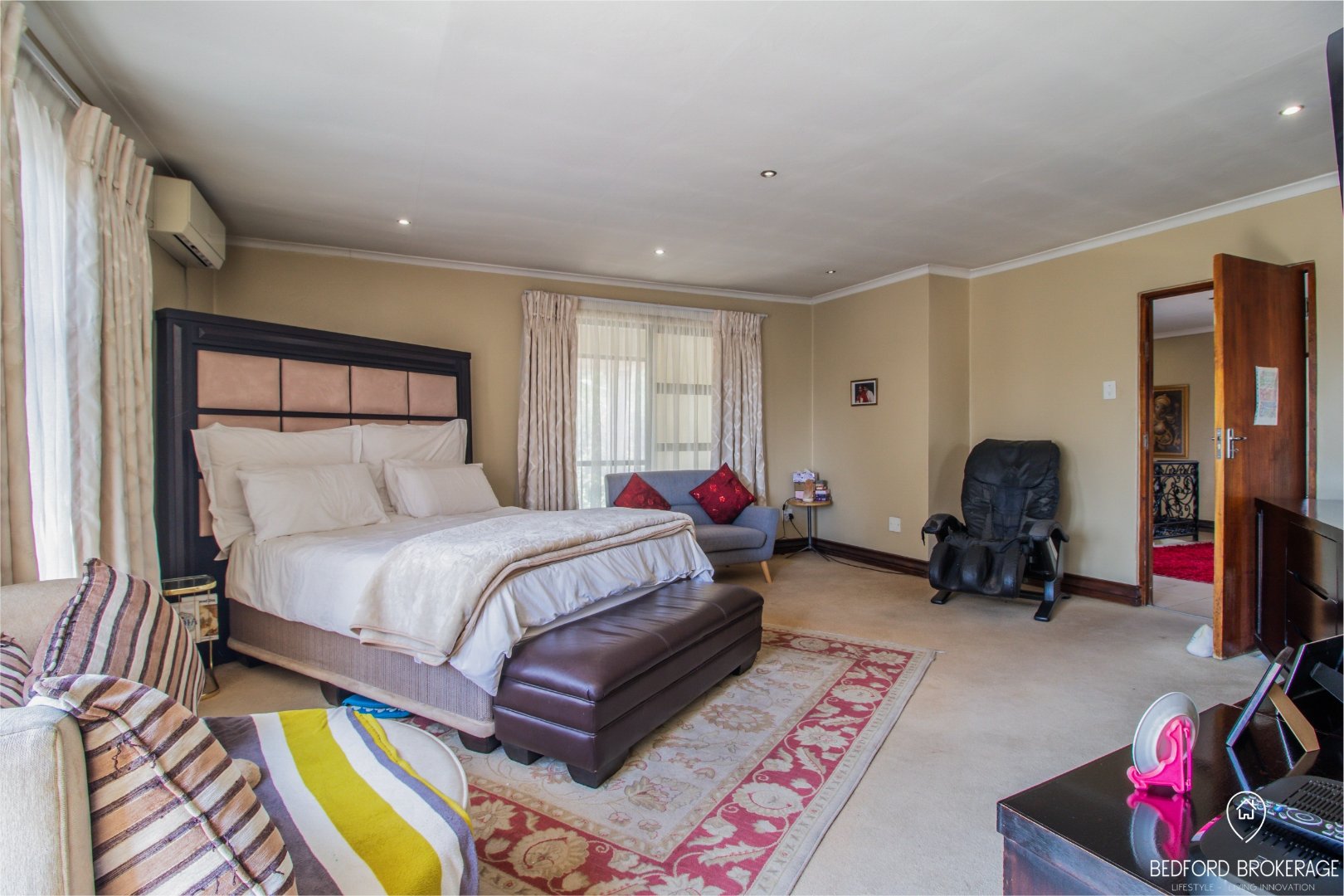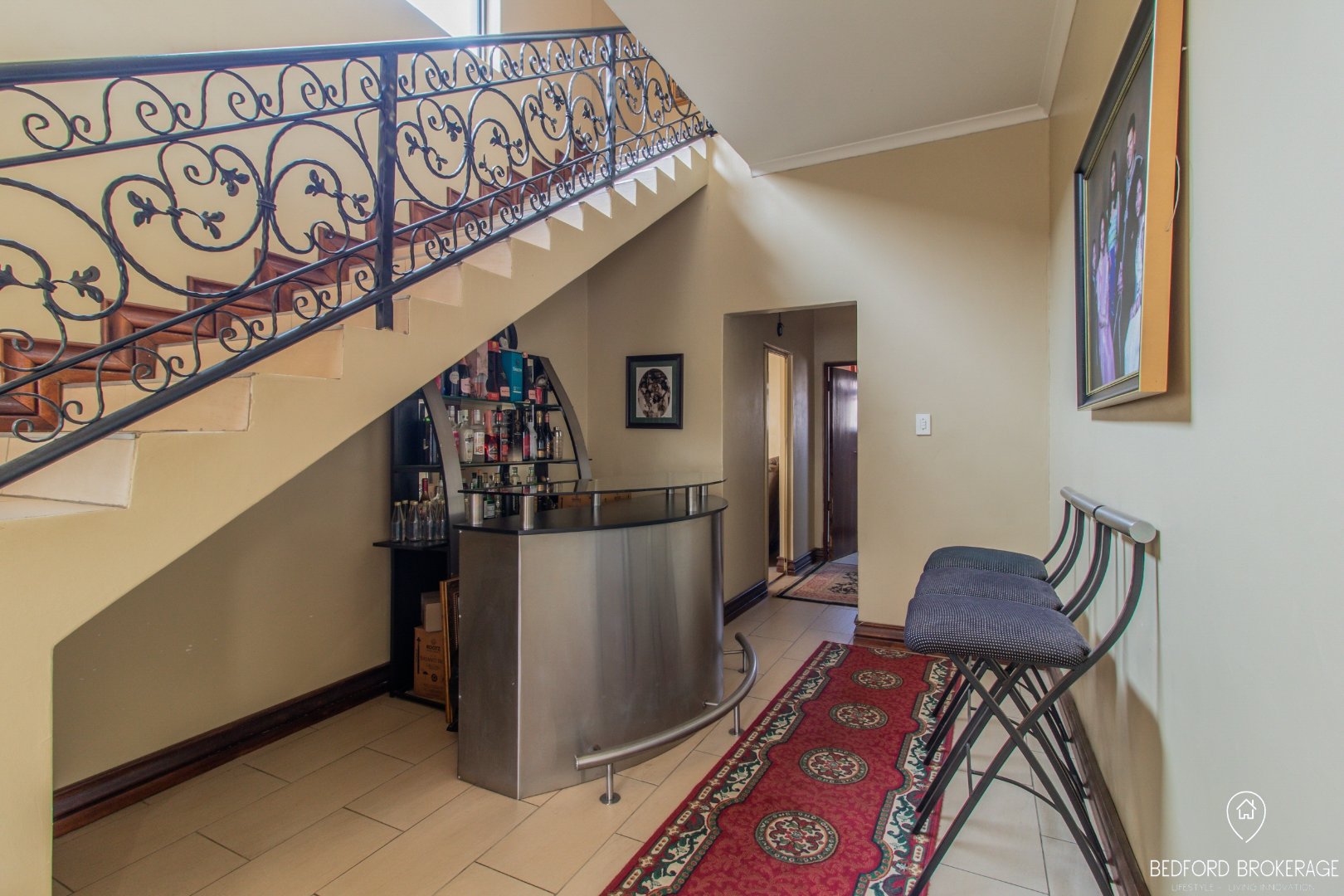 Downstairs offers 3 spacious bedrooms and 2 bathrooms. Each bedroom is carpeted and equipped with air conditioning for year-round comfort, while the rest of the house features elegant tiling.