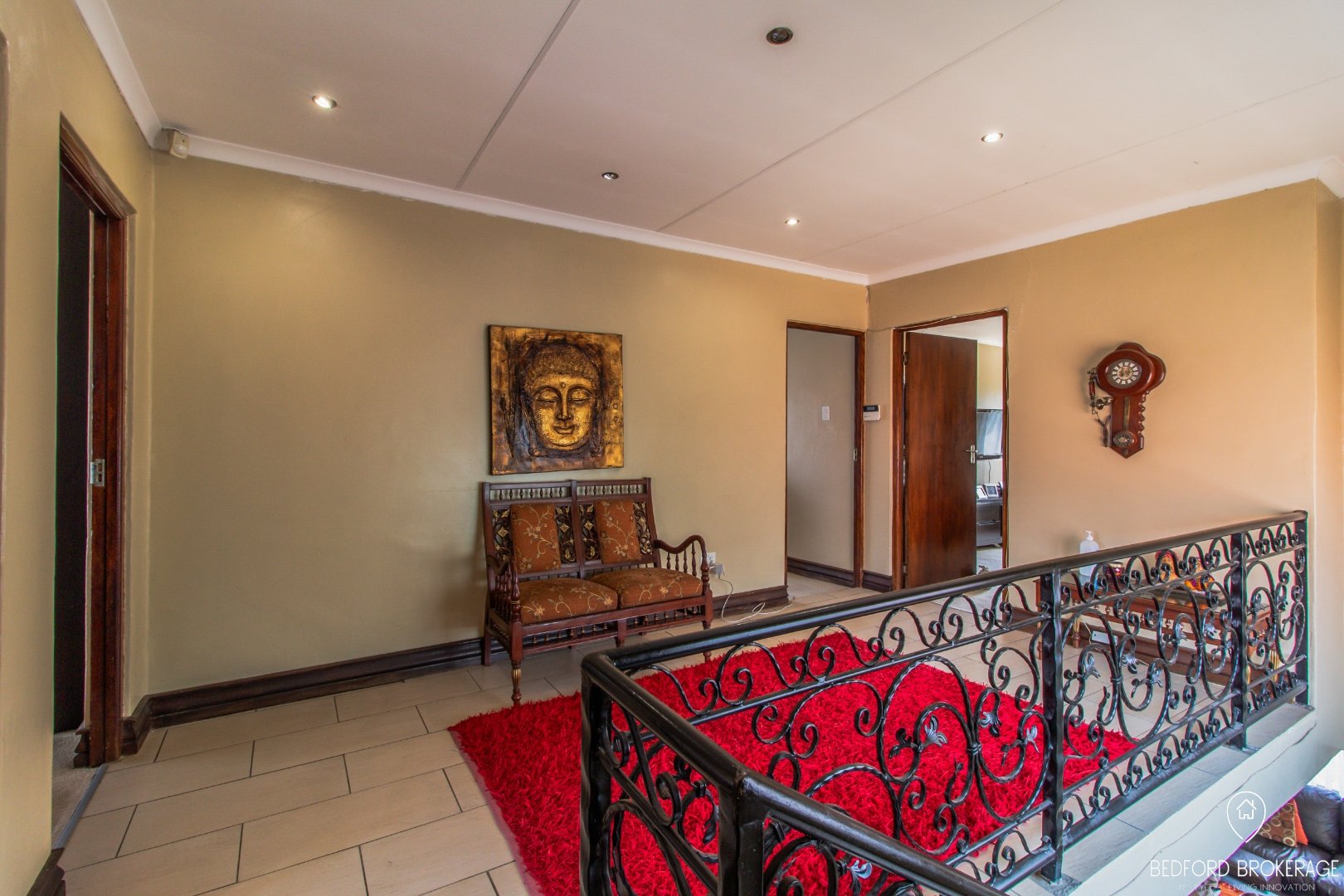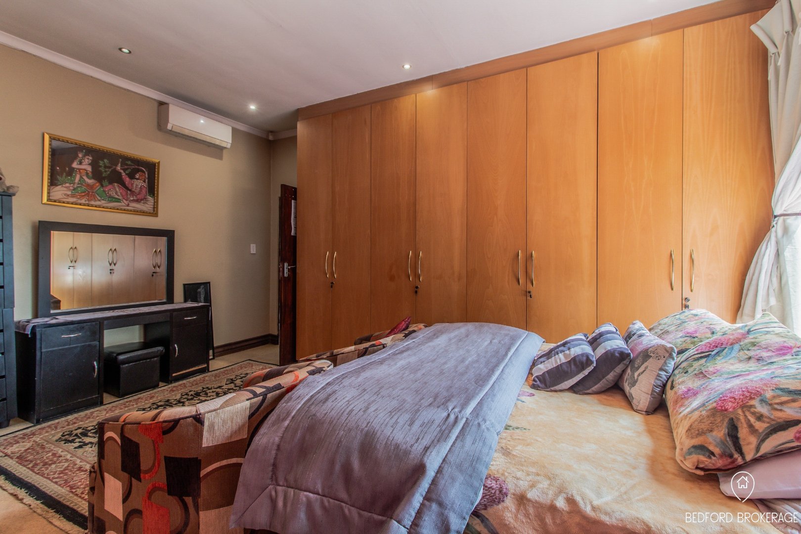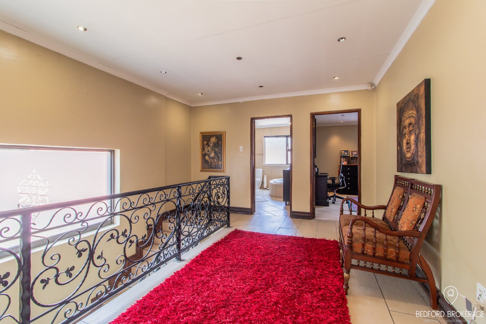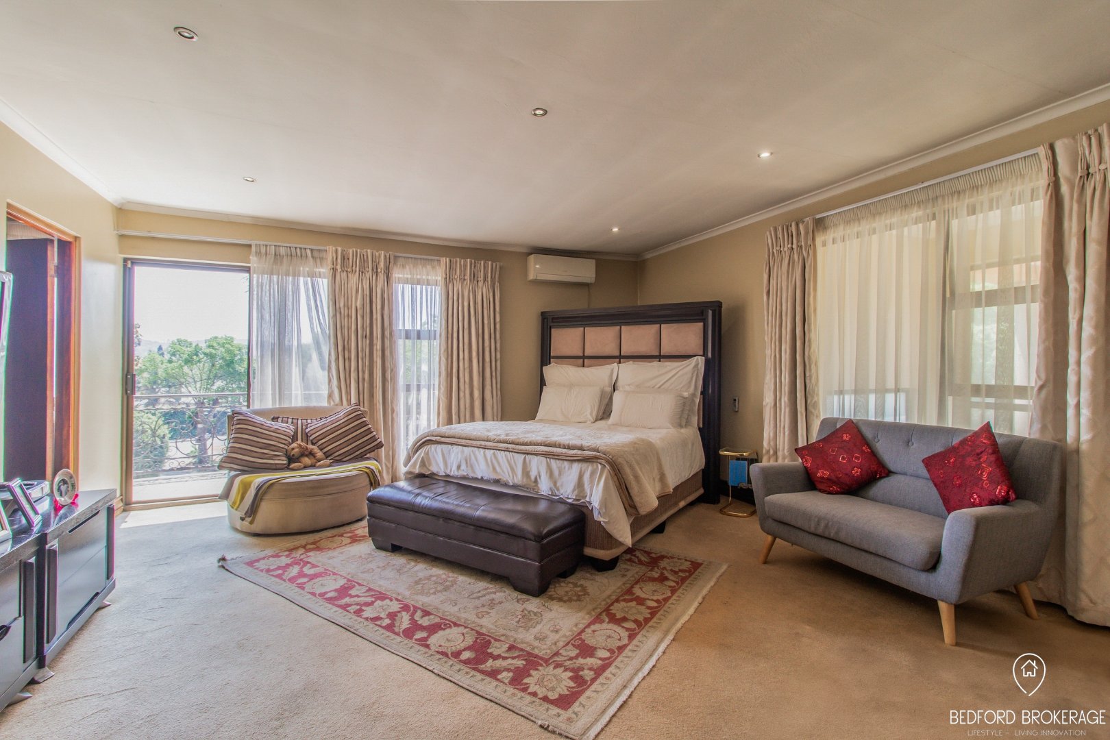 Downstairs offers 3 spacious bedrooms and 2 bathrooms. Each bedroom is carpeted and equipped with air conditioning for year-round comfort, while the rest of the house features elegant tiling.