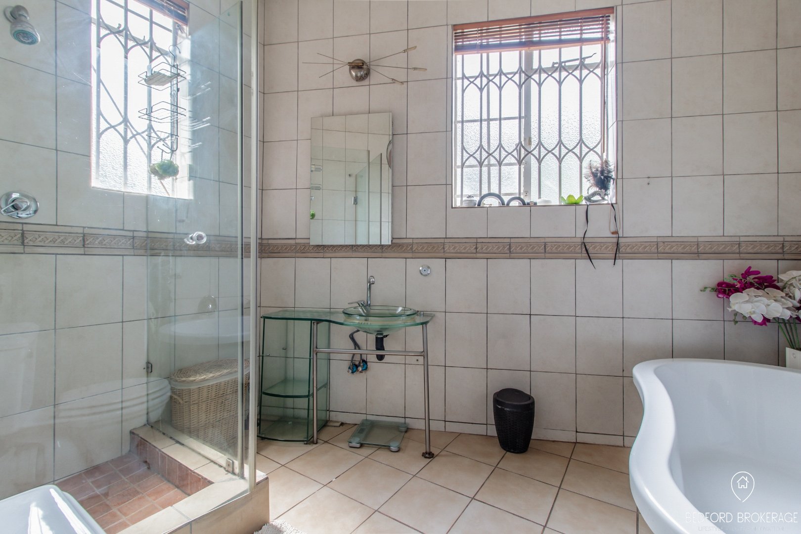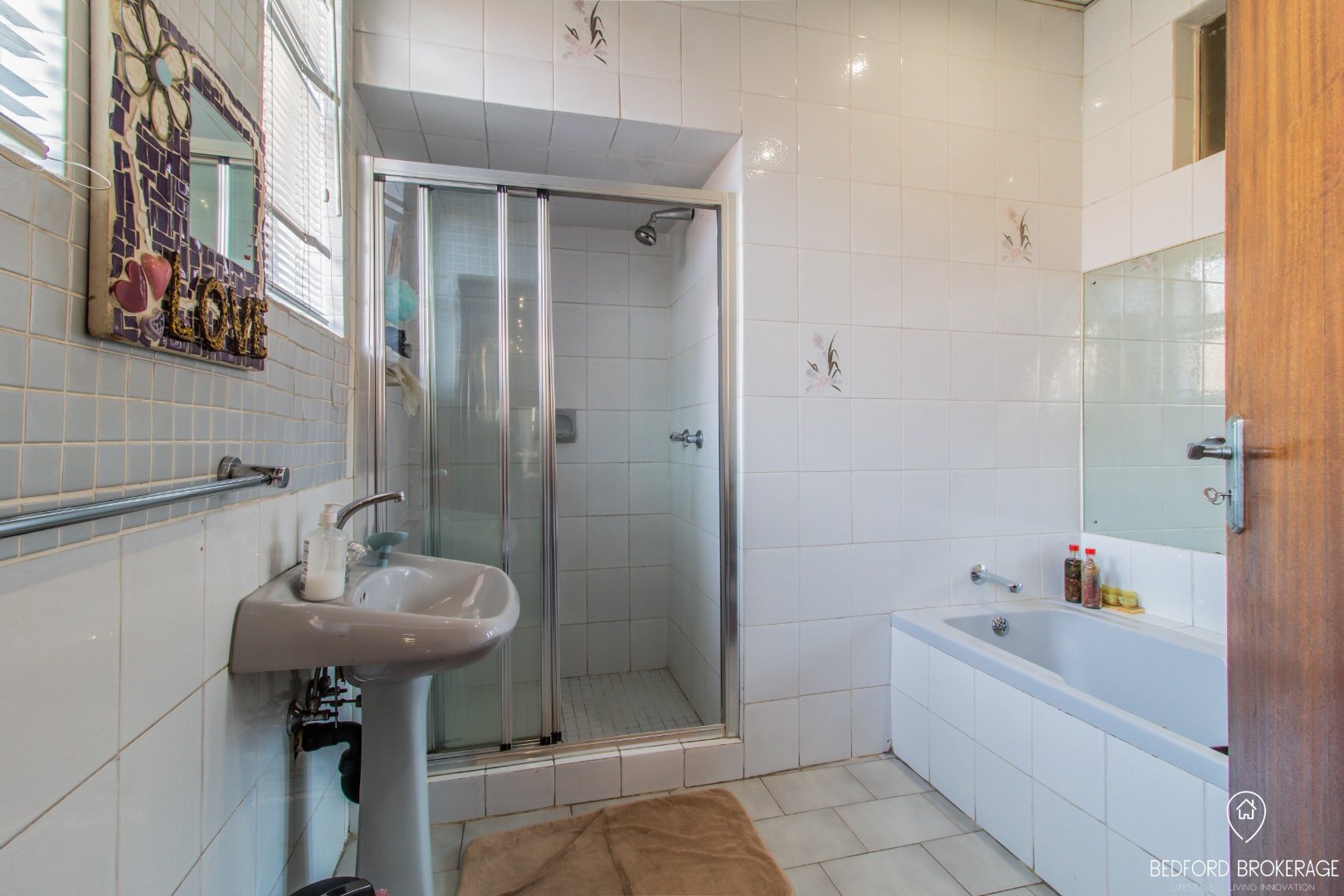 - A full bathroom with a shower upstairs