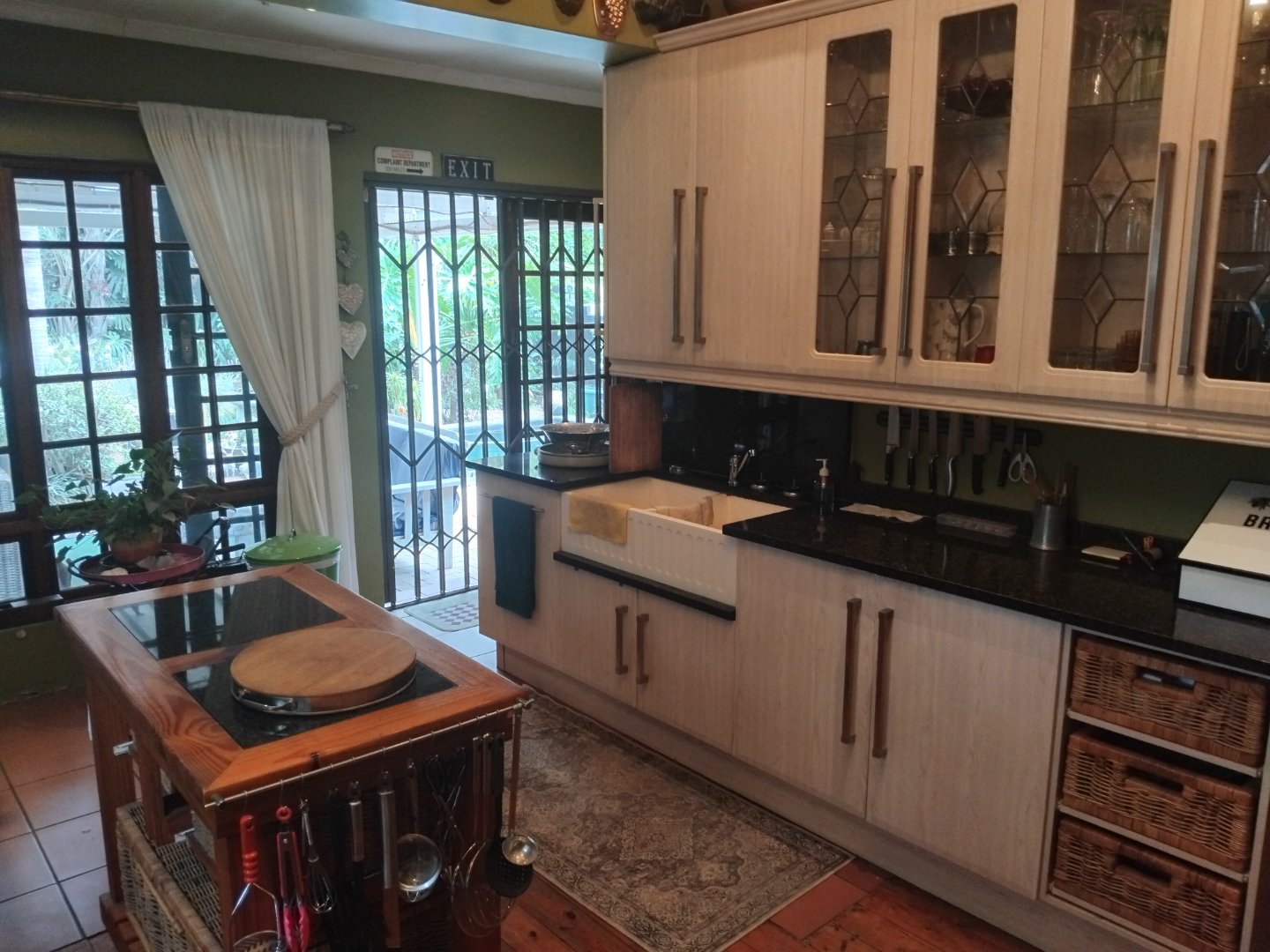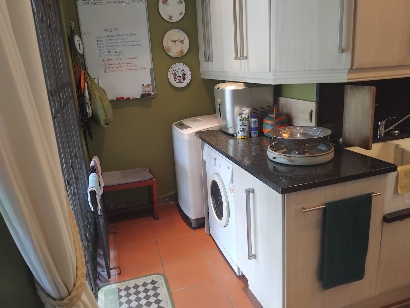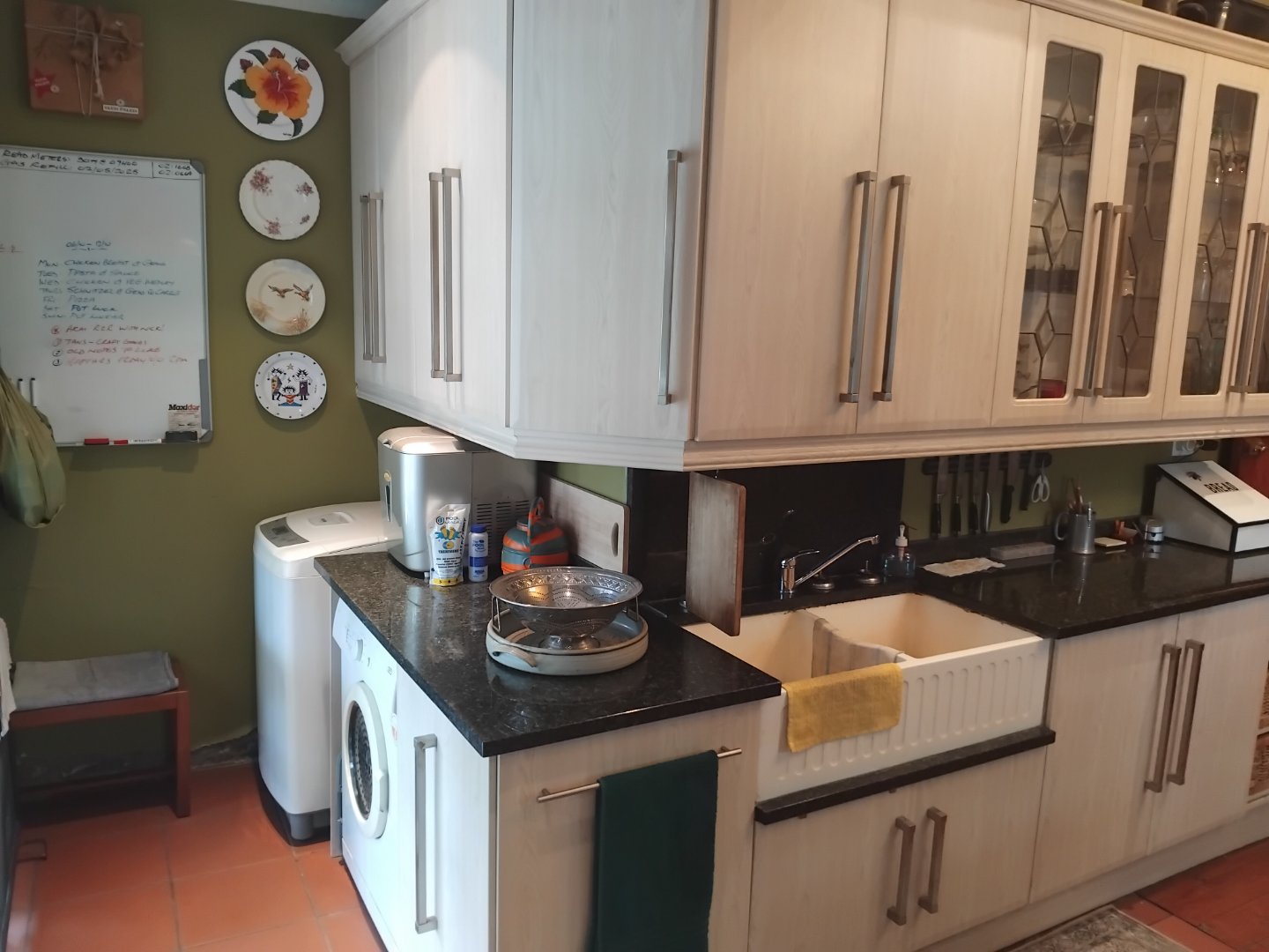 The modern kitchen is both stylish and practical, boasting granite tops, a gas hob, electric oven, extractor fan, separate pantry, and space for two appliances. Designed for entertaining, the outdoor area features retractable awnings and overlooks a sparkling pool — an ideal space for family gatherings or relaxed weekends.