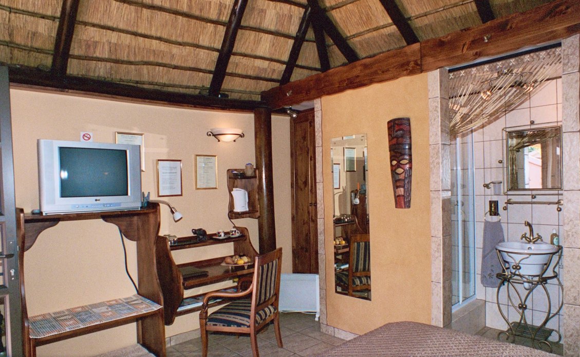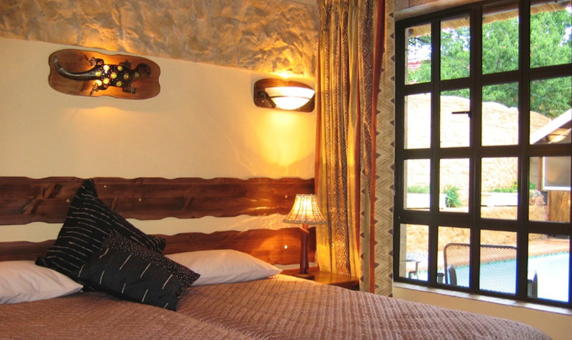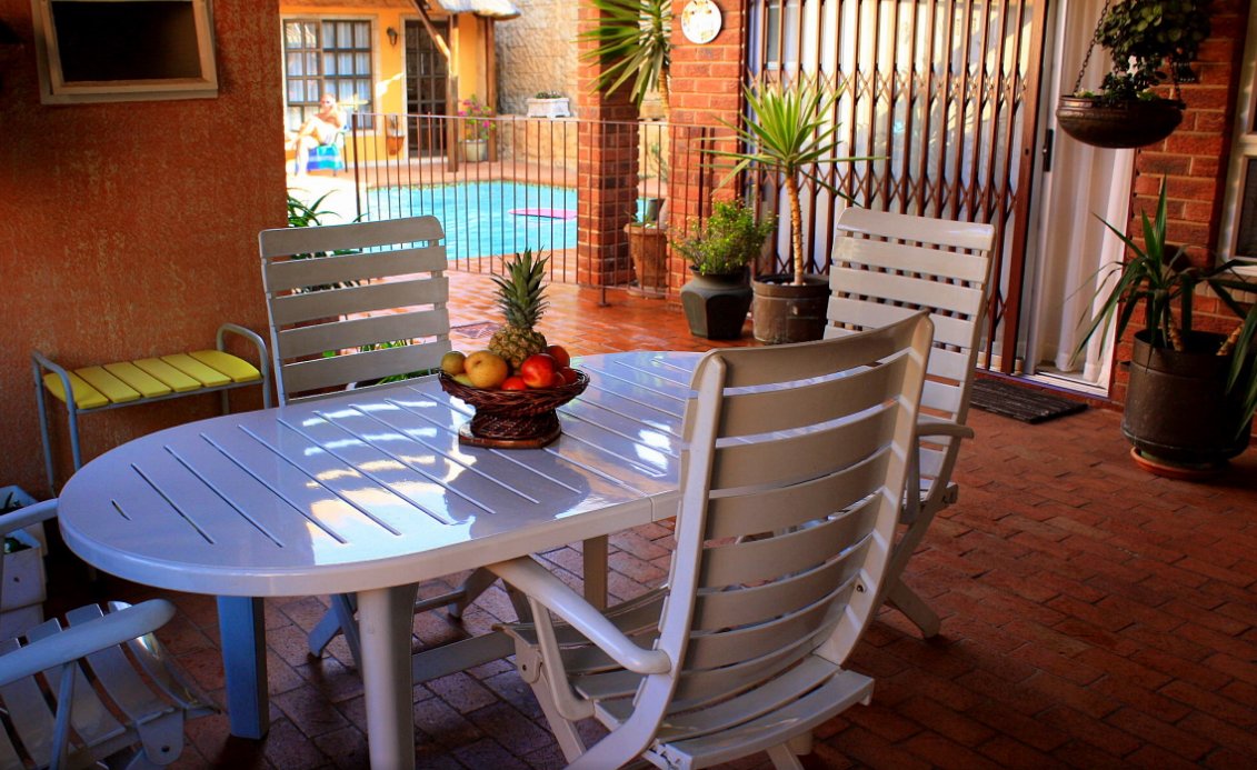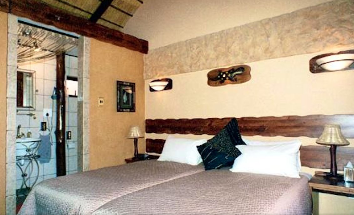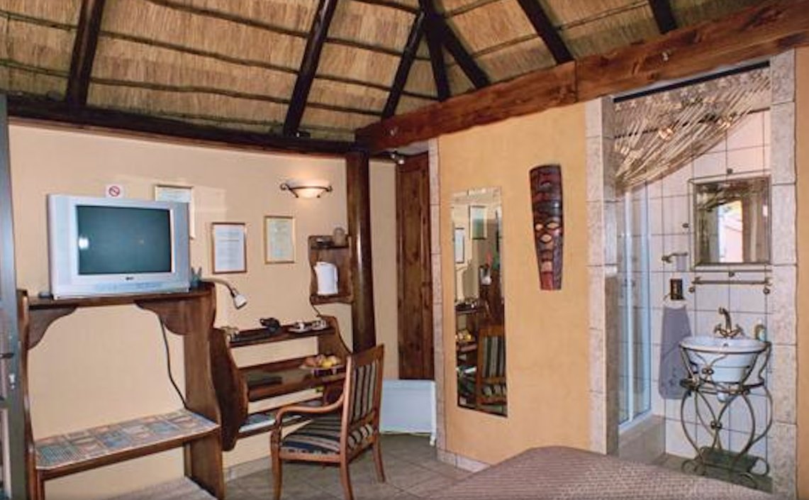 The property is powered by a newly installed 3.5KW solar inverter, supporting the main house and outdoor lighting. Surrounding the pool, multiple self-catering units provide accommodation, including the Hamburg Suite, a spacious bachelor unit with a kitchenette, en-suite bathroom, and loft storage. Additional units include the Berlin Room, the Le Chalet bachelor unit with foldaway beds, and the Petit single room with a double bed, all designed for guest comfort. Two thatched guest rooms with twin beds and en-suite bathrooms add a charming touch.