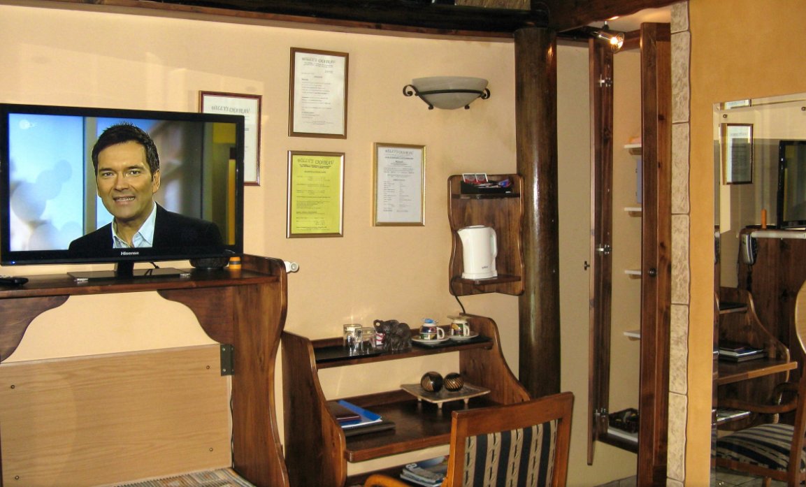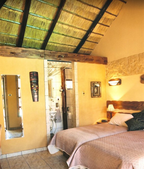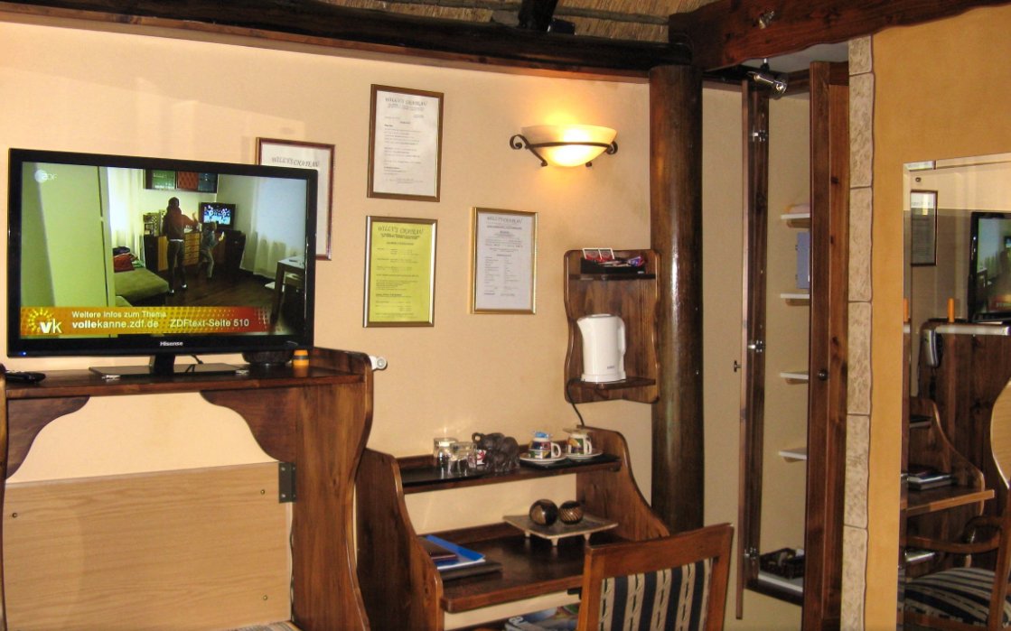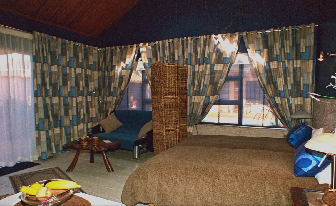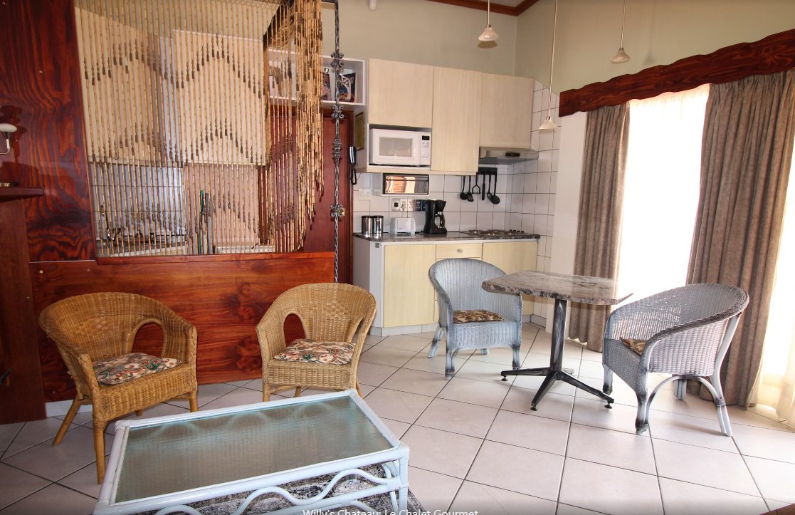 The property is powered by a newly installed 3.5KW solar inverter, supporting the main house and outdoor lighting. Surrounding the pool, multiple self-catering units provide accommodation, including the Hamburg Suite, a spacious bachelor unit with a kitchenette, en-suite bathroom, and loft storage. Additional units include the Berlin Room, the Le Chalet bachelor unit with foldaway beds, and the Petit single room with a double bed, all designed for guest comfort. Two thatched guest rooms with twin beds and en-suite bathrooms add a charming touch.