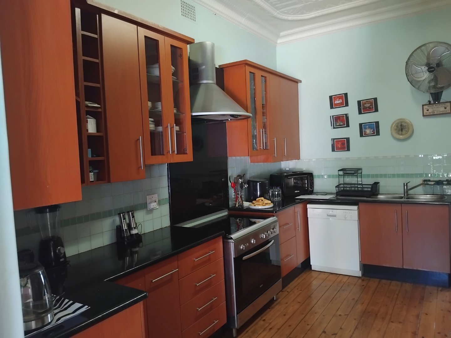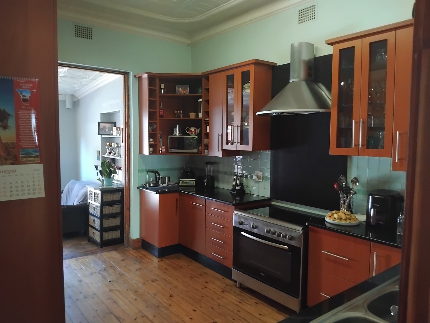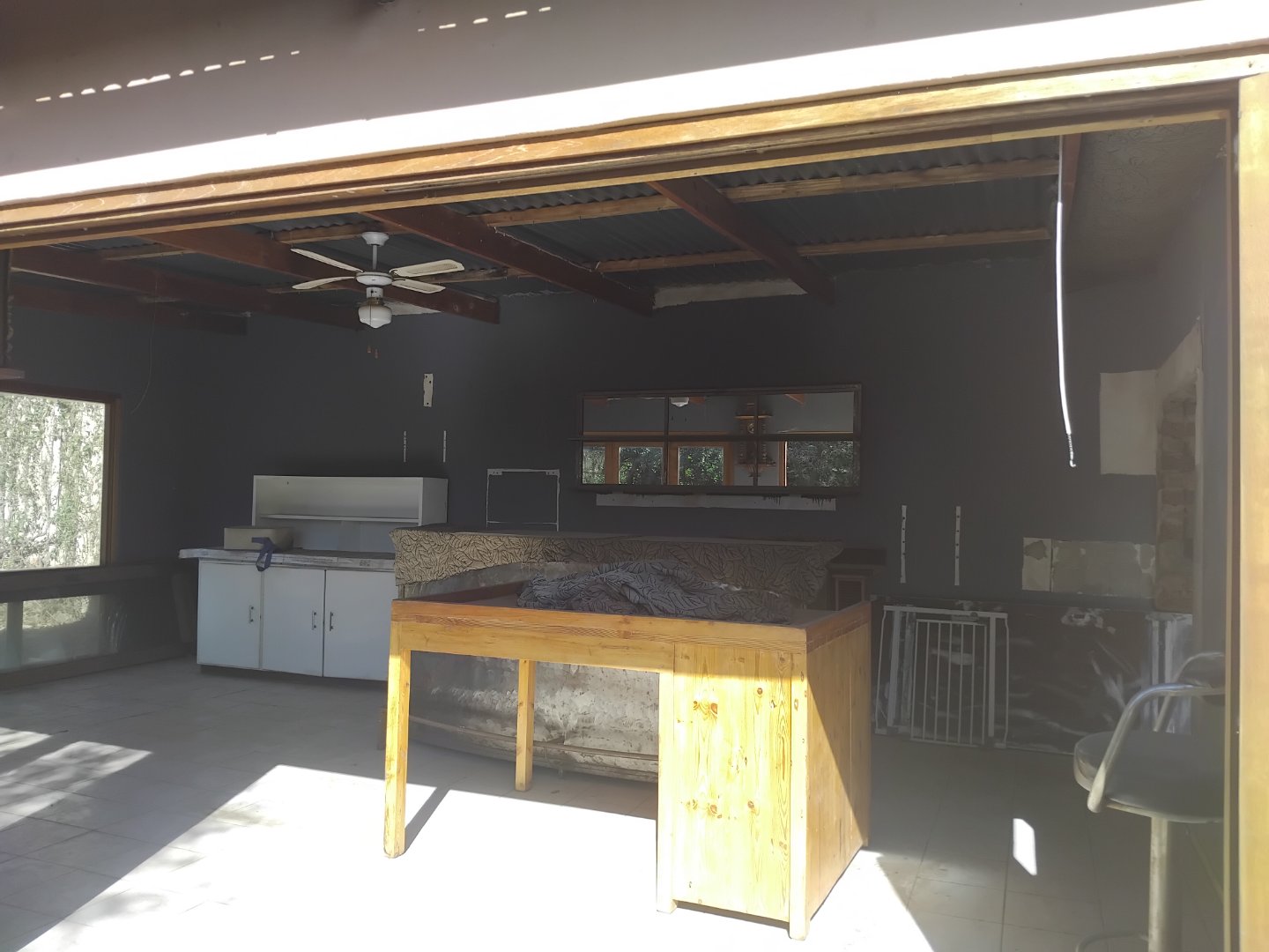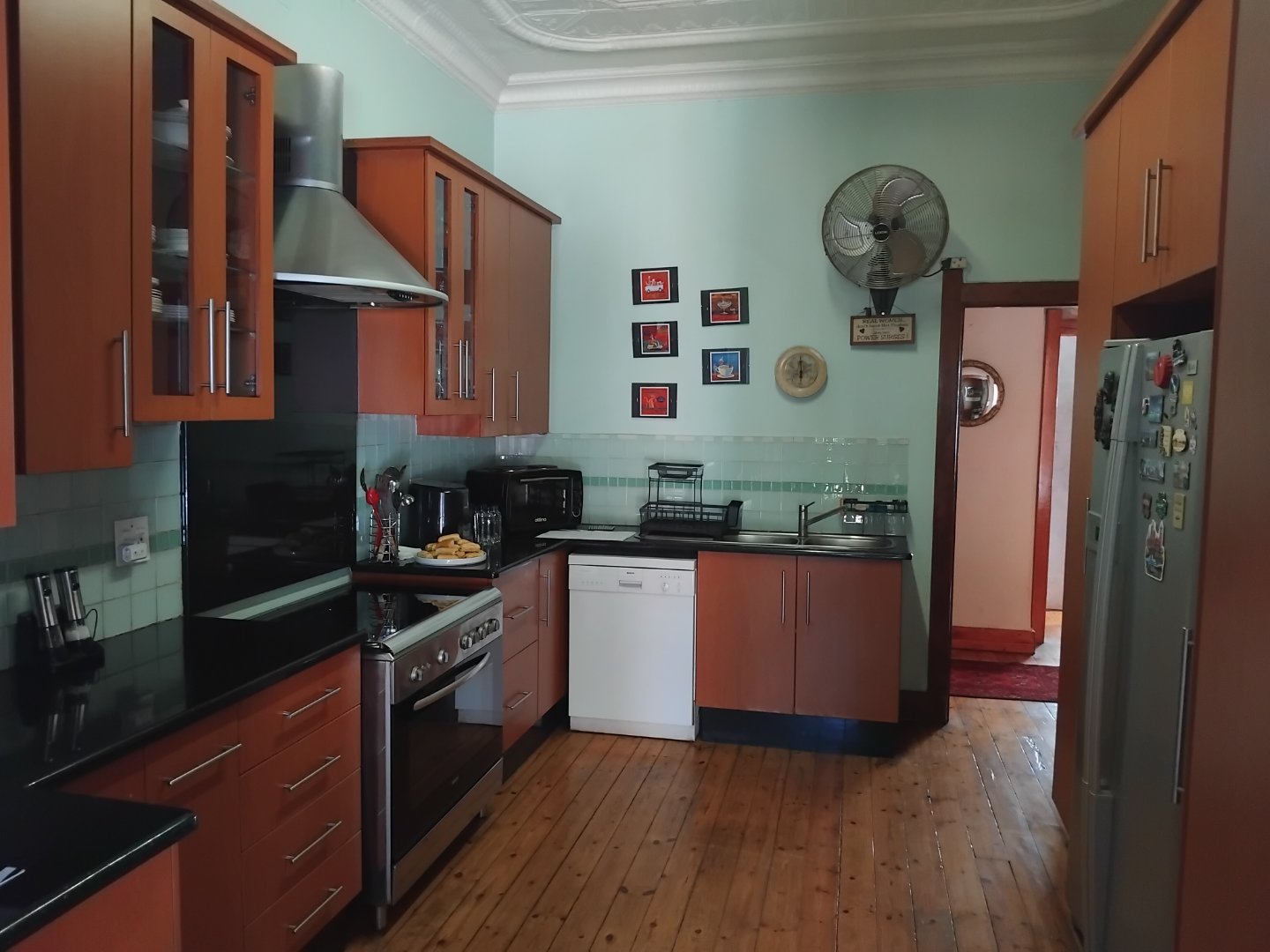 The open-plan kitchen is a highlight, featuring granite tops and a gas stove, perfect for family meals and entertaining. The home includes a large lounge, a braai area, staff accommodation, and additional parking.