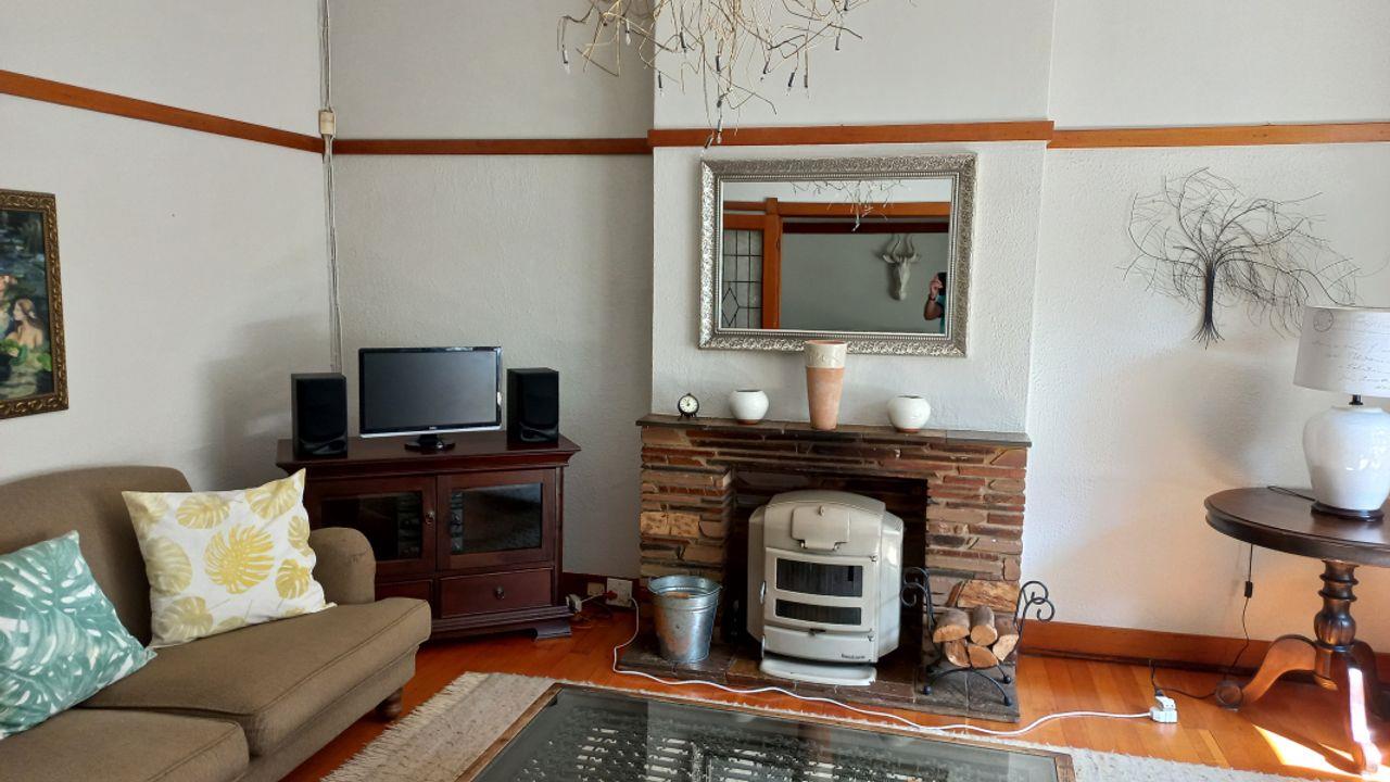 The spacious lounge offers a cozy retreat, enhanced by a traditional anthracite heater and bay windows that flood the room with natural light. Enjoy seamless indoor-outdoor living with a wooden deck, perfect for relaxing or hosting guests.