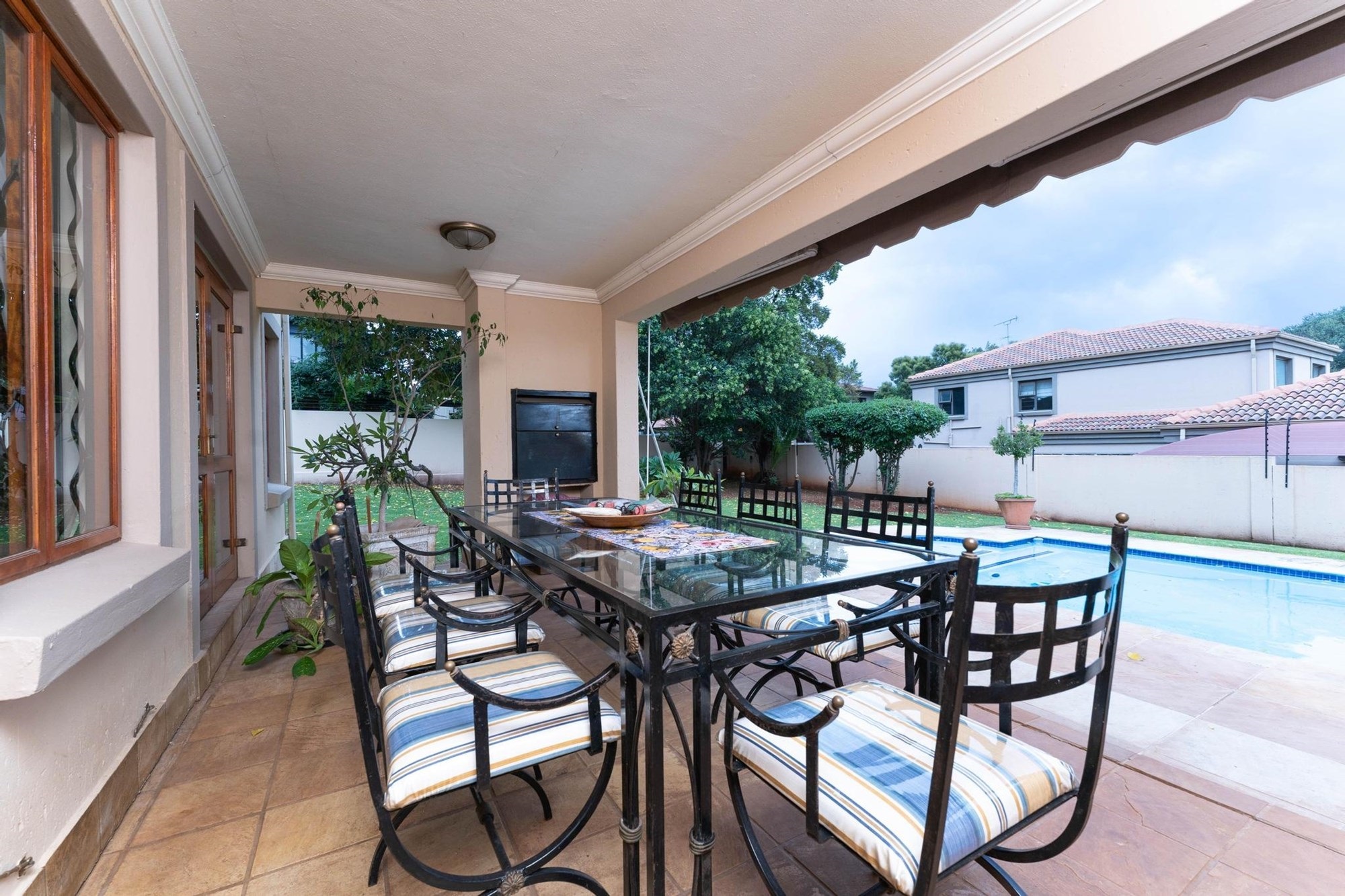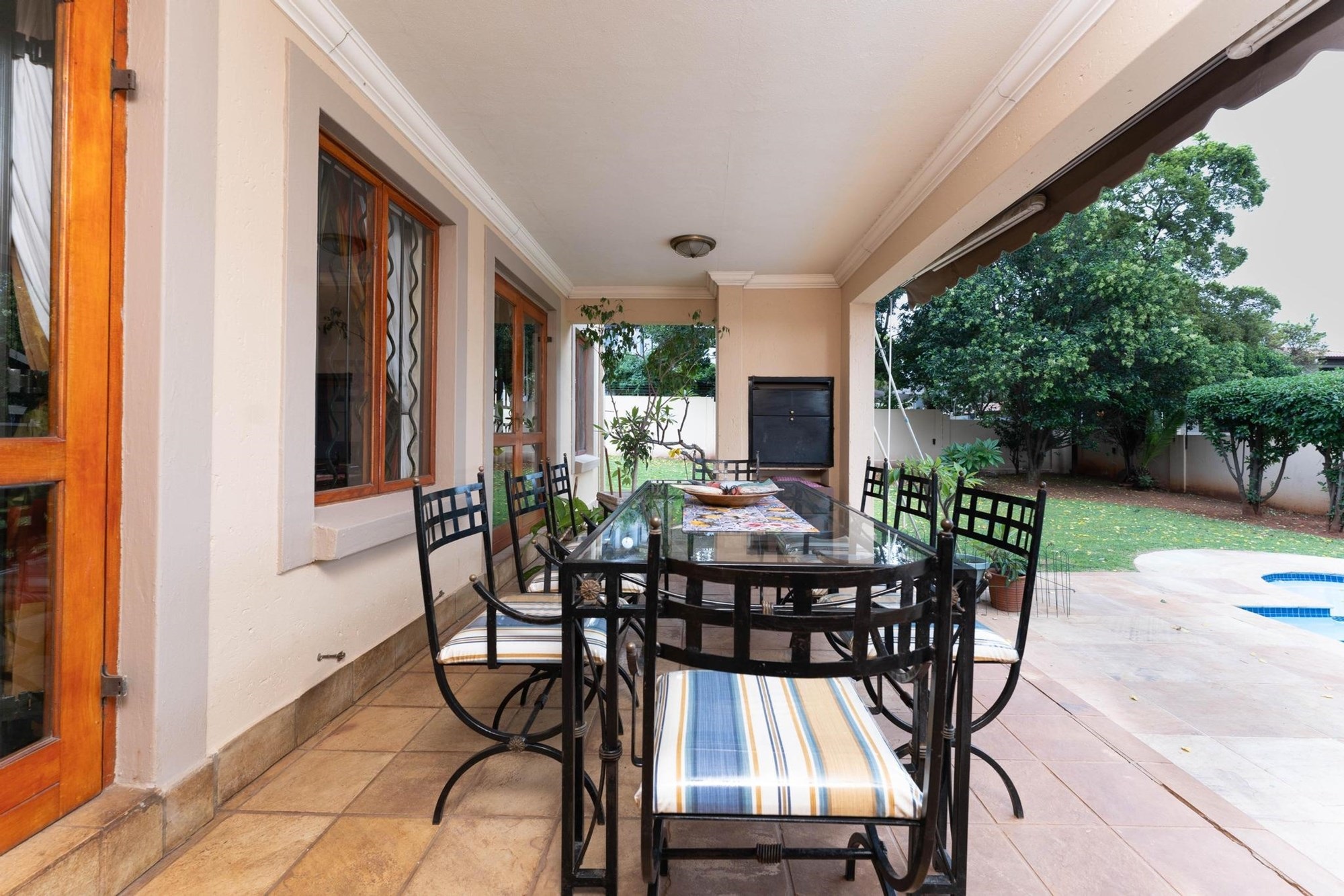The kitchen is a real family sized kitchen, plenty of cupboards in warm oak melamine with black granite counter tops. The electric hob, undercounter oven and stainless steel extractor fan take centre stage with views over the dining table. Perfect for family get togethers. The dining area extends to the outside dining area as soon as the double wooden doors are opened. A covered, tiled patio with views over the expansive lawned garden and a crystal clear swimming pool.