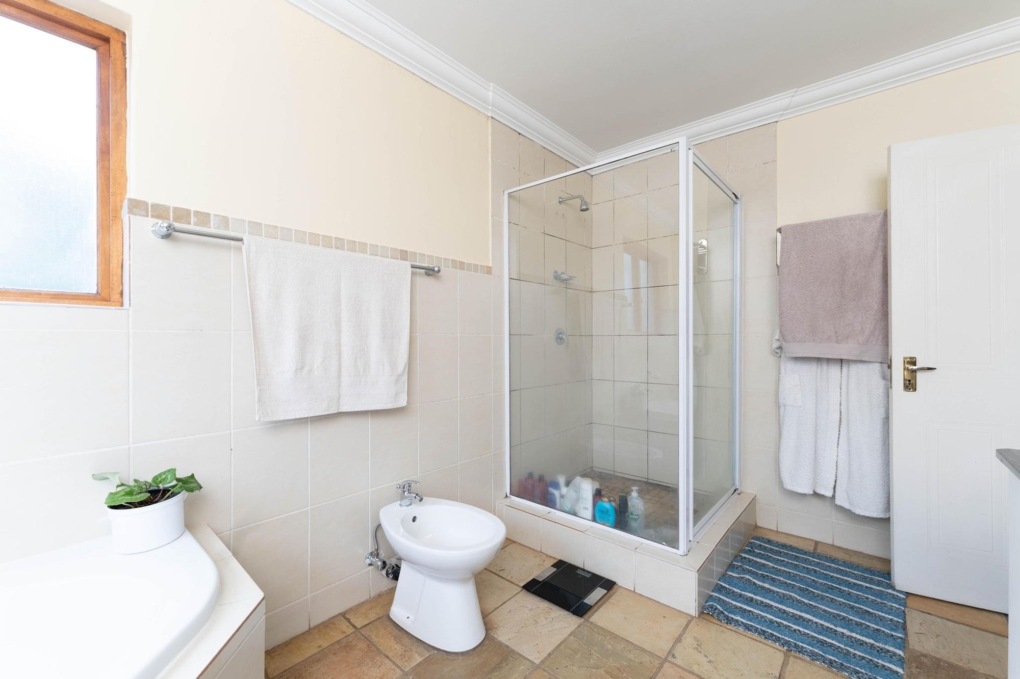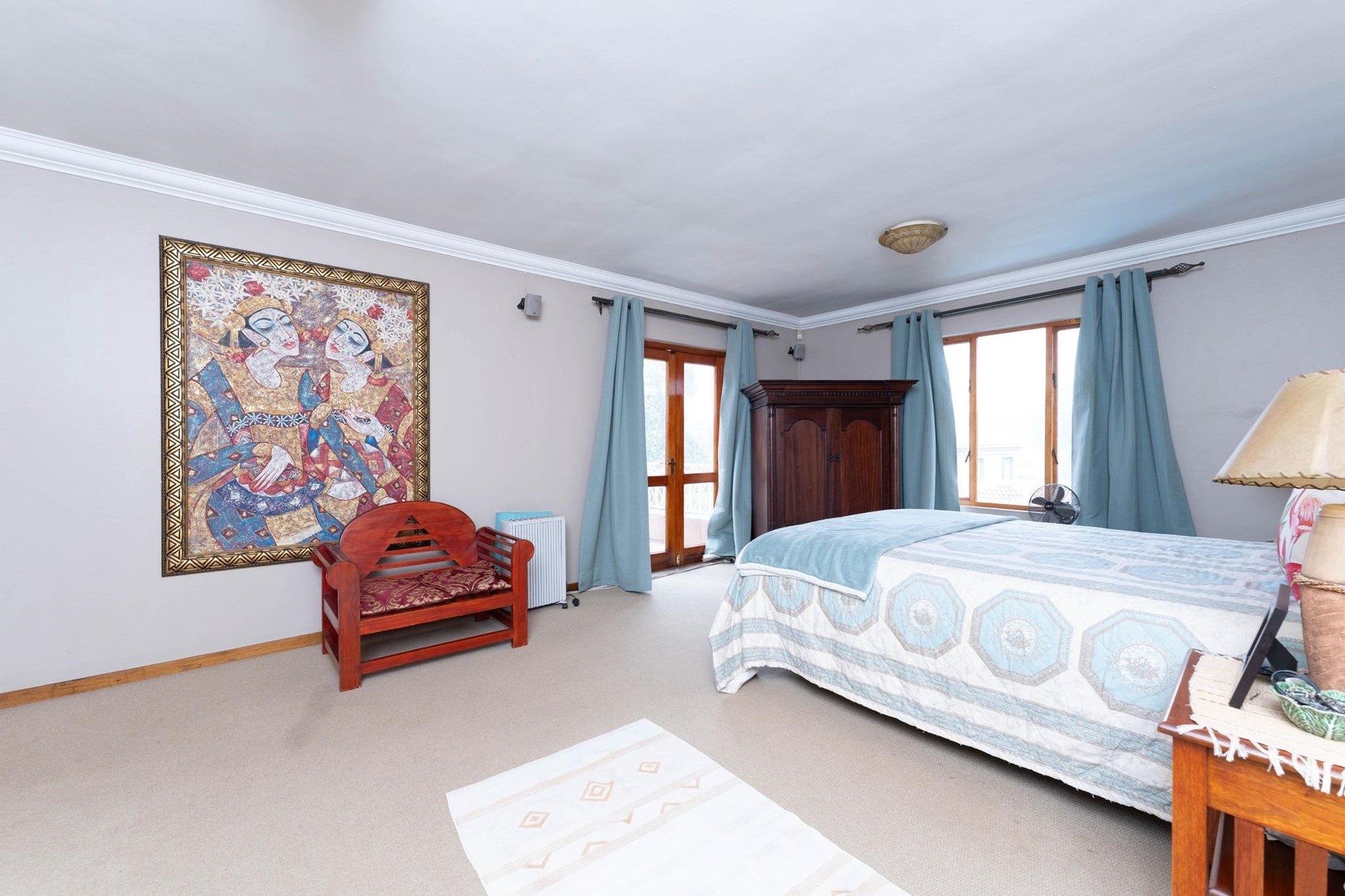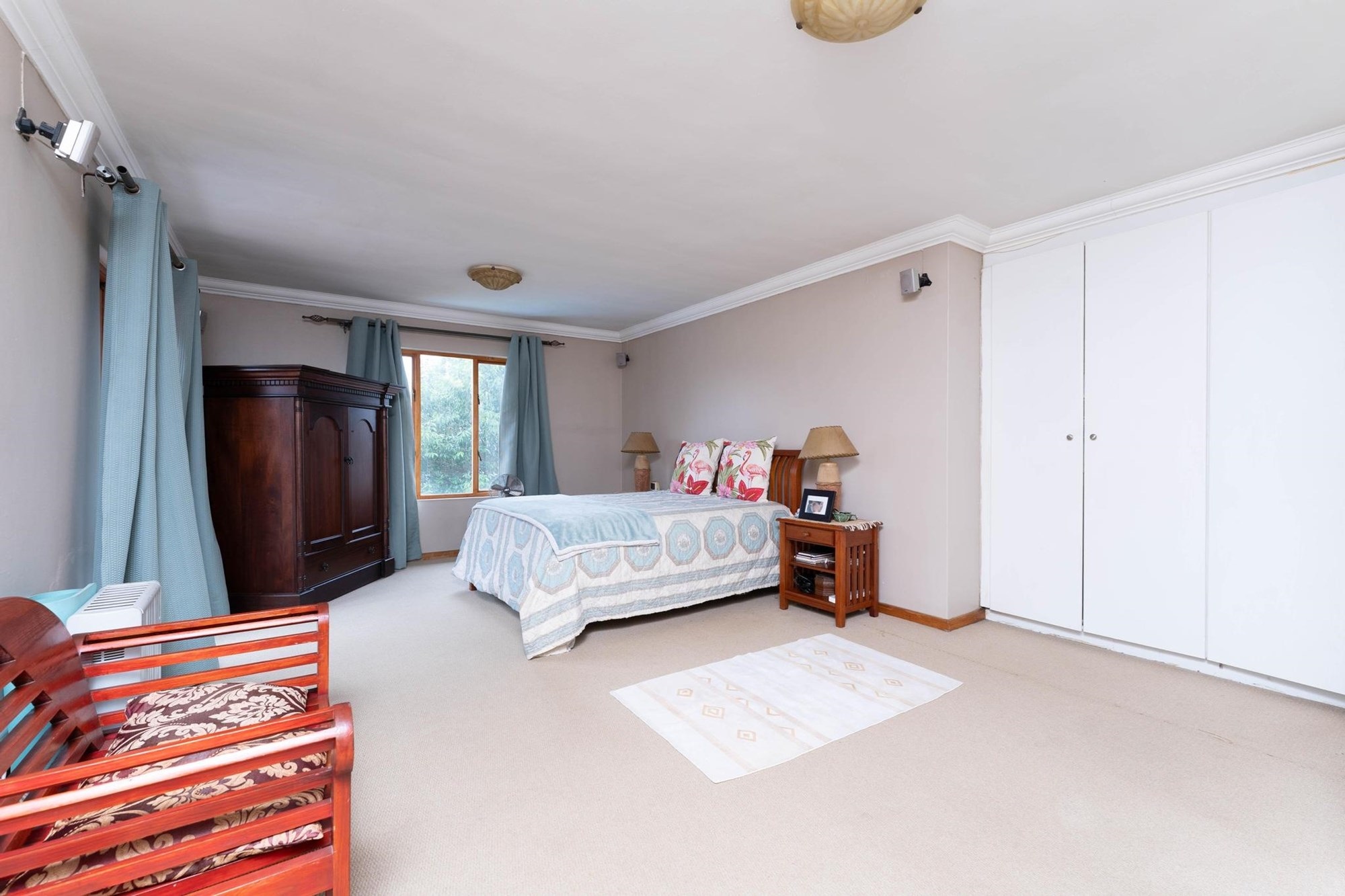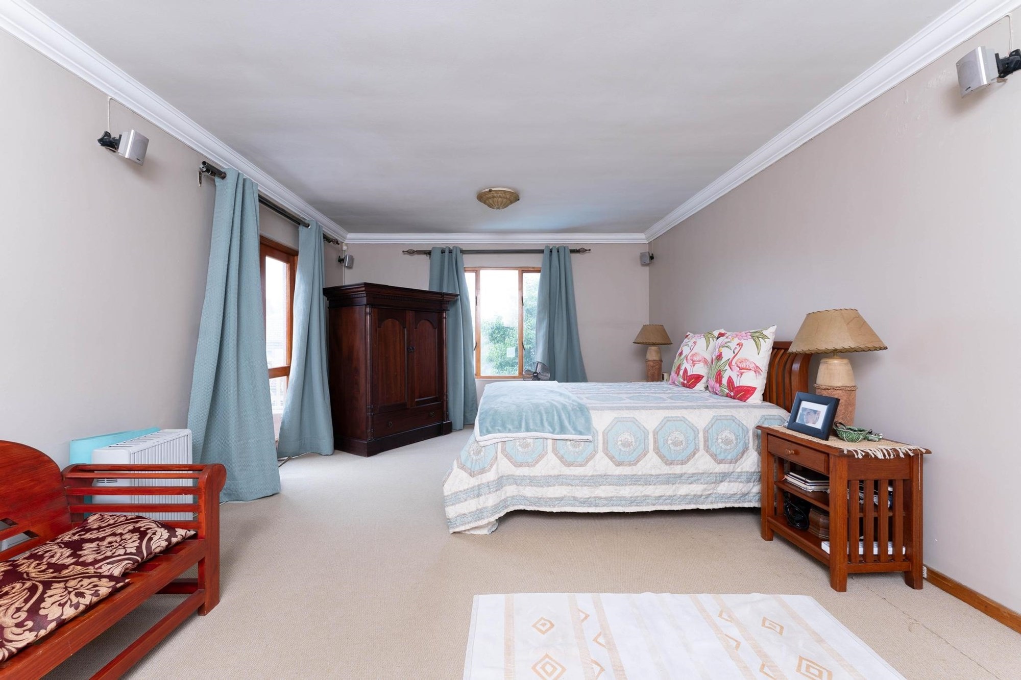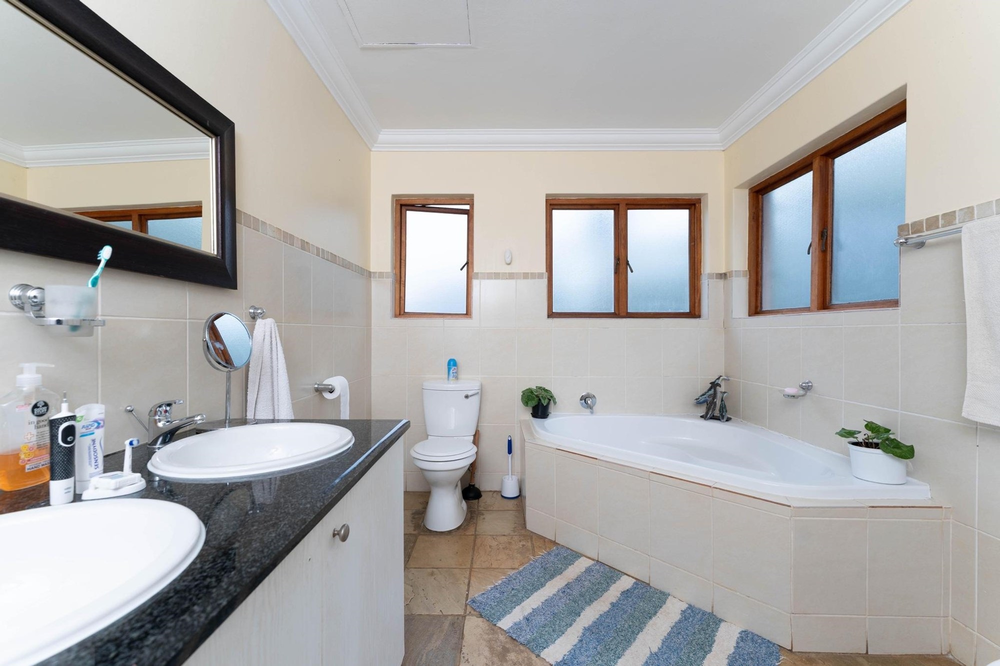 Down the passage an into the master suite. This bedroom is extra large. Space for a king sized bed and lots of additional furniture. Carpeted and comfortable with double wooden doors leading out to the long top verandah. This room also has plenty of built in cupboards in one corner of the room. The main-en-suite bathroom is just as luxurious. Double white basins in a black granite vanity top. A large glass shower and stunning corner bath. Toilet and bidet.