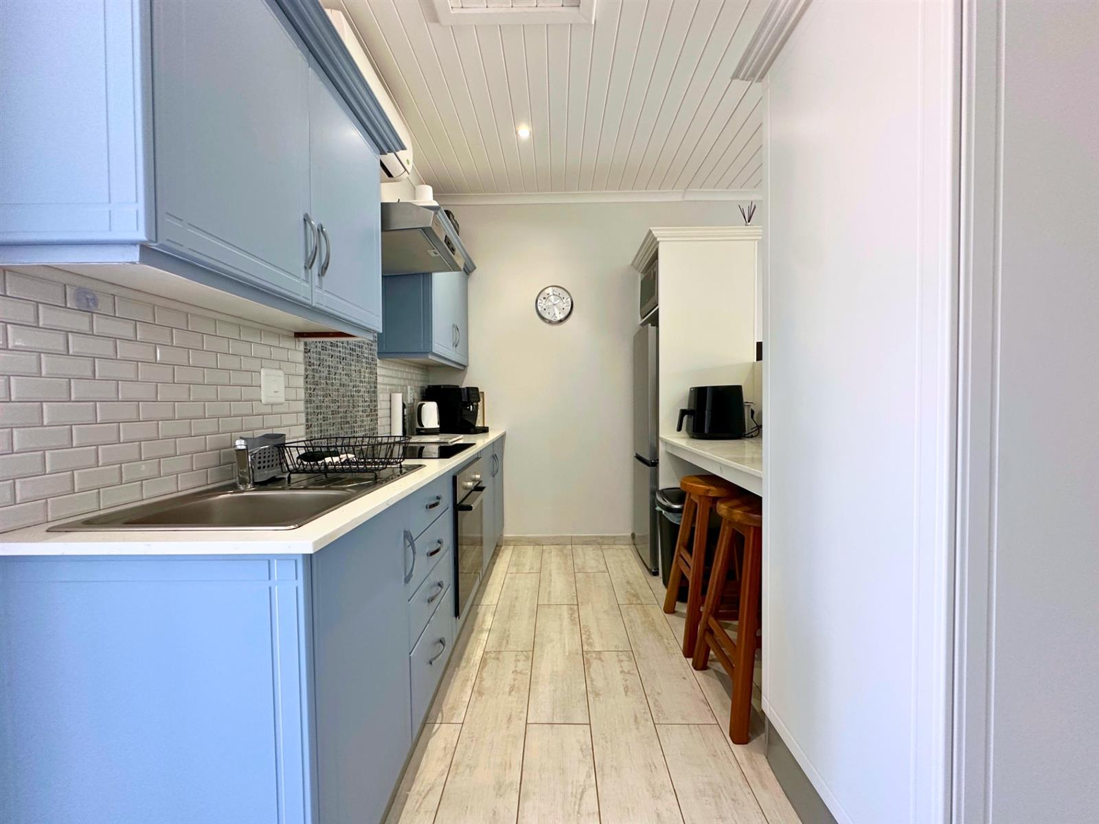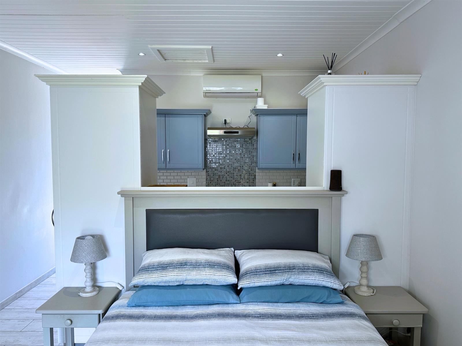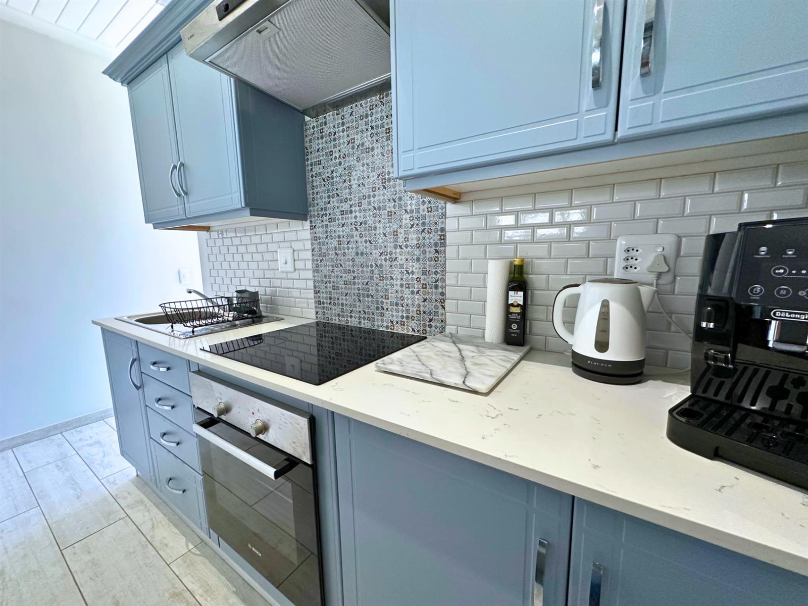 The kitchen is designed for everyday use, not just looks. There’s a four-plate built-in stove, Caesarstone counter-tops, a generous fridge, a microwave oven, and plenty of storage for wine, cheese, and all the things that make life feel complete. A breakfast nook with two bar stools makes mornings feel un-rushed, and a clever cut-out above the bed lets natural light flow through, keeping the space open and easy. Soft blue cupboards, white subway tiles, and playful colourful tiles above the stove add warmth and personality — something cheerful to look at while you wait for the kettle to boil.