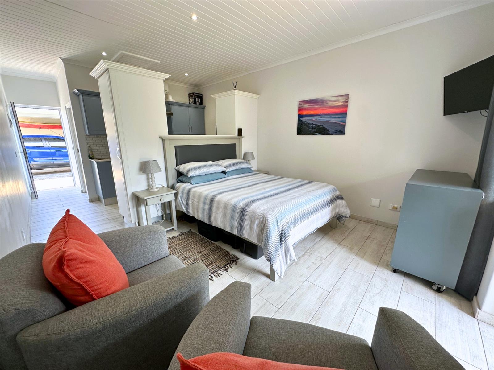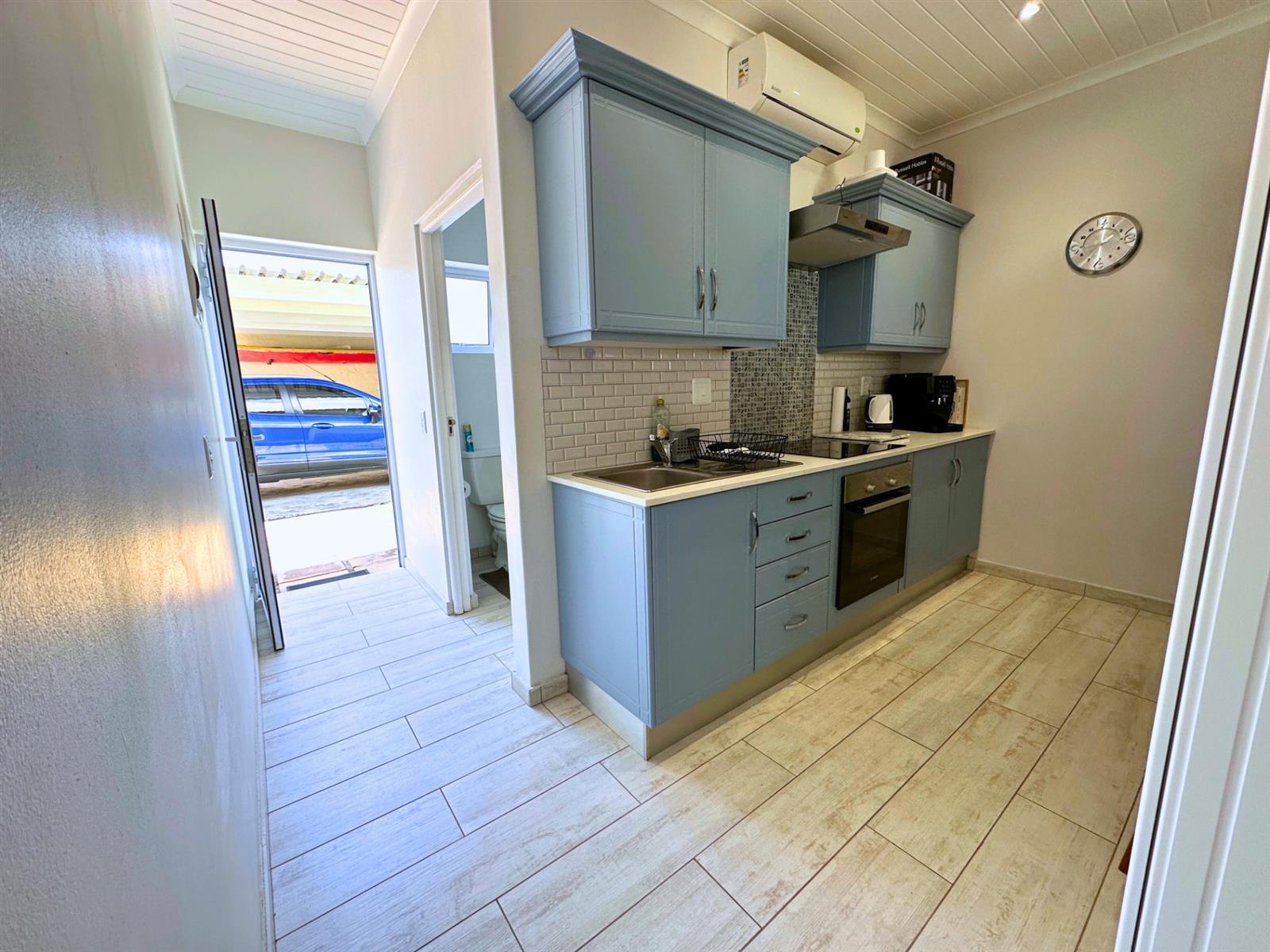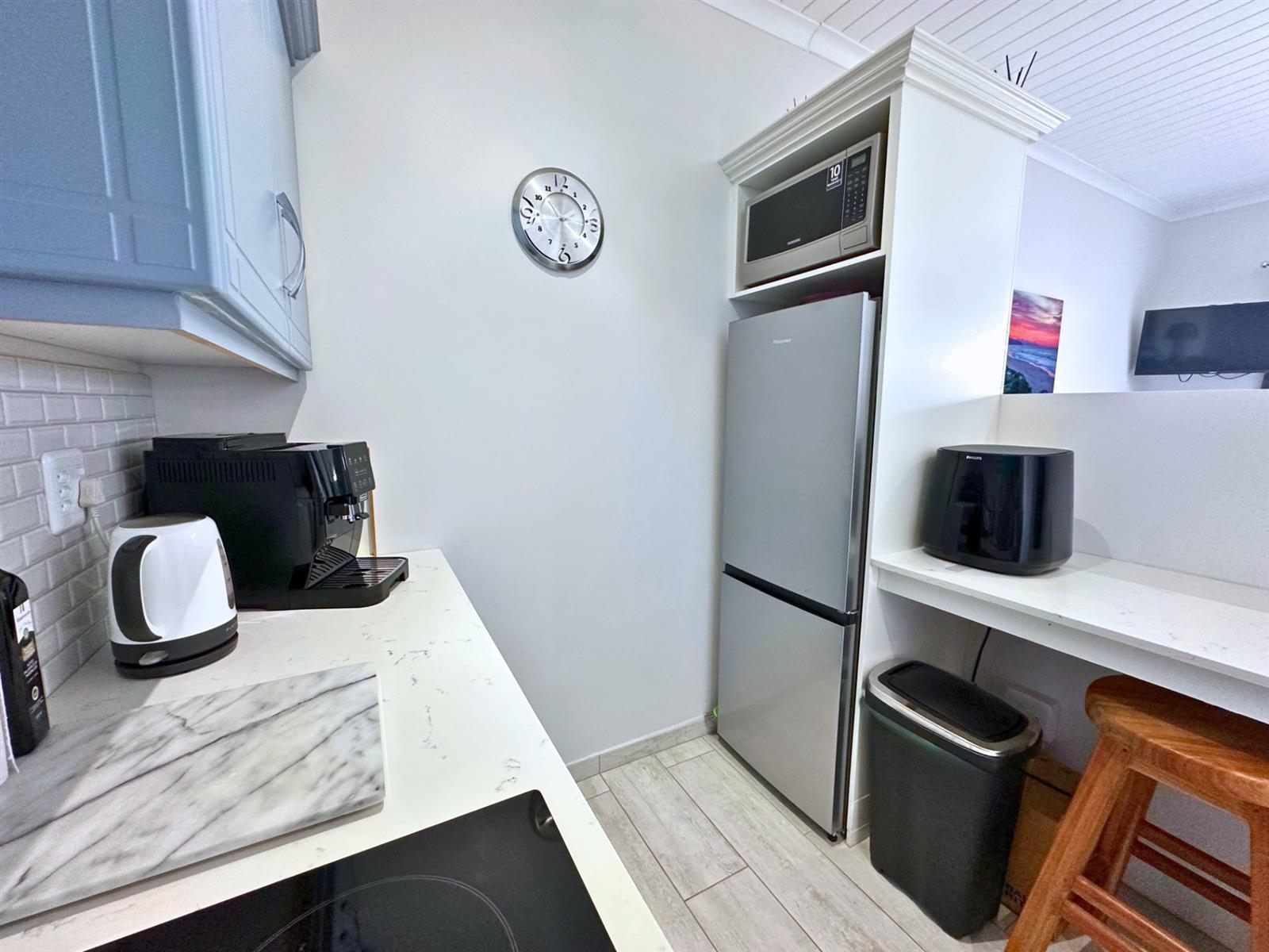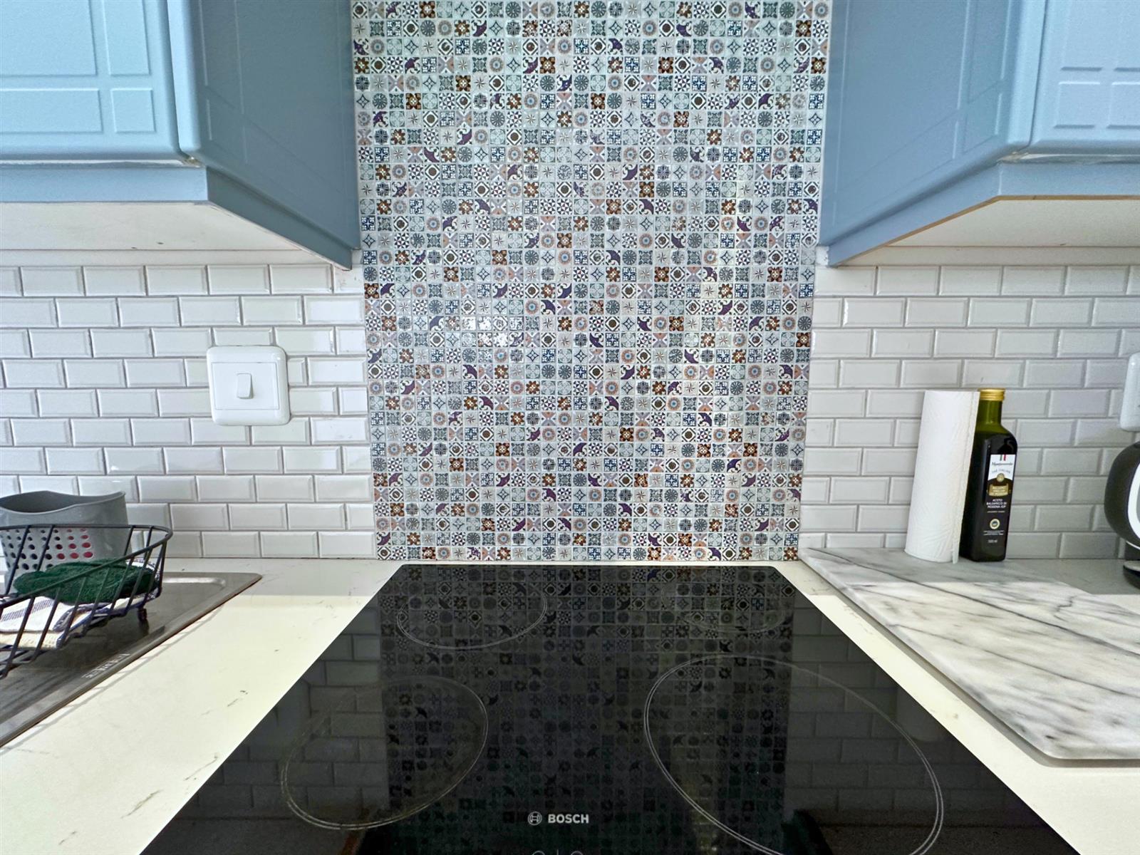 The kitchen is designed for everyday use, not just looks. There’s a four-plate built-in stove, Caesarstone counter-tops, a generous fridge, a microwave oven, and plenty of storage for wine, cheese, and all the things that make life feel complete. A breakfast nook with two bar stools makes mornings feel un-rushed, and a clever cut-out above the bed lets natural light flow through, keeping the space open and easy. Soft blue cupboards, white subway tiles, and playful colourful tiles above the stove add warmth and personality — something cheerful to look at while you wait for the kettle to boil.