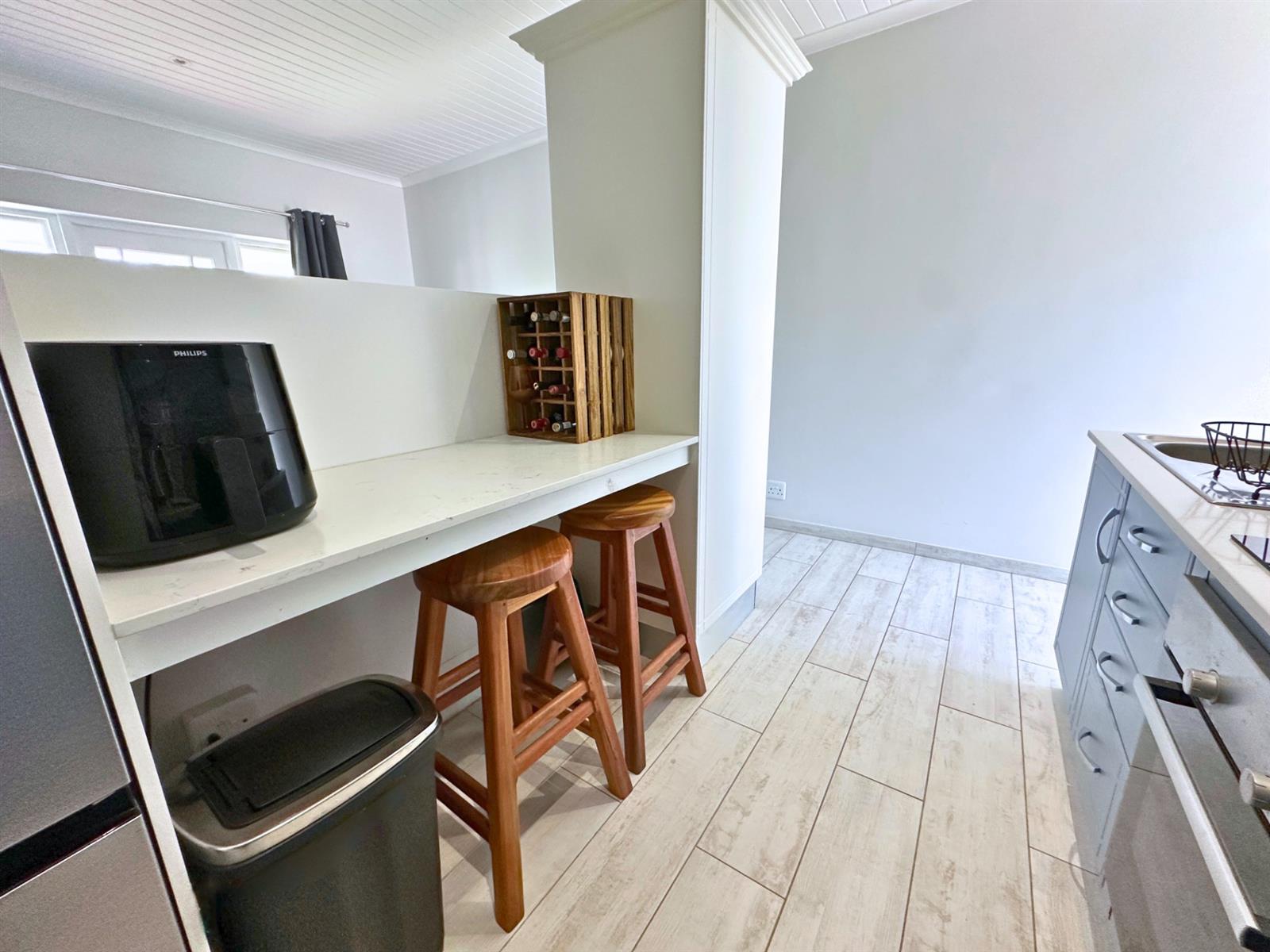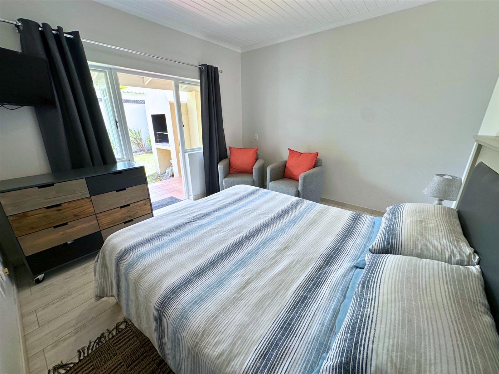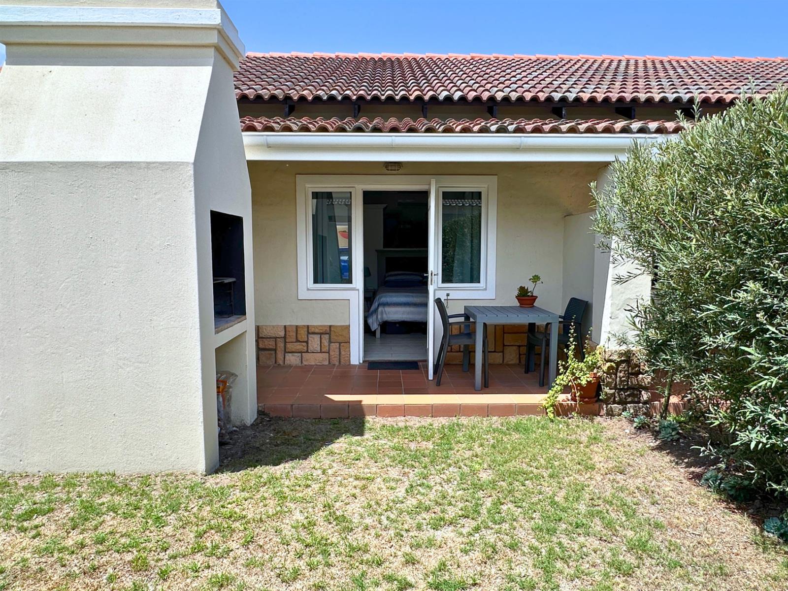 Outside, a small private patio leads you into the garden. There’s a built-in braai with neat wood storage below and a little extra privacy from the neighbouring unit. A two-seater table and chairs make this an easy spot for morning coffee, sunset dinners, or simply sitting still for a bit and watching the vibrant bird life.