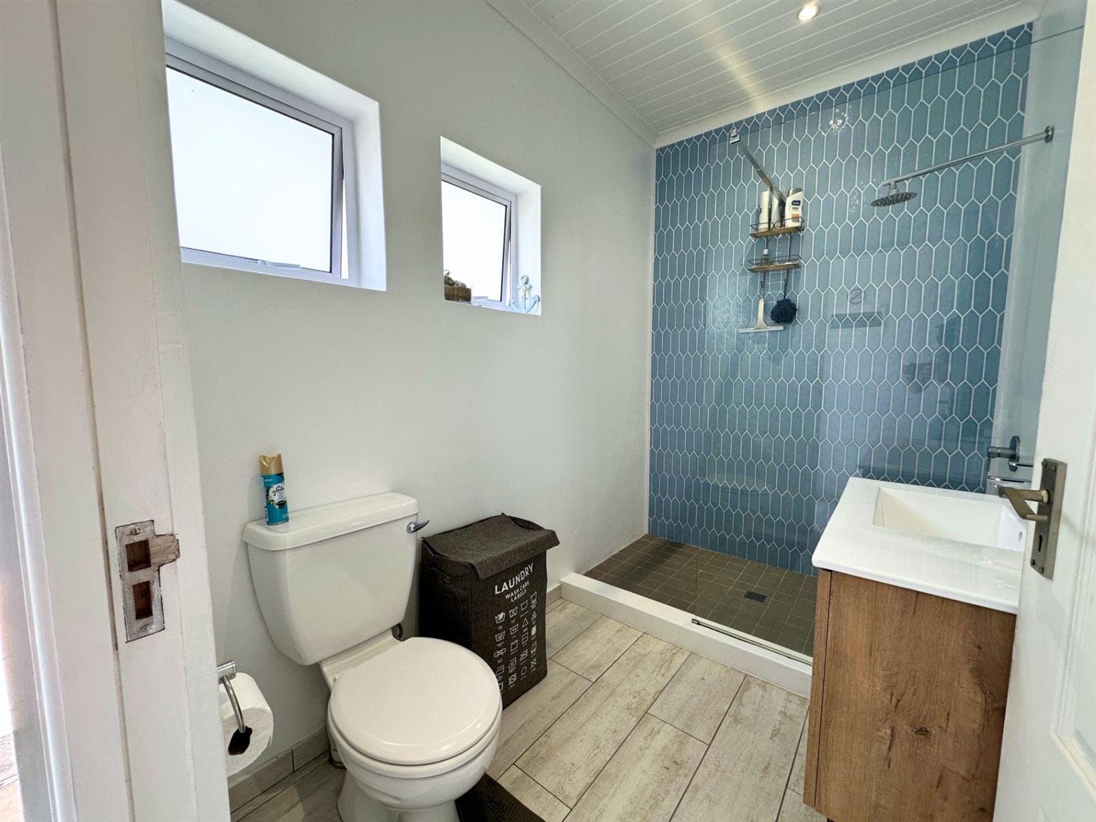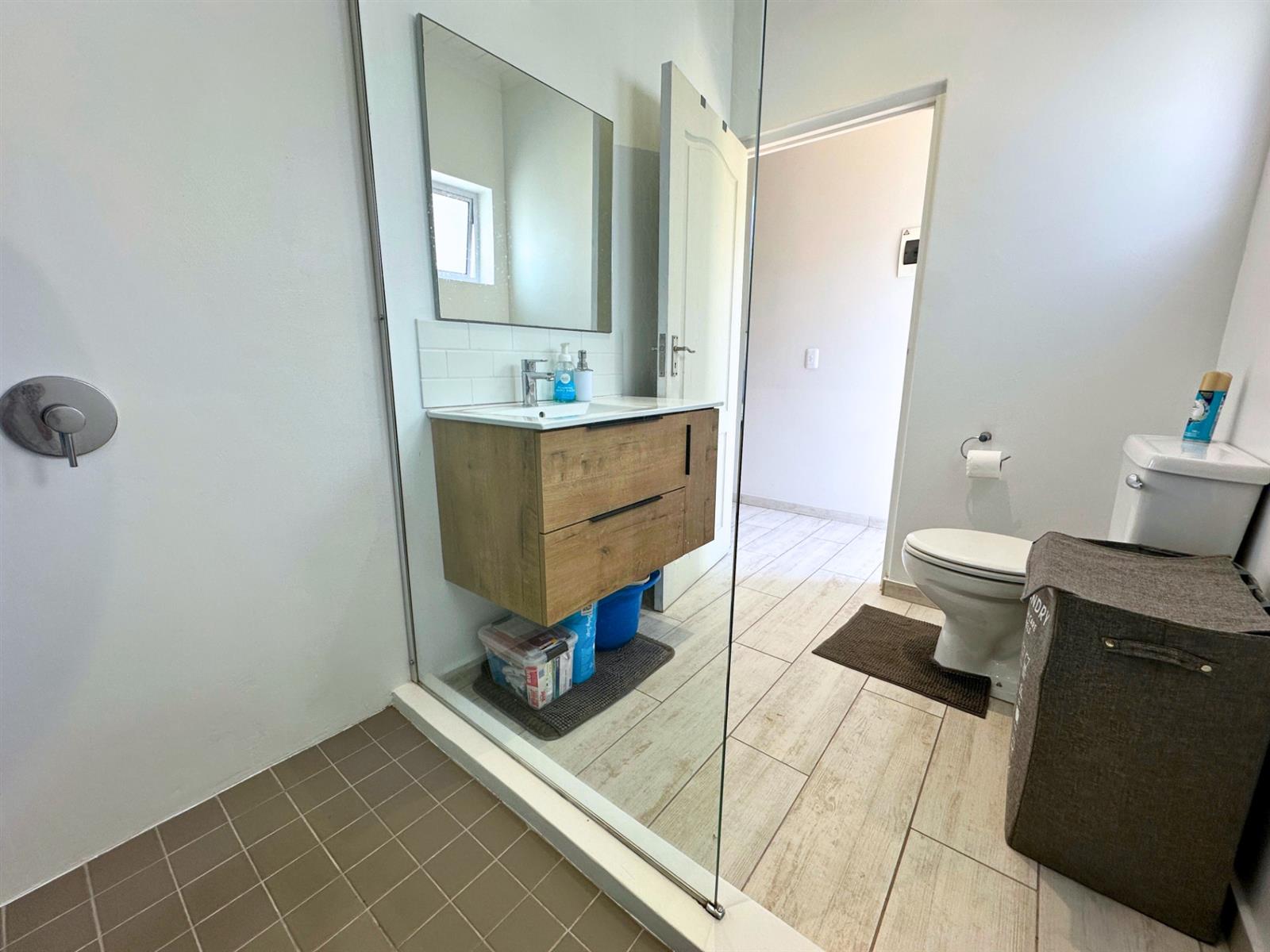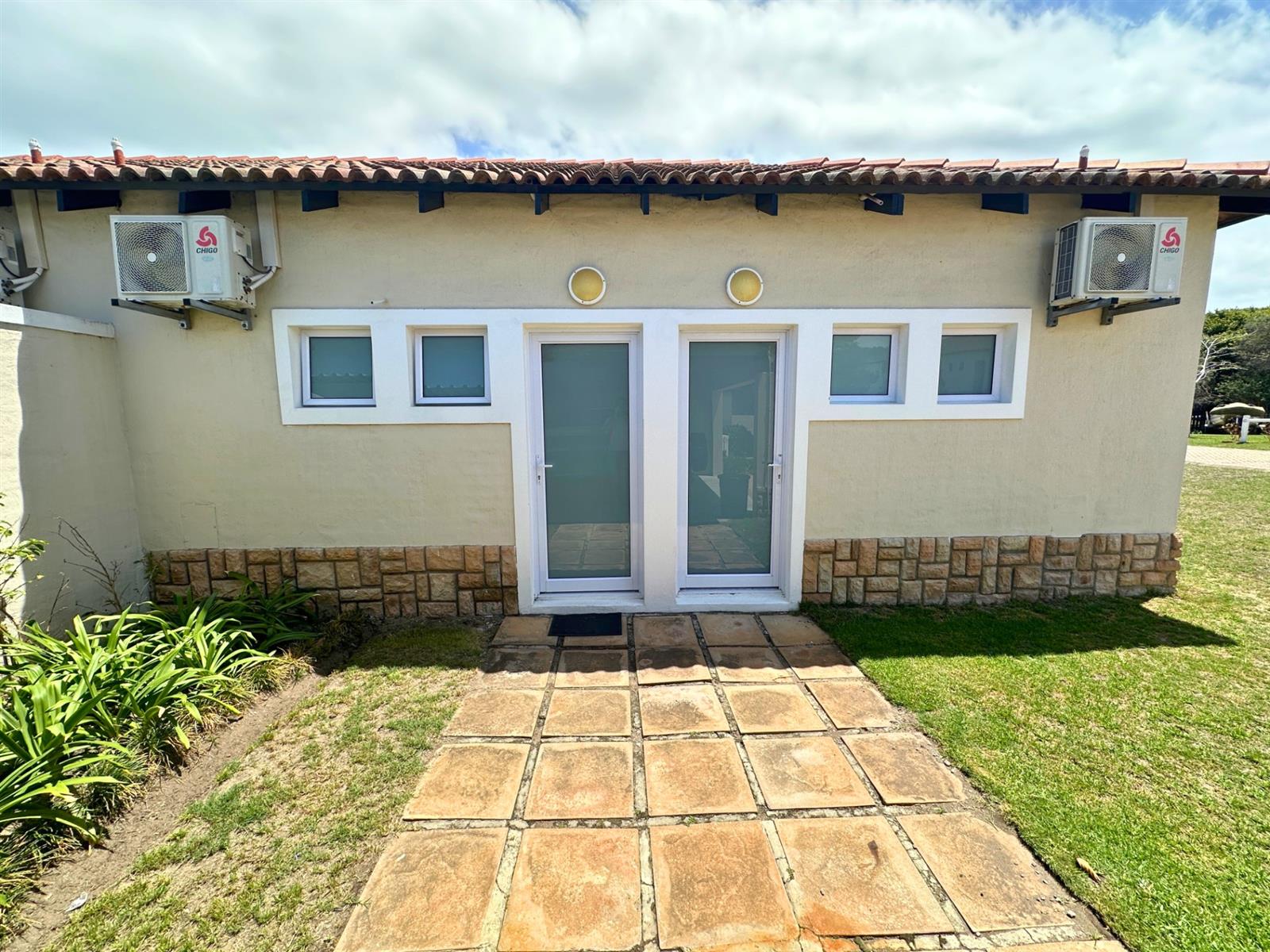 Outside, a small private patio leads you into the garden. There’s a built-in braai with neat wood storage below and a little extra privacy from the neighbouring unit. A two-seater table and chairs make this an easy spot for morning coffee, sunset dinners, or simply sitting still for a bit and watching the vibrant bird life.