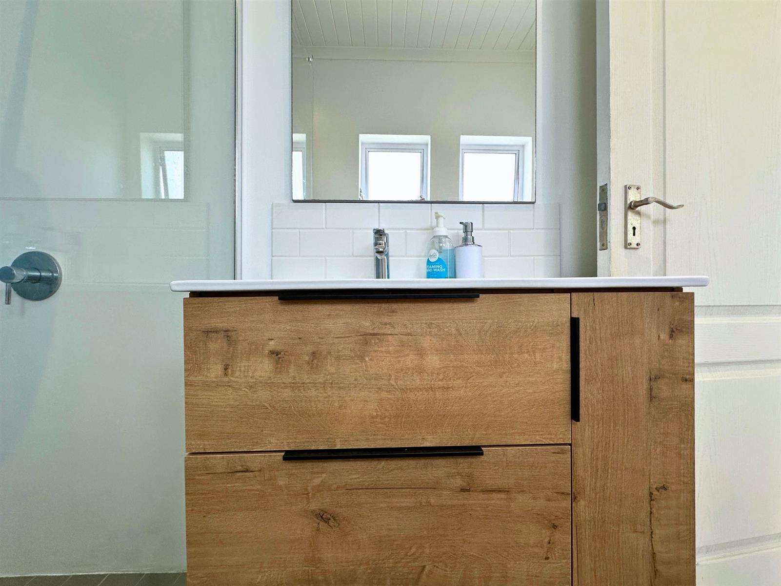 Inside, the studio stays cool thanks to built-in air-conditioning (a real win in recent summers). The bathroom is a calm, cheerful space with a blue tiled accent wall, good natural light, and practical storage. With nothing unnecessary competing for attention, it’s a bathroom that brings clarity to those morning shower thoughts.