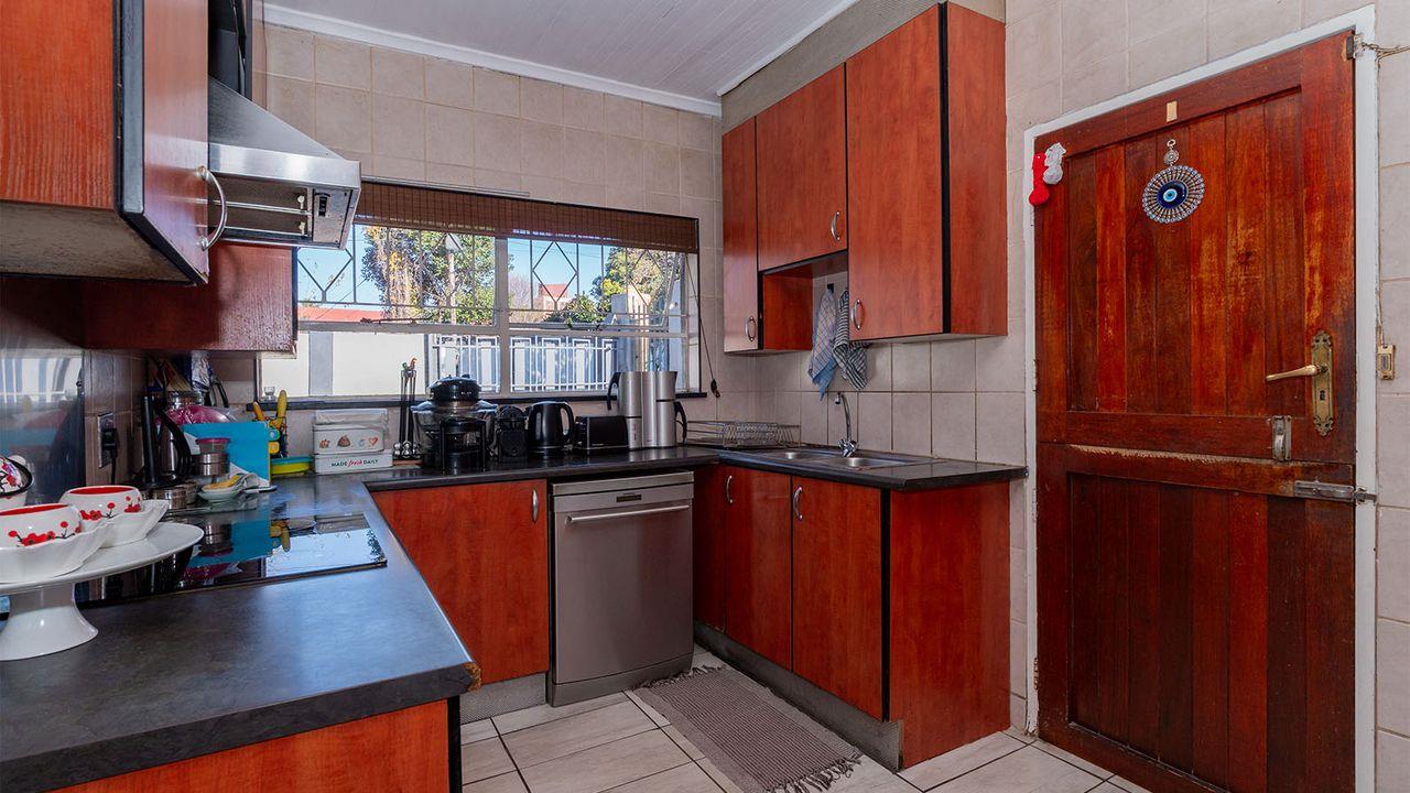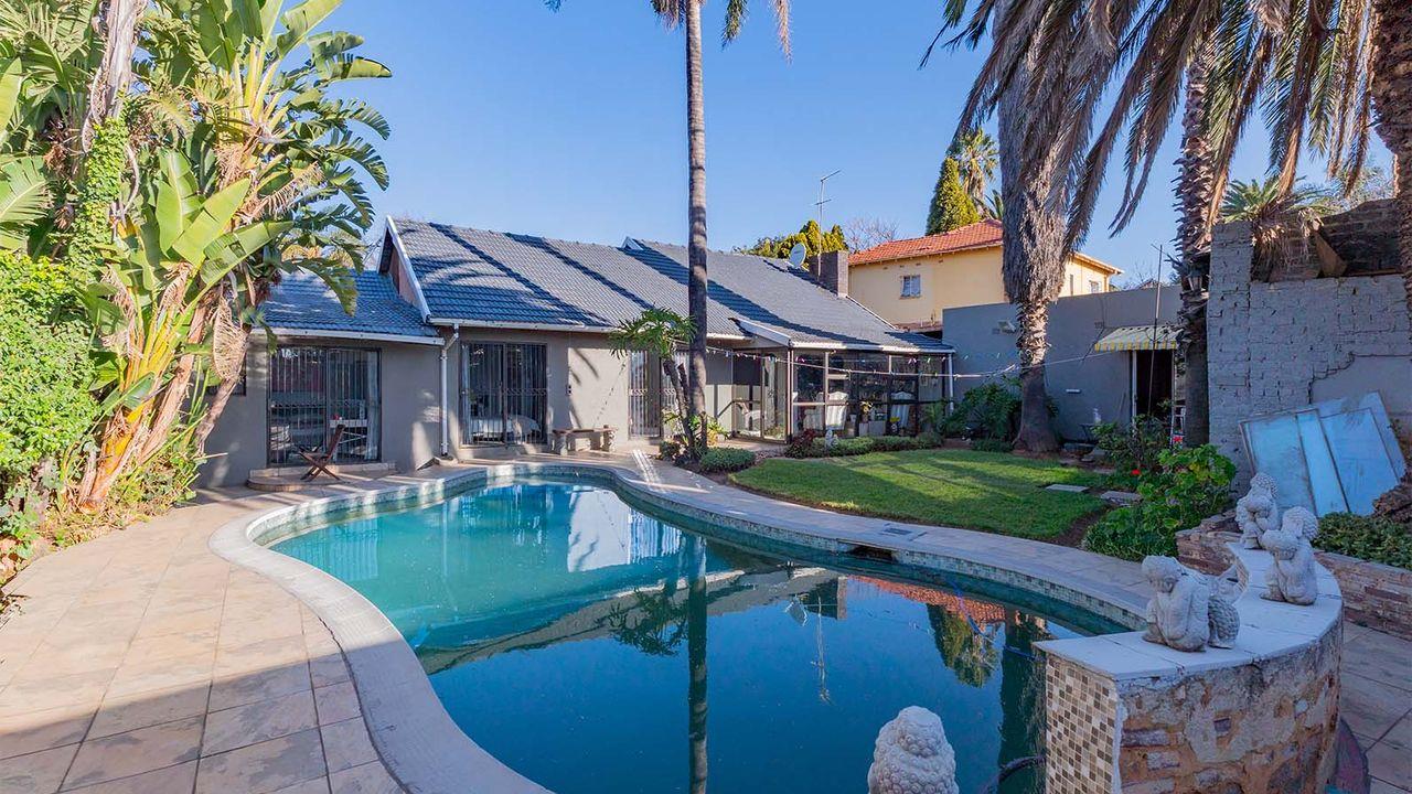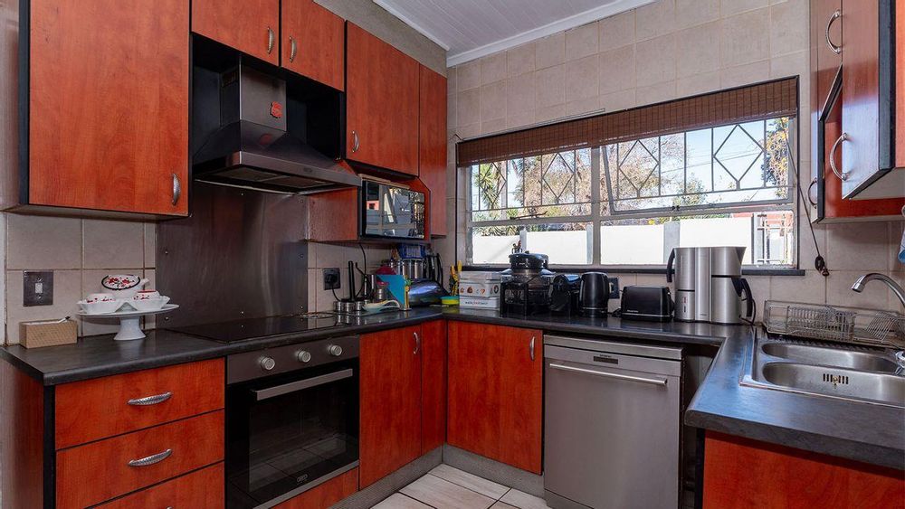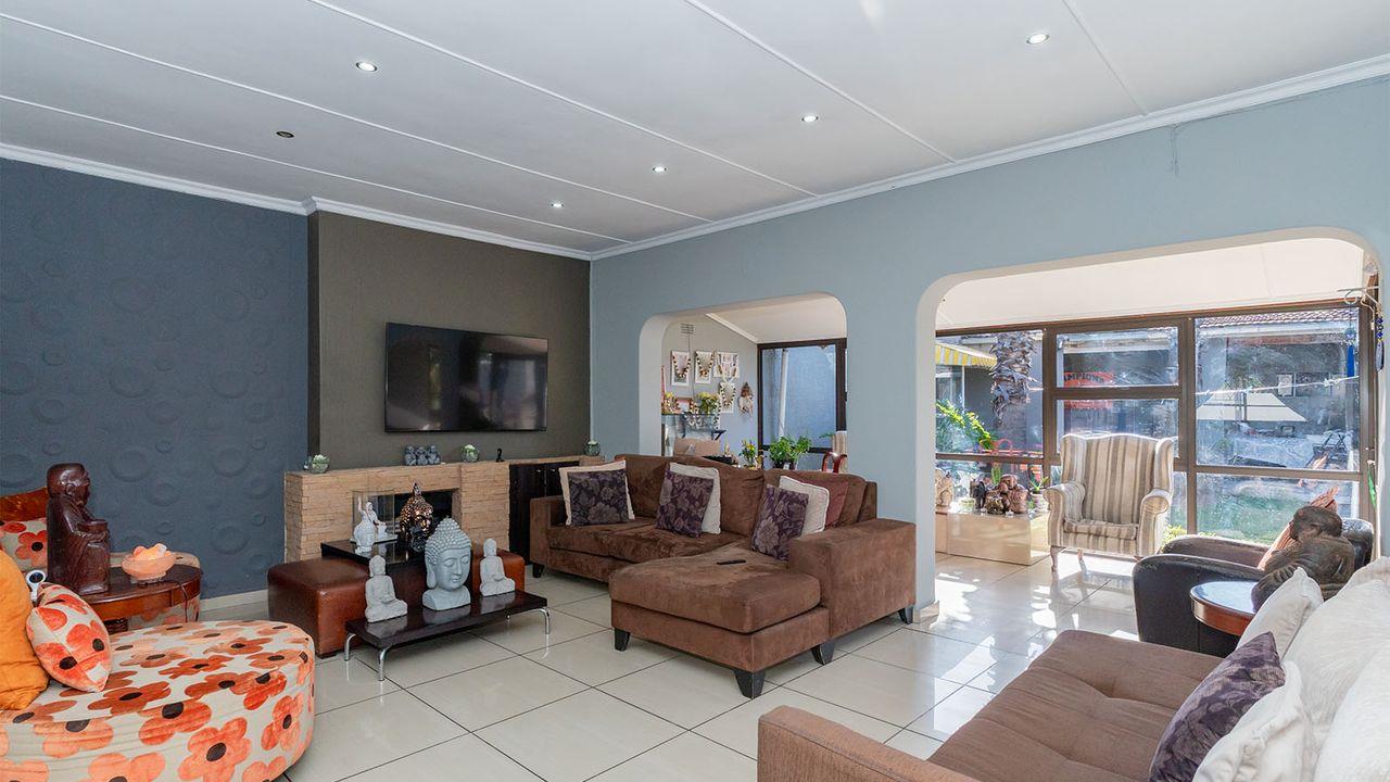 It is fitted with beautiful porcelain floor tiles from the well-kitted kitchen to the open plan lounge with a functional fireplace and dining area, flowing effortlessly to the custom-made sunroom leading out to the garden and entertainment patio with a built-in braai overlooking the blue swimming pool. This is an entertainer's dream house indeed, ready to host guests all year round.