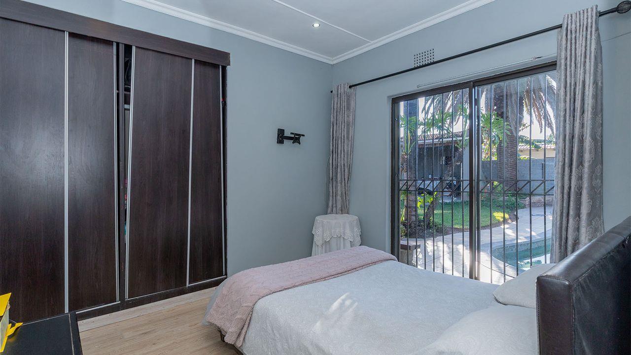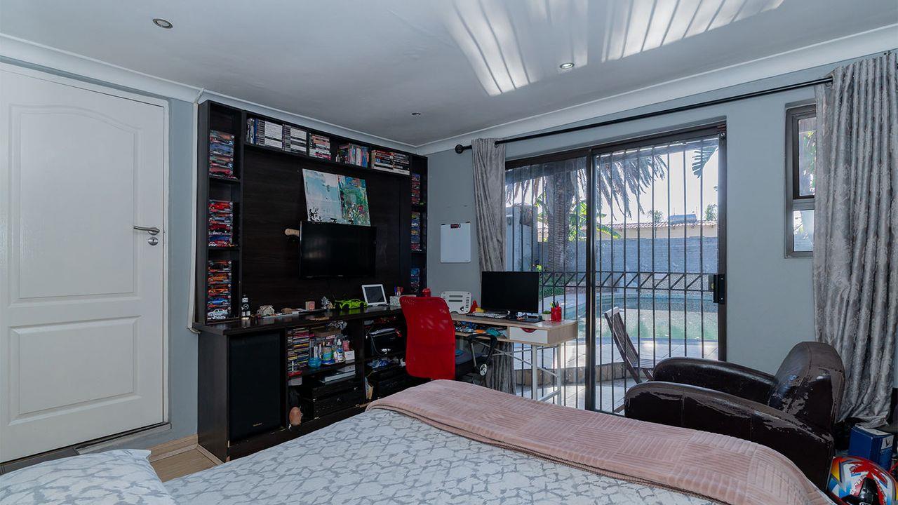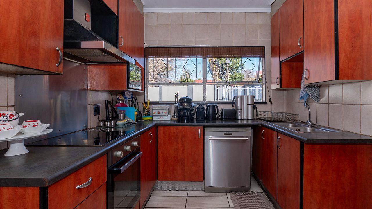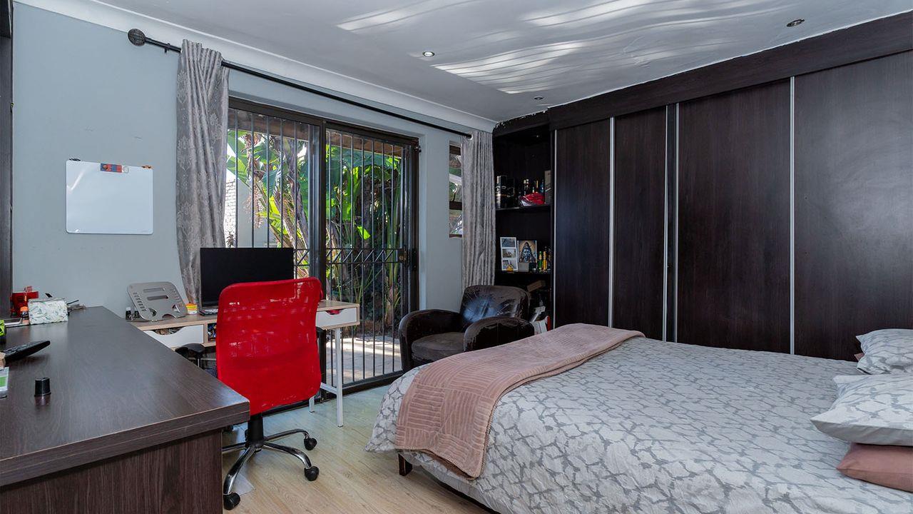 It is fitted with beautiful porcelain floor tiles from the well-kitted kitchen to the open plan lounge with a functional fireplace and dining area, flowing effortlessly to the custom-made sunroom leading out to the garden and entertainment patio with a built-in braai overlooking the blue swimming pool. This is an entertainer's dream house indeed, ready to host guests all year round.
